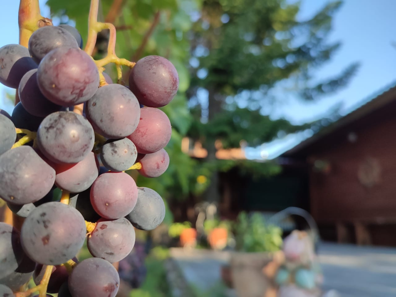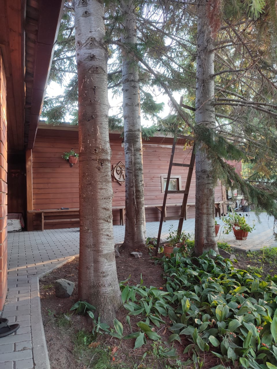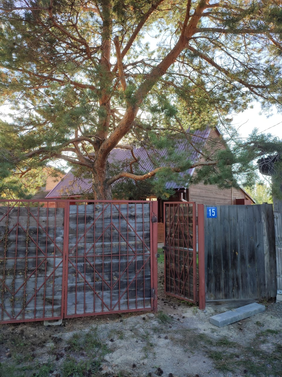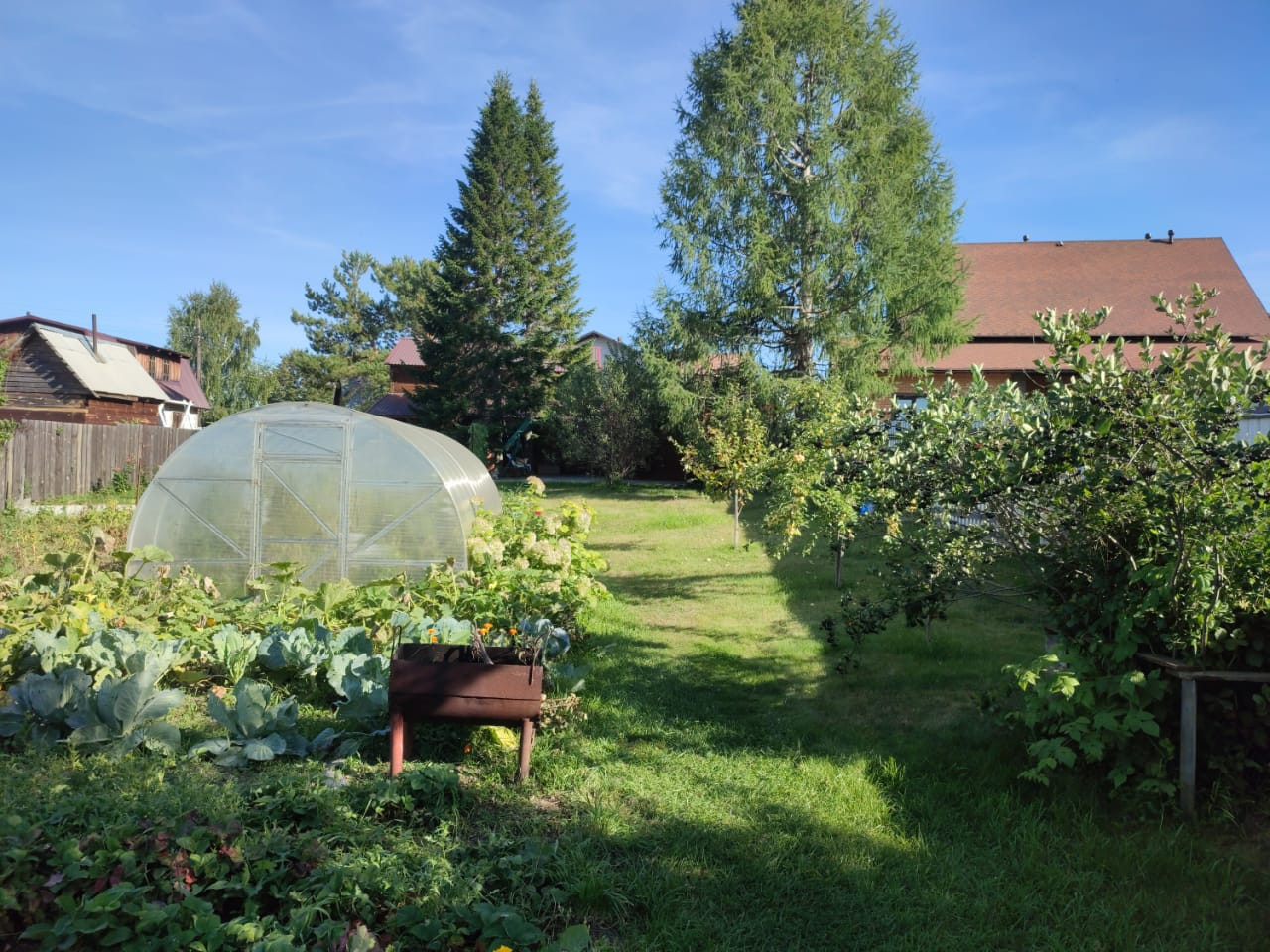На участке растут пять взрослых хвойных деревьев и дуб-подросток. Есть теплица. Все посадки. Жимолость, вишня, смородина, яблони, малина, клубника, виноград и слива.