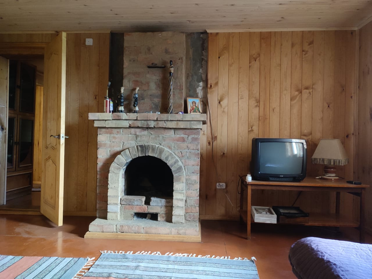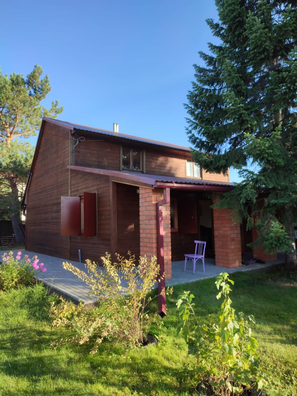 Дом кирпичный, утеплённый. Крыша покрыта металлопрофилем. Свежий ремонт. Внутренняя отделка - сосновый штиль. Печное отопление, камин. Просторный второй этаж и огромная застеклённая веранда 8×3 м. Перед домом расположен большой навес для пикников в дождливую погоду. Для солнечных дней предусмотрено просторное патио с новой тротуарной плиткой.