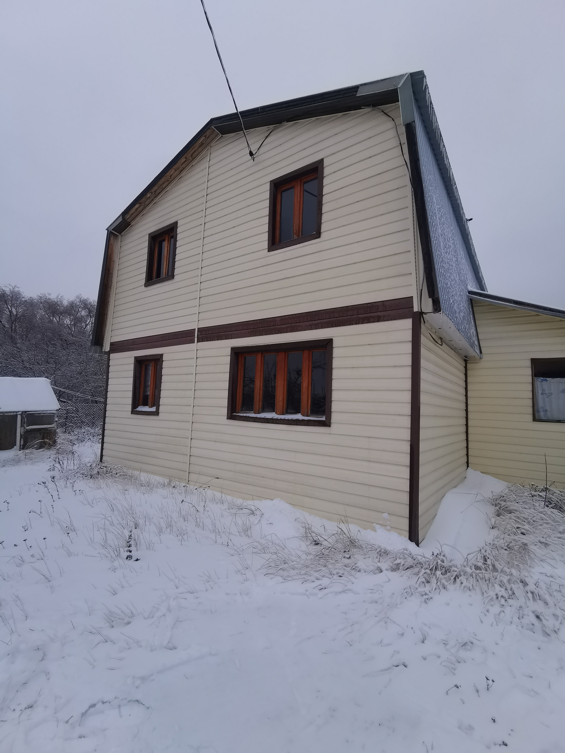 Площадь дома 96 кв. м. на земельном участке 8 соток. Дом из бруса, утеплен и обшит сайдингом. В доме 4 жилые комнаты, просторная веранда, деревянная лестница, санузел совмещённый, произведён ремонт, проведена разводка водоснабжения и электричества. Фундамент ленточный заливной.