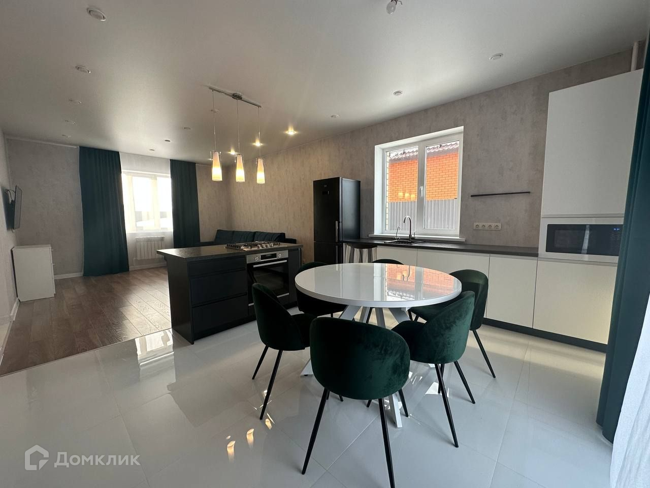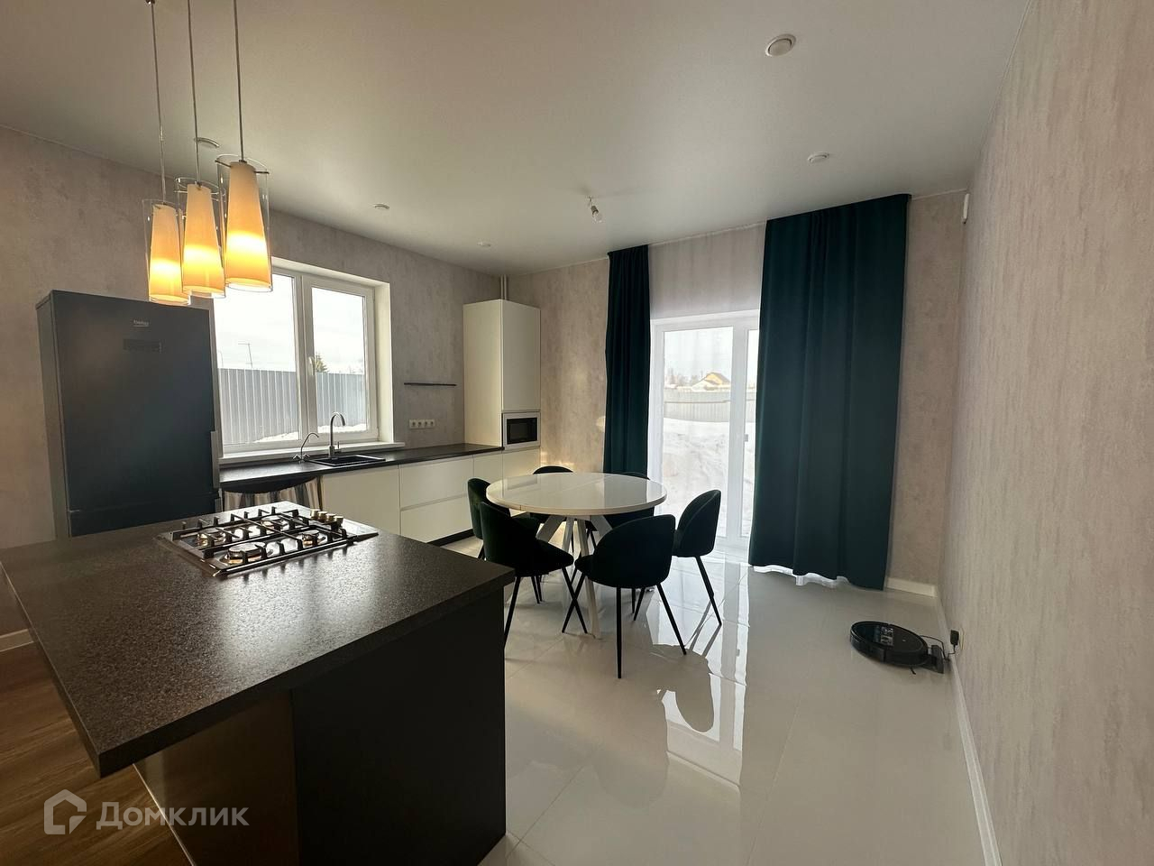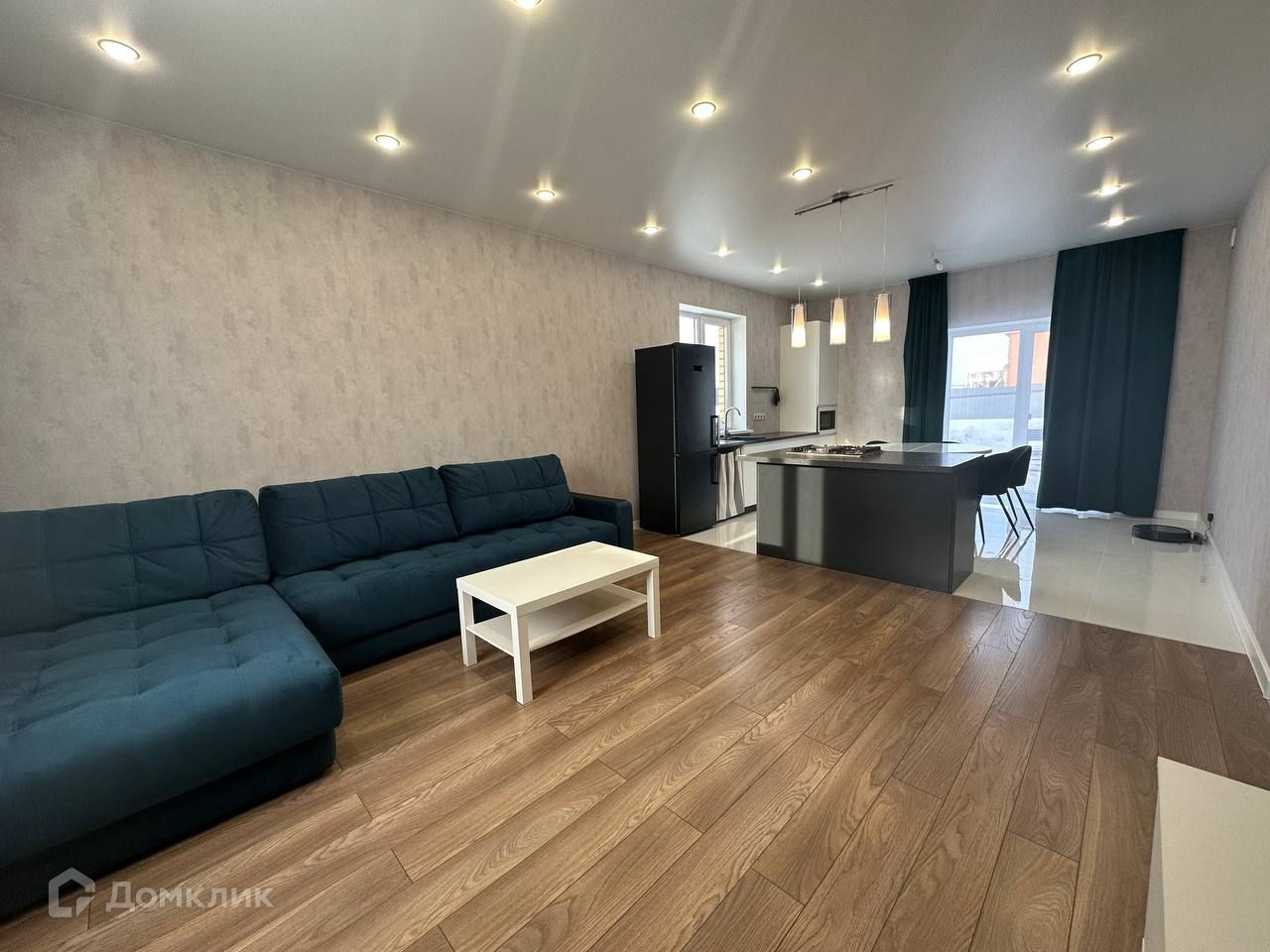 Прихожая+коридор, санузел совмещенный, под лестницей хоз.помещение, кухня-гостиная, в кухонной зоне размещен остров со встроенной газовой панелью LG и духовой шкаф BOSH, двухконтурный котел BOSH, установлен фильтр для питьевой воды, на полу в прихожей и кухонной зоне керамогр.плитка, в гостиной на полу ламинат, точечное освещение, увеличенный проем с выходом на террасу. По всему первому этажу теплые полы.