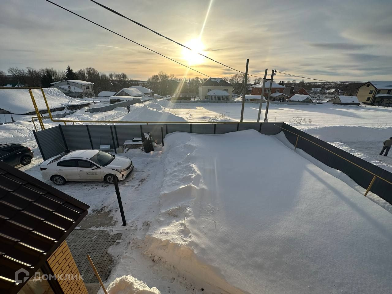 Забор по всему периметру участка, откатные ворота с усиленным фундаментом, бетонная площадка под парковку двух автомобилей, установлены столбы под навес, участок угловой, минимум соседей.