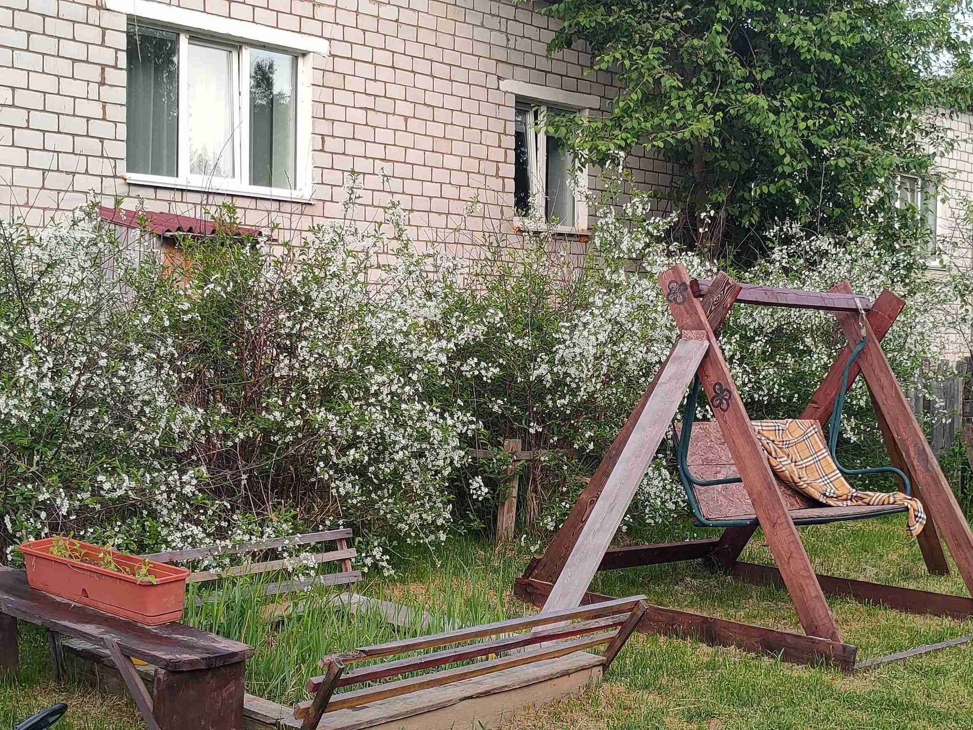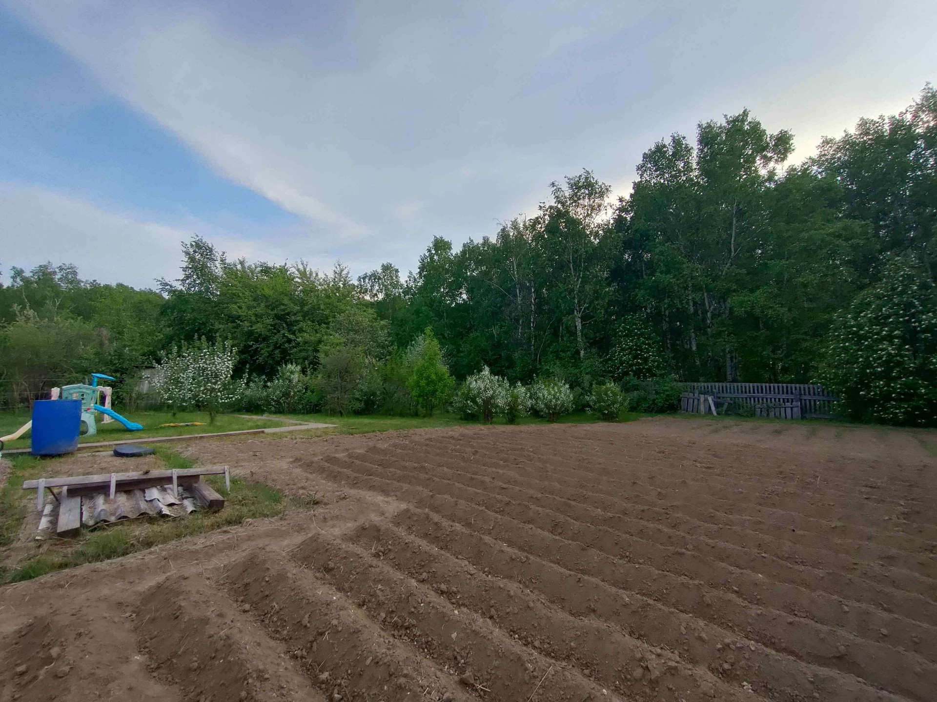 Квартира в двухквартирном доме. В тихом месте. Участок 13 соток. За участком березовая роща и выход к реке. Участок ухожен. Имеются теплица, грядки. Большой плодоносящий сад - яблони, груша, сливы, жимолость, смородина, черемуха, вишня, облепиха, малина. Ёмкость для полива. Детская площадка с  горками и местом под бассейн. Большая беседка с печью и мангалом. Также имеется баня, гараж на две машины на мансарде которого комната отдыха с тренажёрами. Дровяник. Двор забетонирован. В квартире большая веранда, зал 23 кв м, кухня 14 кв м, две спальни 23 и 12,5 кв м. Санузел совмещён.  Отопление дровяное и электрокотел. Скважина. Септик переливной. Мебель остаётся по договоренности. Теплые полы в зале и спальнях. Подполье 18 кв. м.