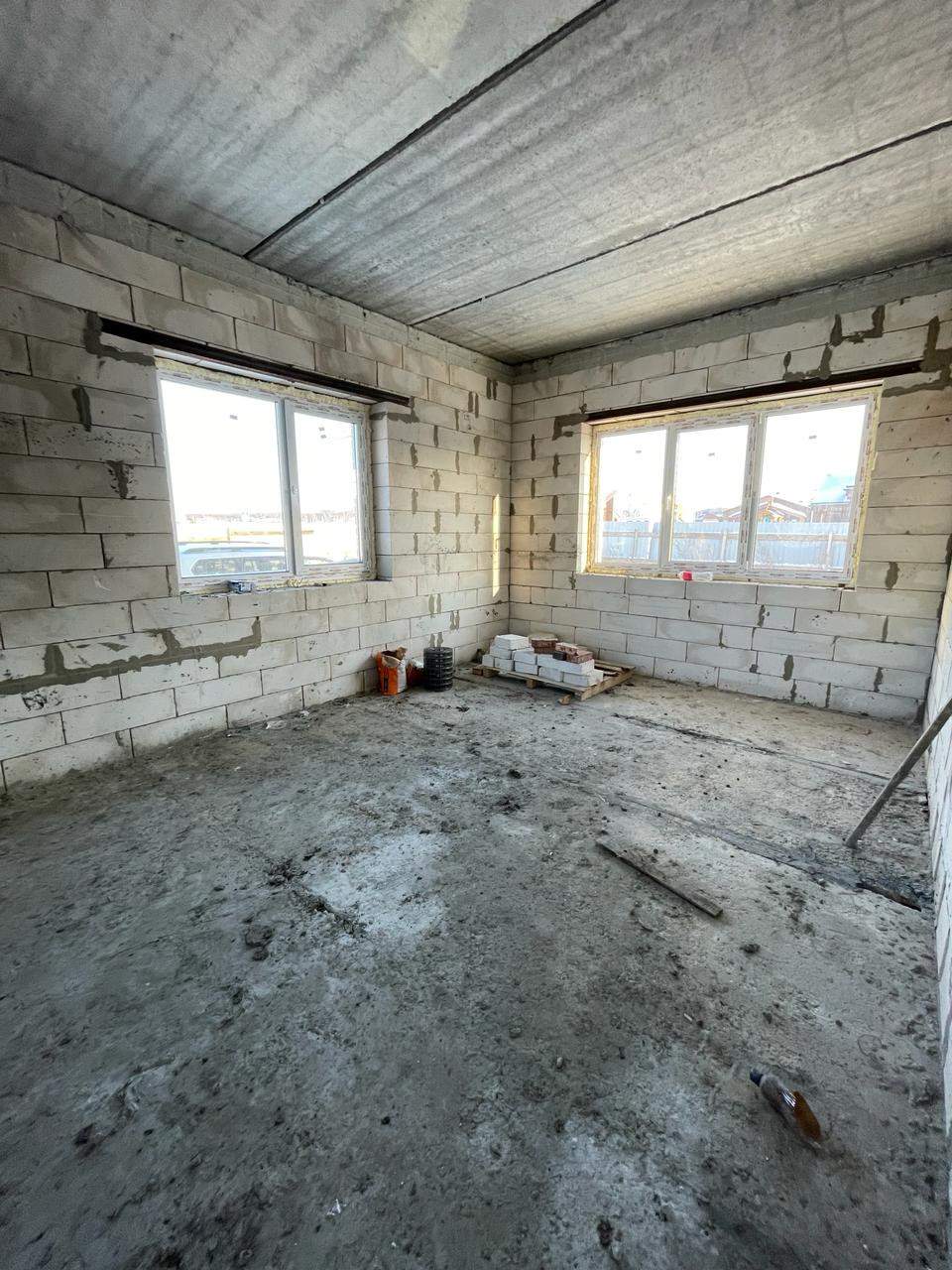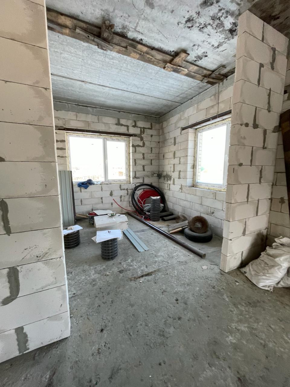 Фундамент свайно ростверковый, армированный пояс усиленный, бетон марки М300 шириной 600 мм, цоколь дома поднят керамическим кирпичем. Перекрытия пола первого и второго этажа- новые пустотные железобетонные плиты, есть техподполье. Стены дома 50 см: автоклавный газобетонный блок Д500, облицовочный керамический кирпич. Кровля: металлочерепица 0.5, утепление 200 мм. Сделана бетонная межэтажная лестница.
