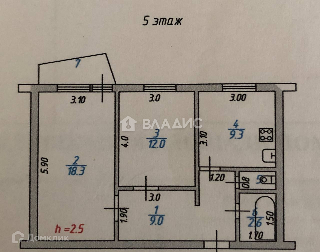 Высота потолков: 2.5 м.