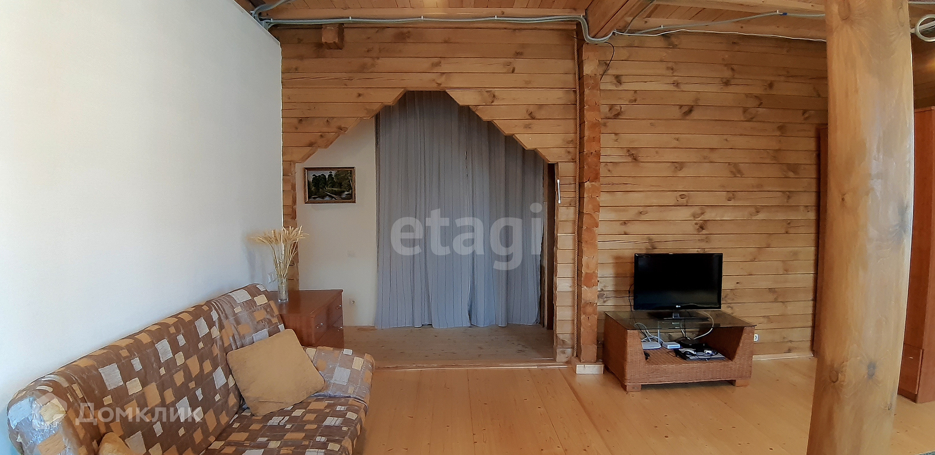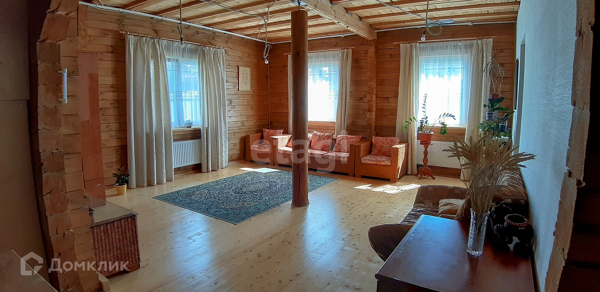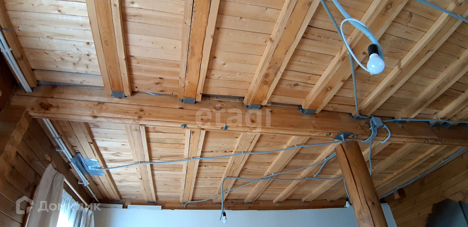 Материал стен - брус (не клееный). Снаружи стены обшиты утеплителем толщиной в 5 см и обшиты деревянной доской.