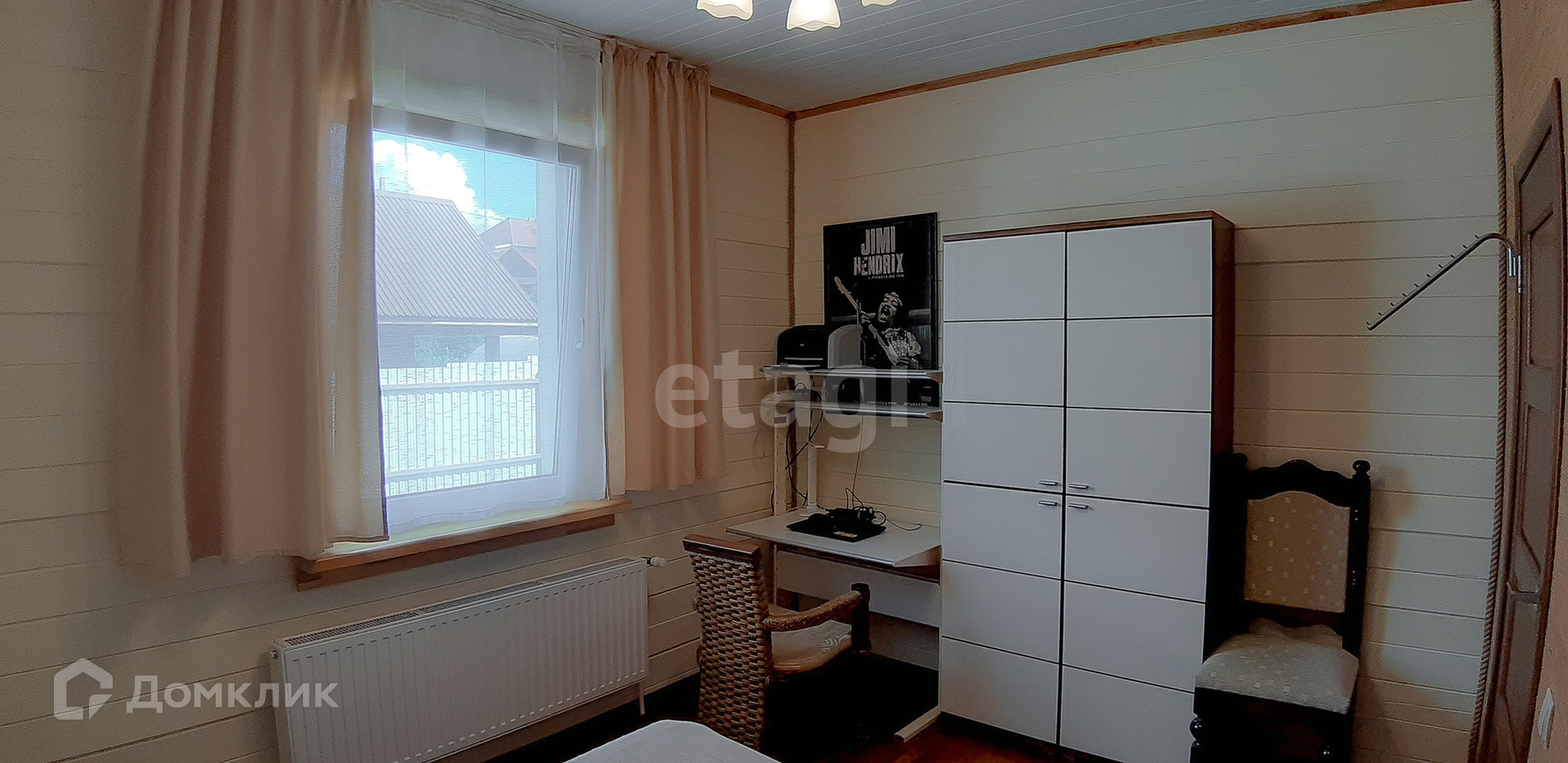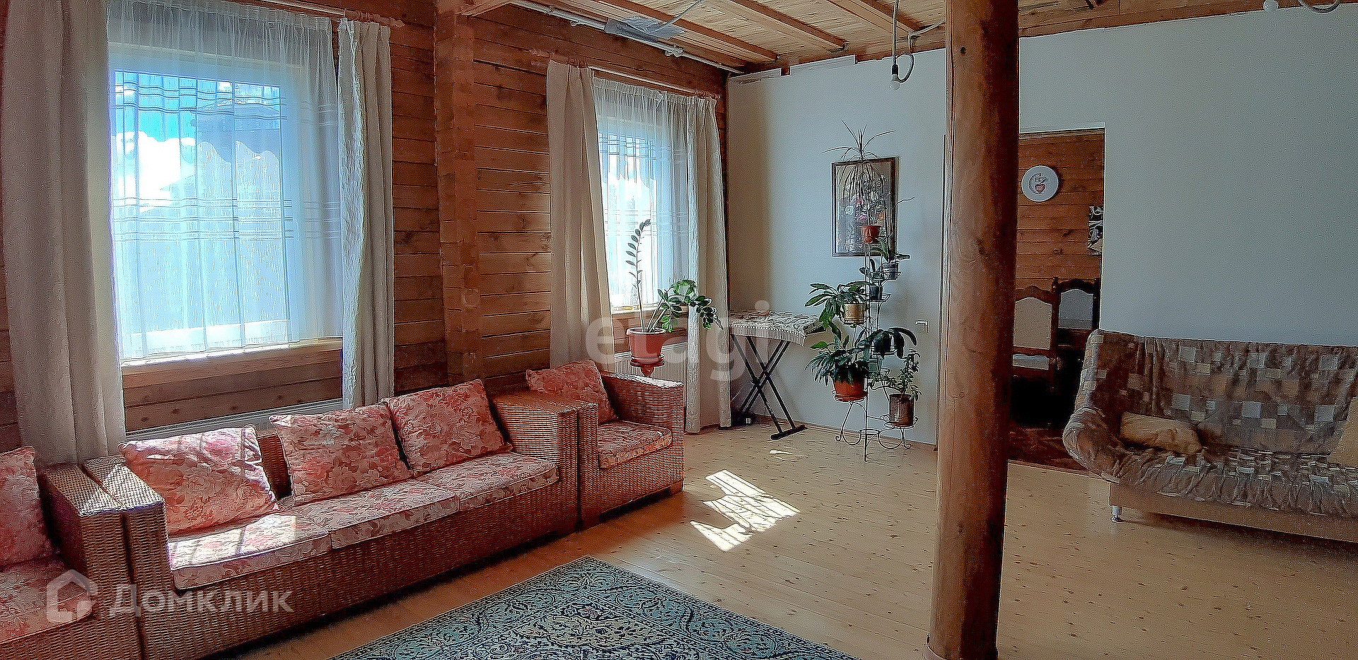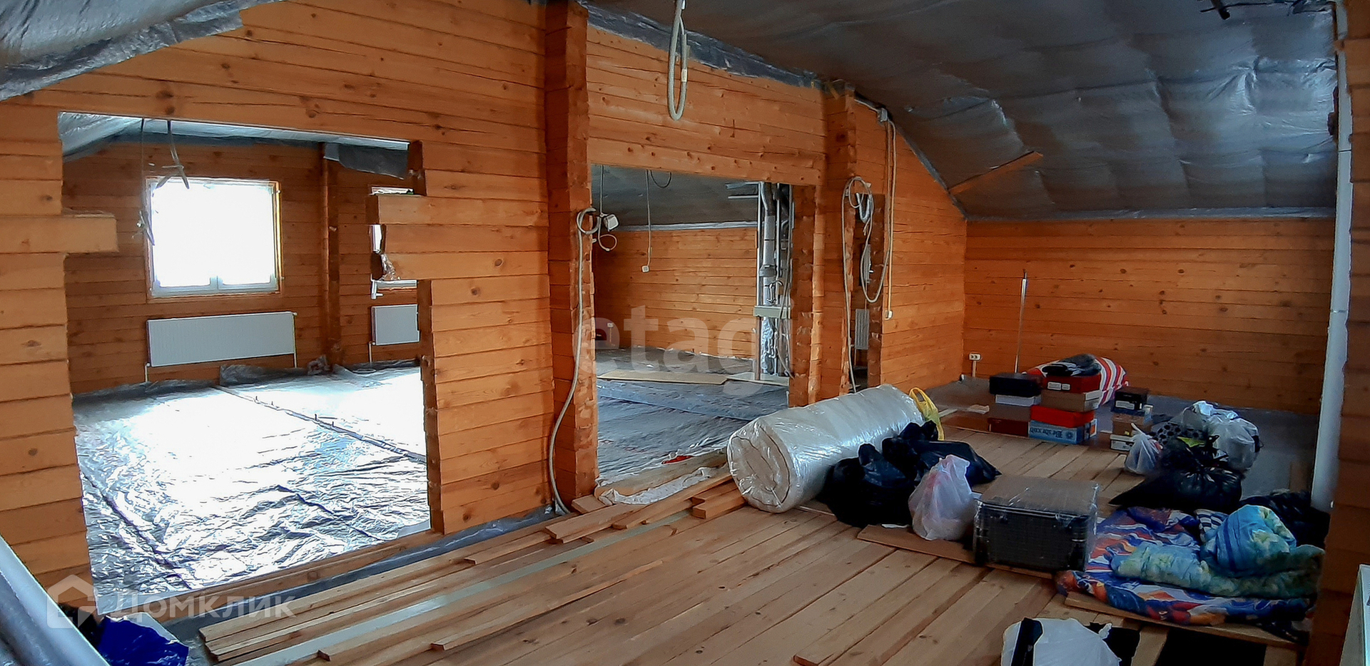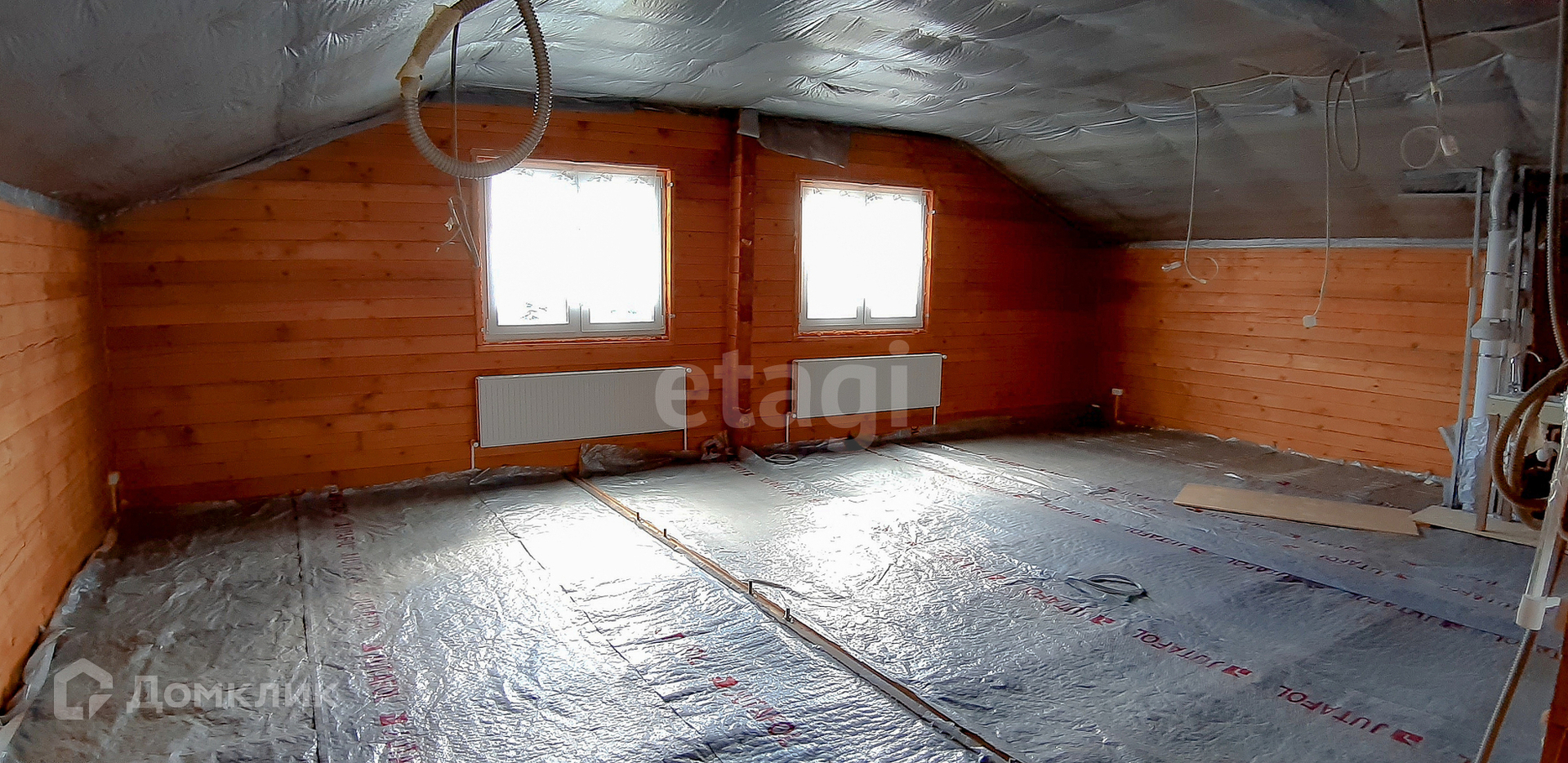Материал стен - брус (не клееный). Снаружи стены обшиты утеплителем толщиной в 5 см и обшиты деревянной доской.
