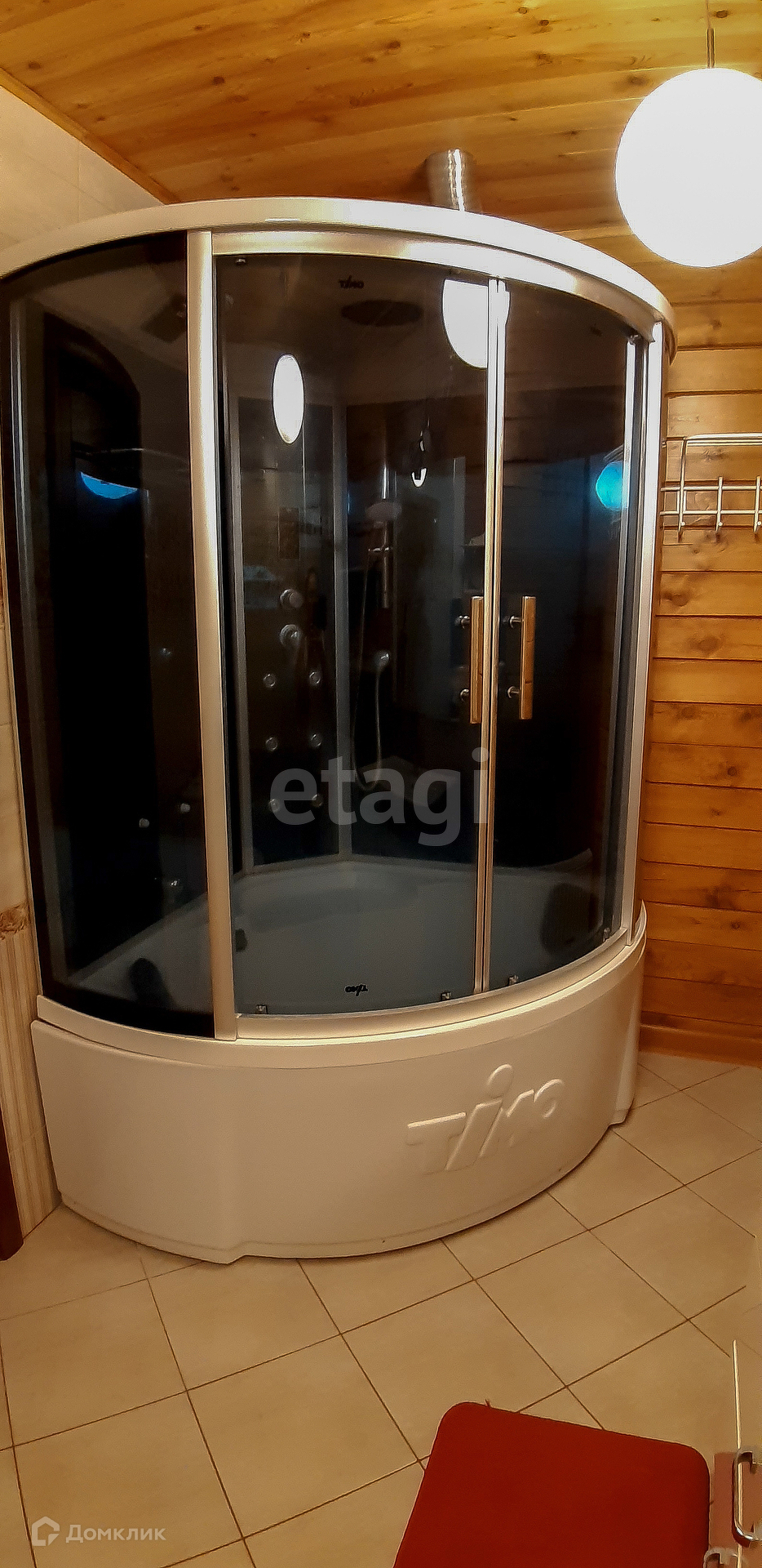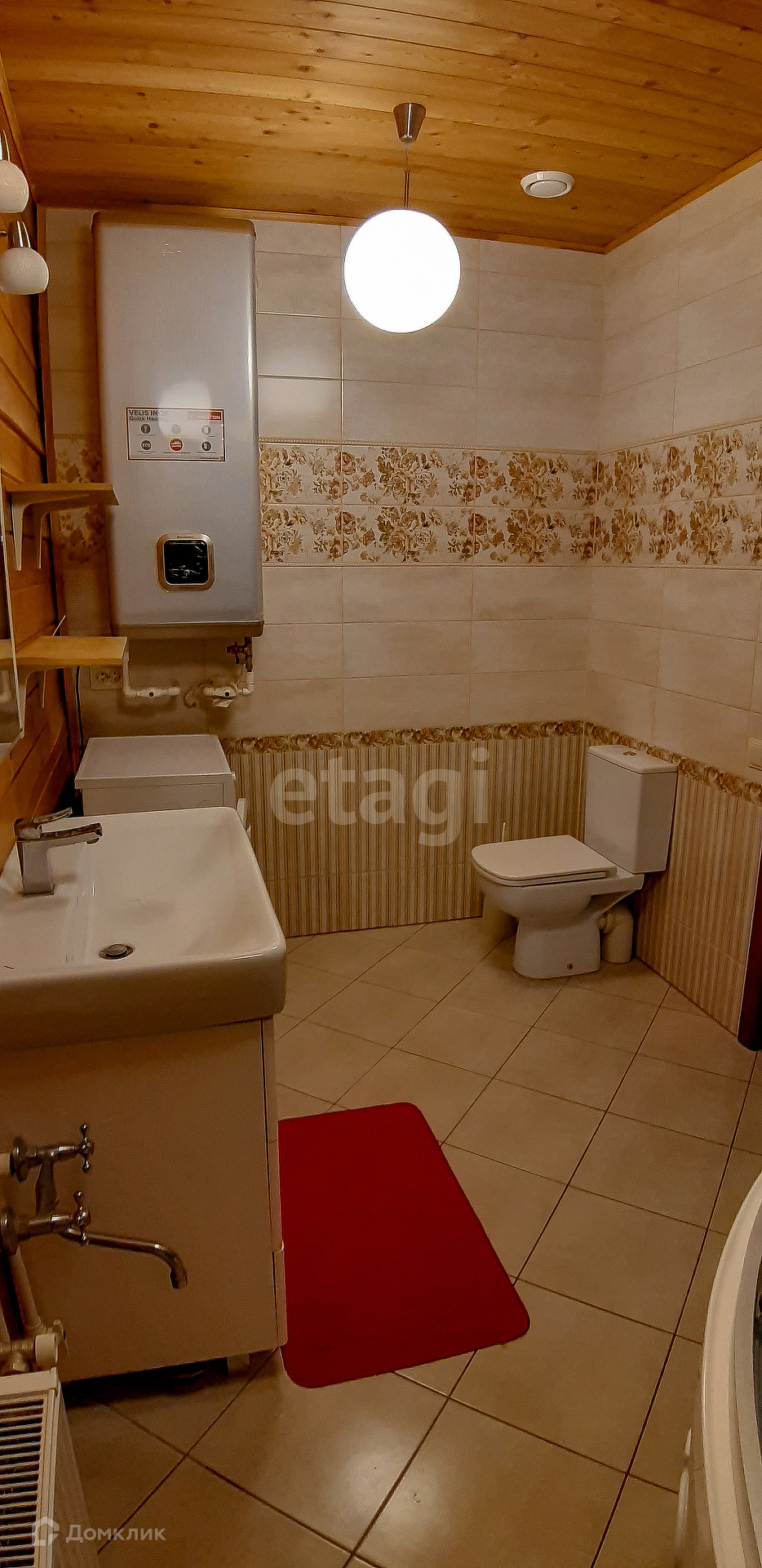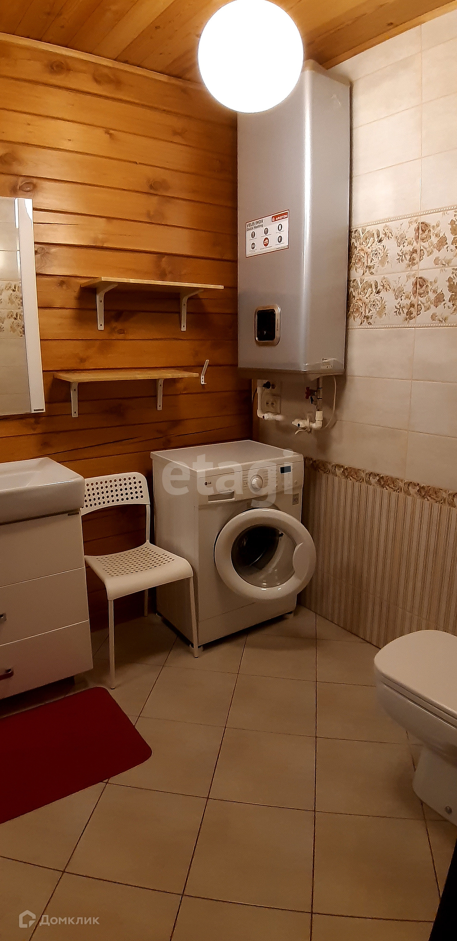 Пол в ванной тёплый водяной. Потолок в ванной комнате из лиственницы. Стены в ванной комнате покрыты специальным составом для защиты древесины.