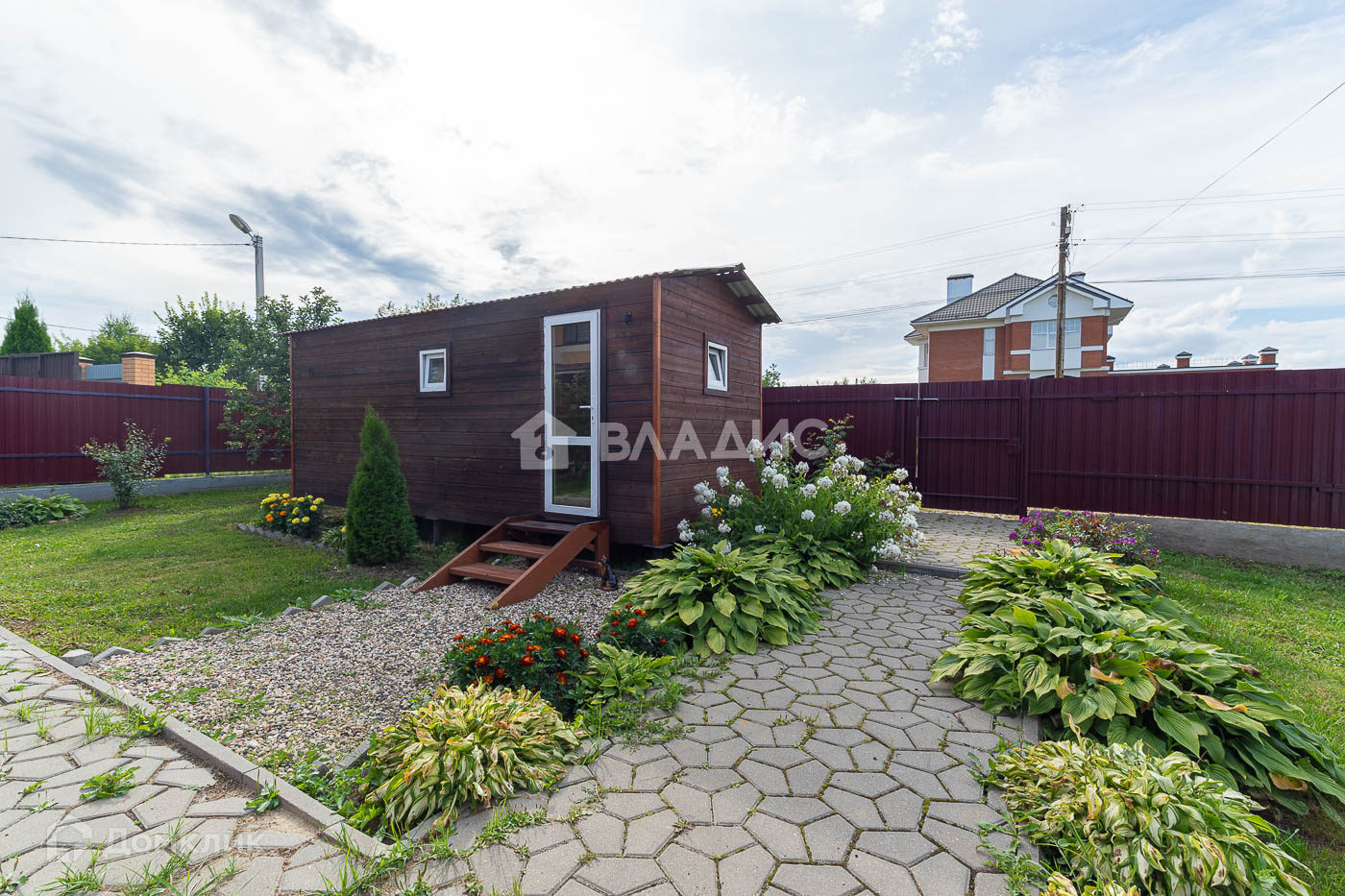 На территории участка есть зона отдыха с бассейном, баней и барбекю. Предусмотрено место для стоянки двух авто.