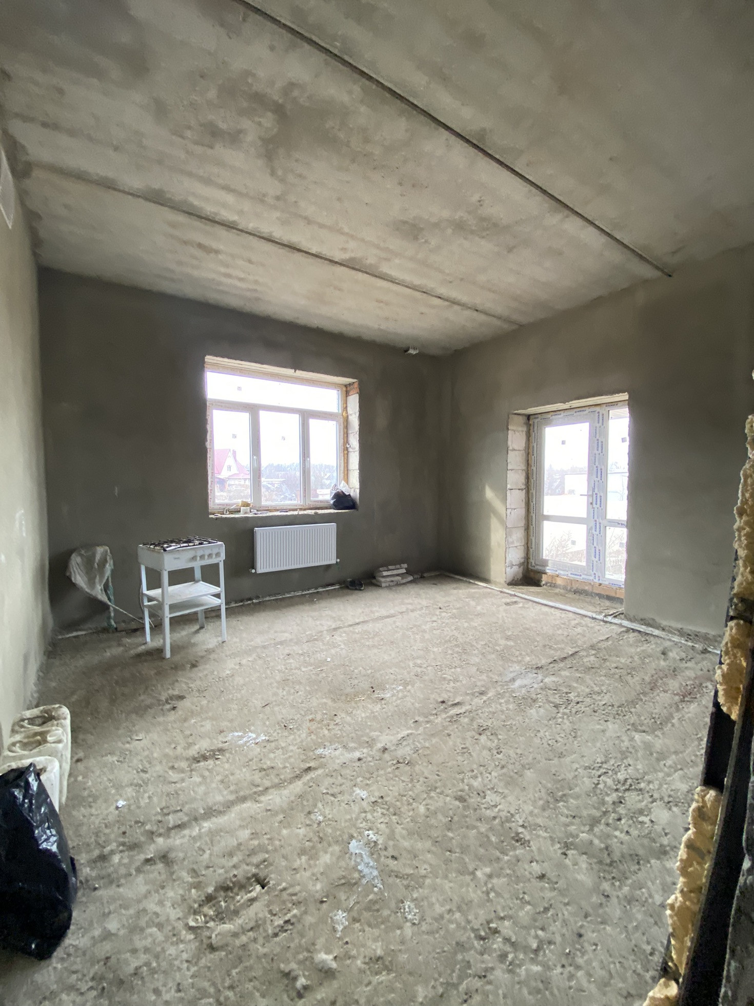 Заштукатурено под маяк, пол - стяжка.