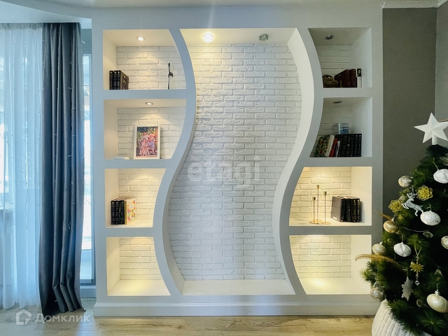 В гостиной комнате огромный удобный диван в гармоничном цветовом сочетании с портьерами и модульной гостиной.