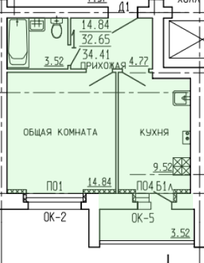 Общая площадь 33.2 м2