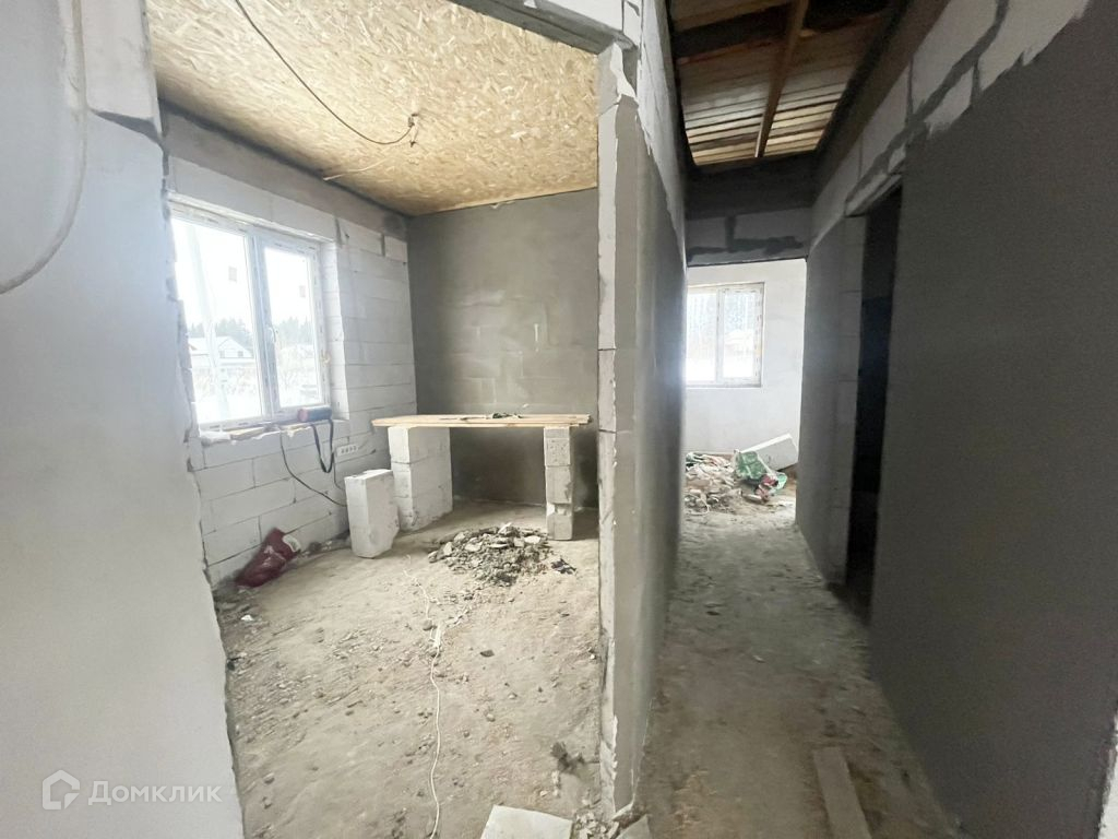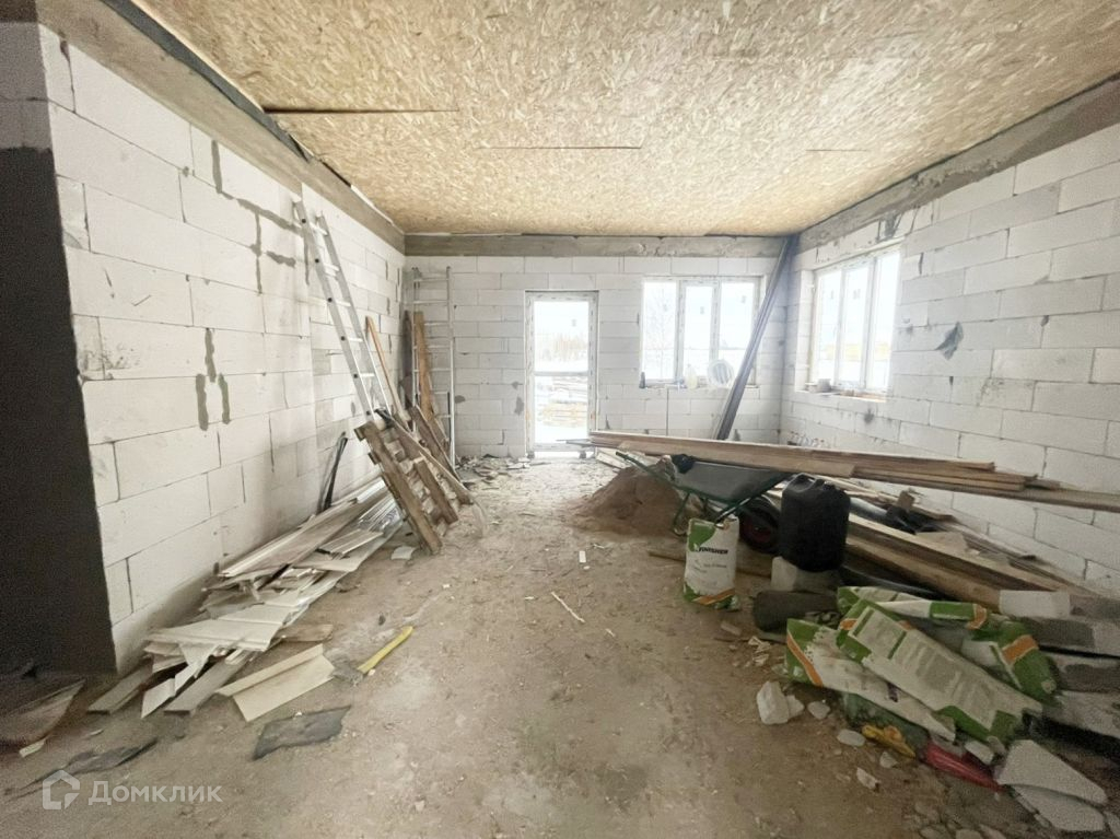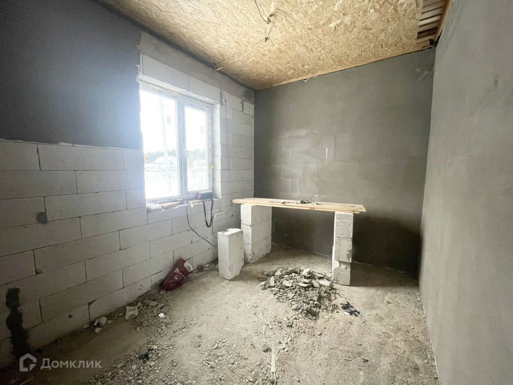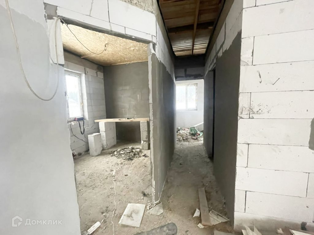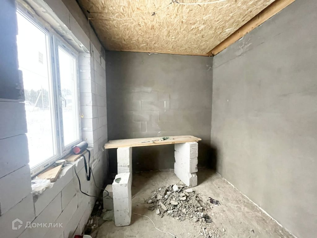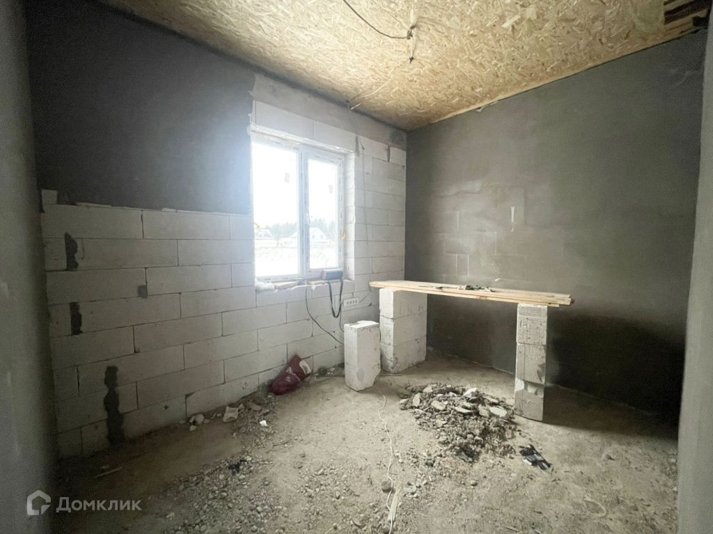 Дом из газосиликата, кровля - мягкая черепица, фундамент - железобетонная плита. Снаружи будет оштукатурен и покрашен, внутри ведутся работы, стены будут отштукатурены и подготовлены под покраску.
