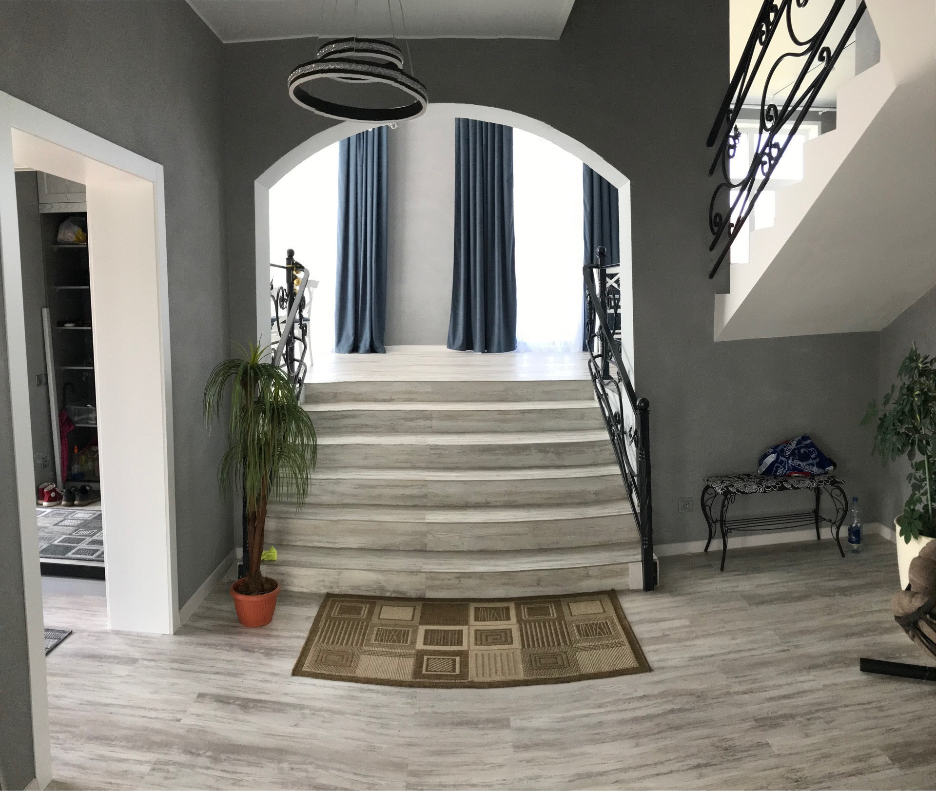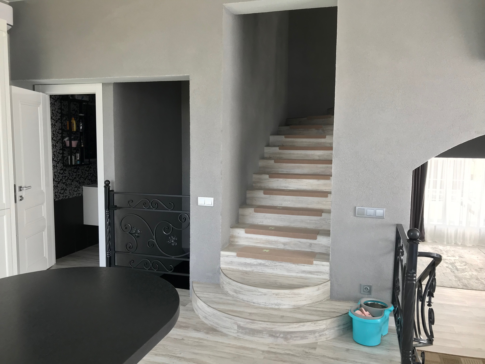 1 ЭТАЖ ;  просторный холл, кухня - гостиная 32 кв.м и комната 32 кв.м, сан.узел. В цокольном этаже возможно сделать кладовку или спортзал.