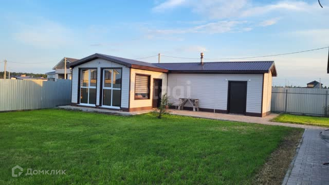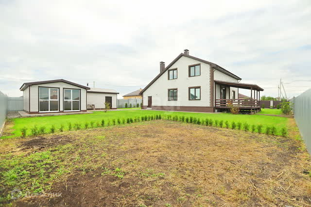 На участке расположен уютный гостевой дом 60м² с тонироваными окнами в пол и красивой подсветкой фасада, с баней, кухней и сан.узлом, полностью готовый для проживания.