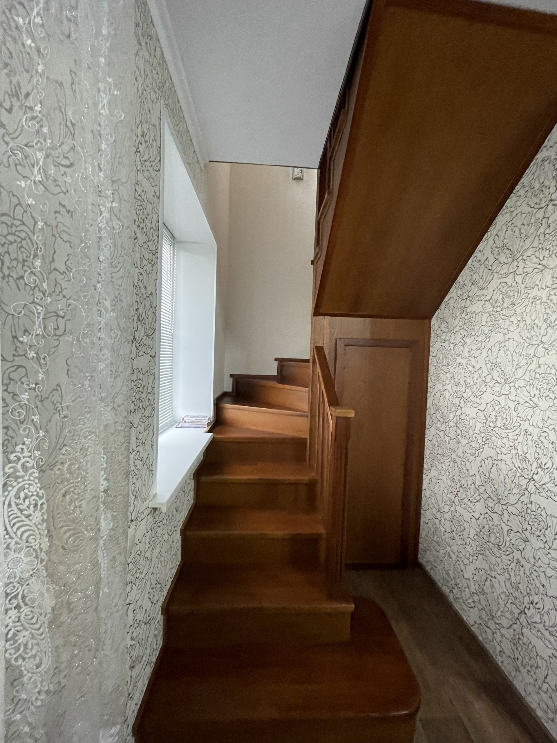 На первом этаже есть входная группа, большая гардеробная, кладовая, кухня и просторная гостиная с интересной подсветкой. На второй этаж ведет лестница из бука на металлокаркасе. Под лестницей расположилась маленькая, но вместительная кладовая комната.