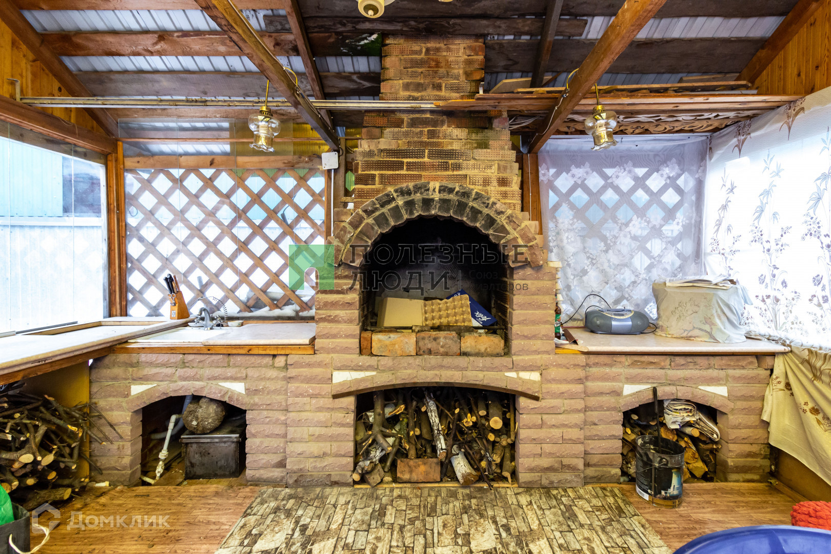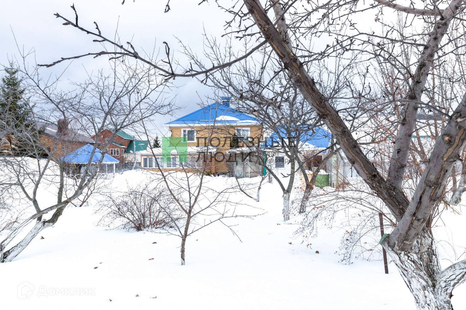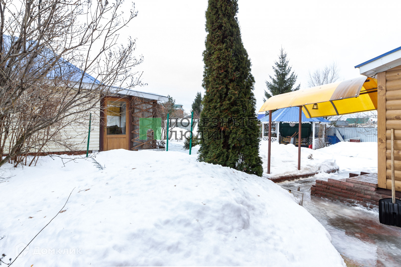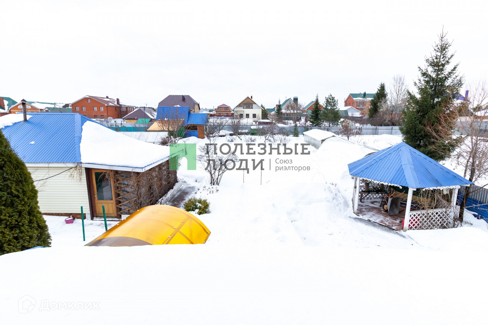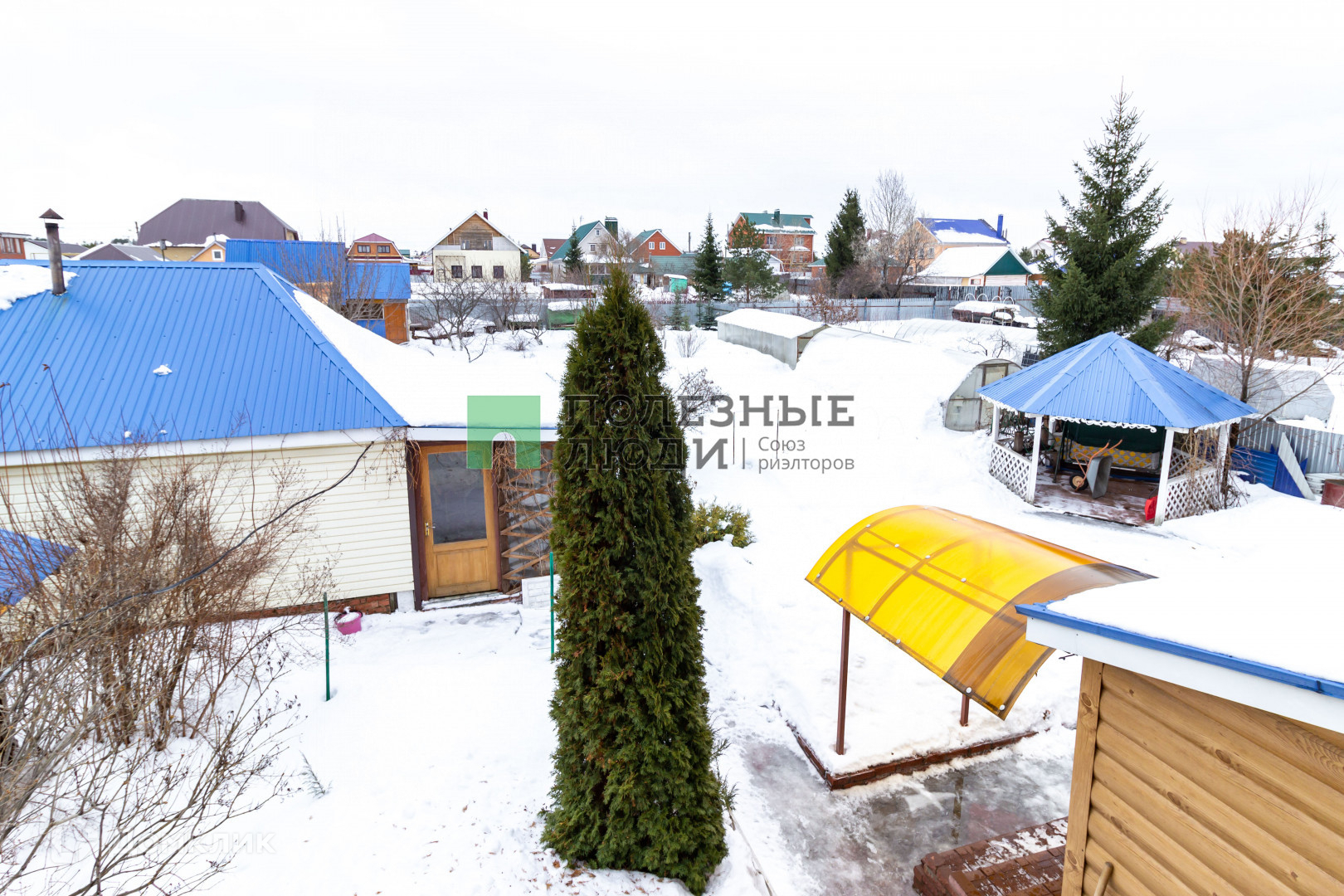 На территории находится беседка, зона барбекю ,баня с комнатой отдыха, дровник, хозблок для содержания домашней птицы и зоной для хранения инвентаря, три теплицы.