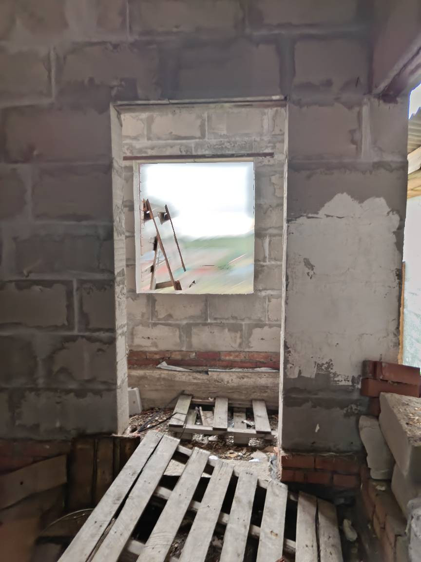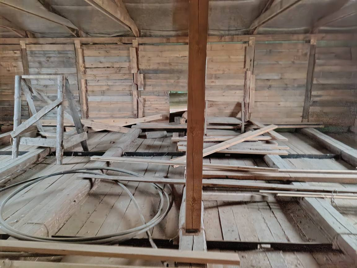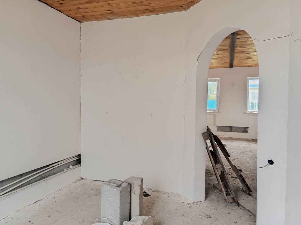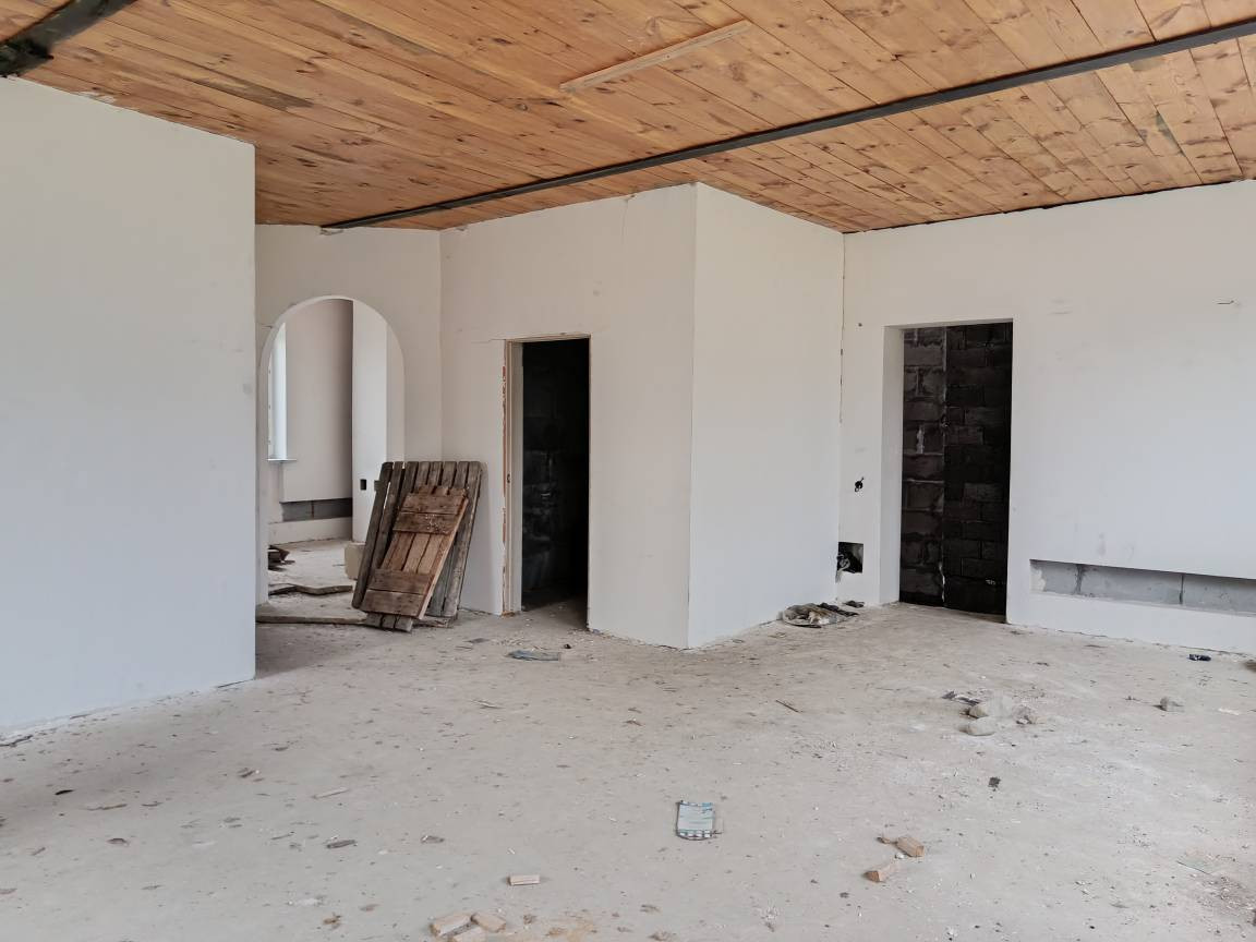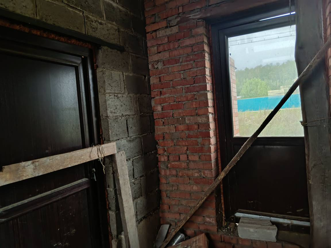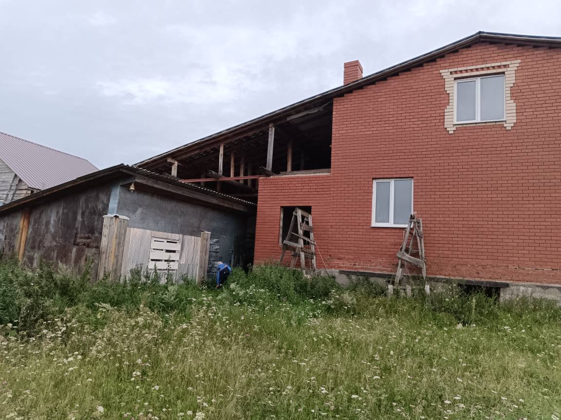 Требуется достроить второй этаж. Общая площадь указана без второго этажа. Газ и электричество подведено. Имеется сруб для бани (стоит под навесом), гараж, бытовка.