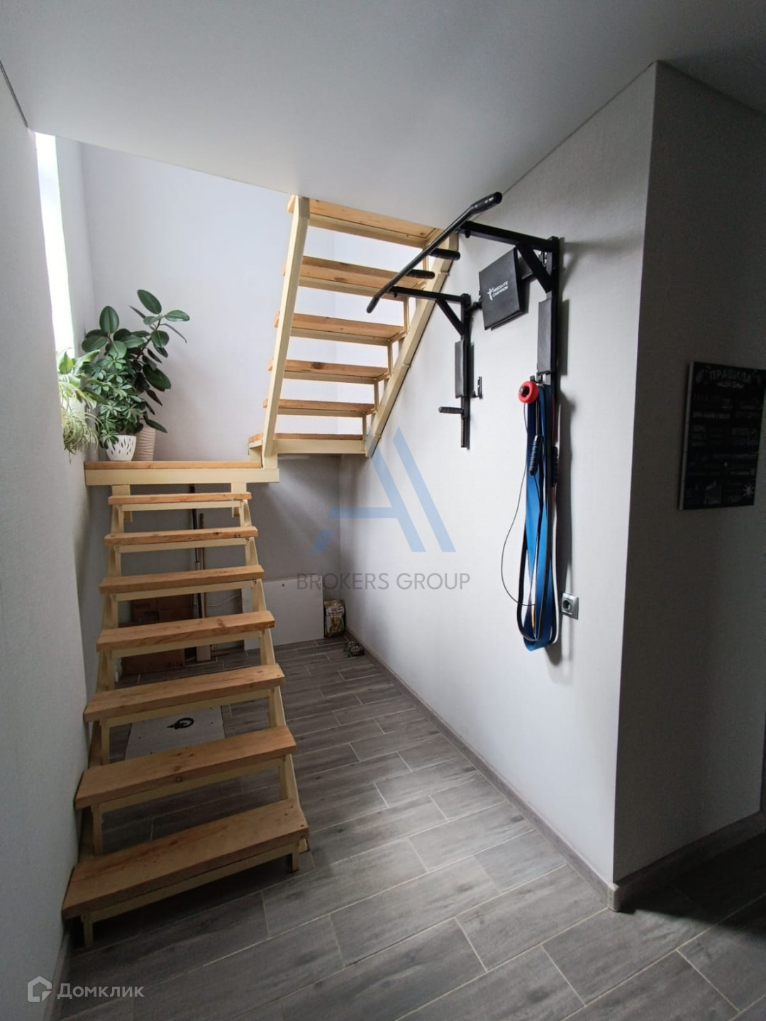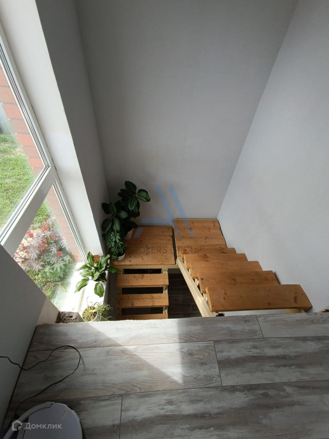 Около лестницы расположено вертикальное большое окно.
