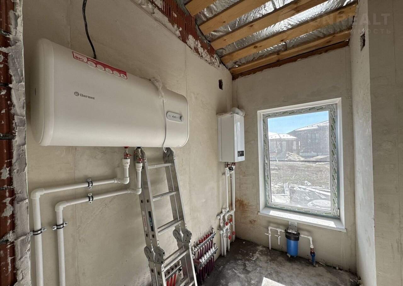 Продуманная инженерная система, одноконтурный котел, бак косвенного нагрева, сделан дополнительный теплый пол на уличную часть дома, электрика шнайдер
