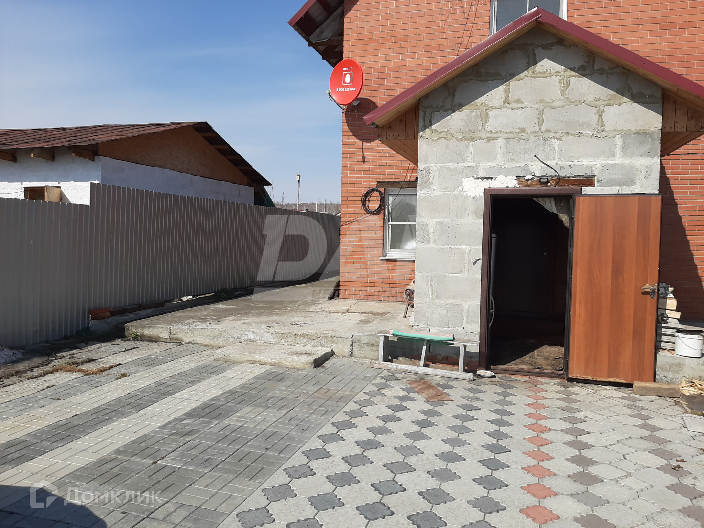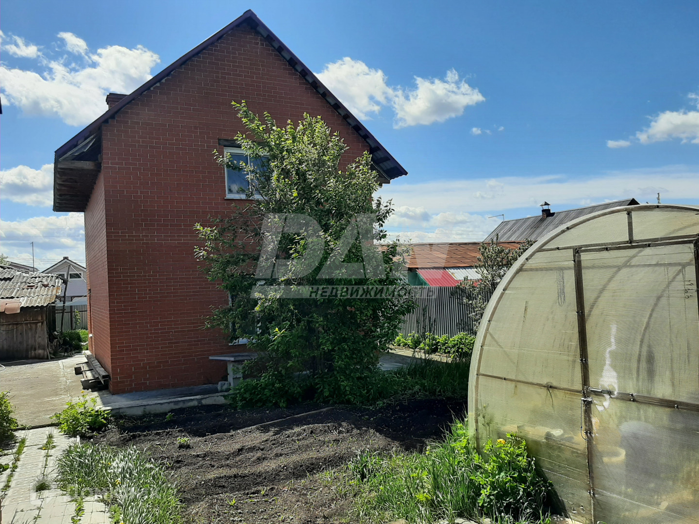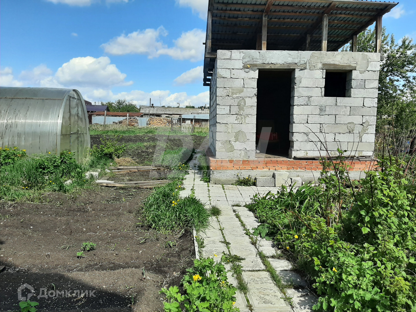 На территории недостроенная баня, сарай, теплица. Территория огорожена по всему периметру, выложена плиткой.