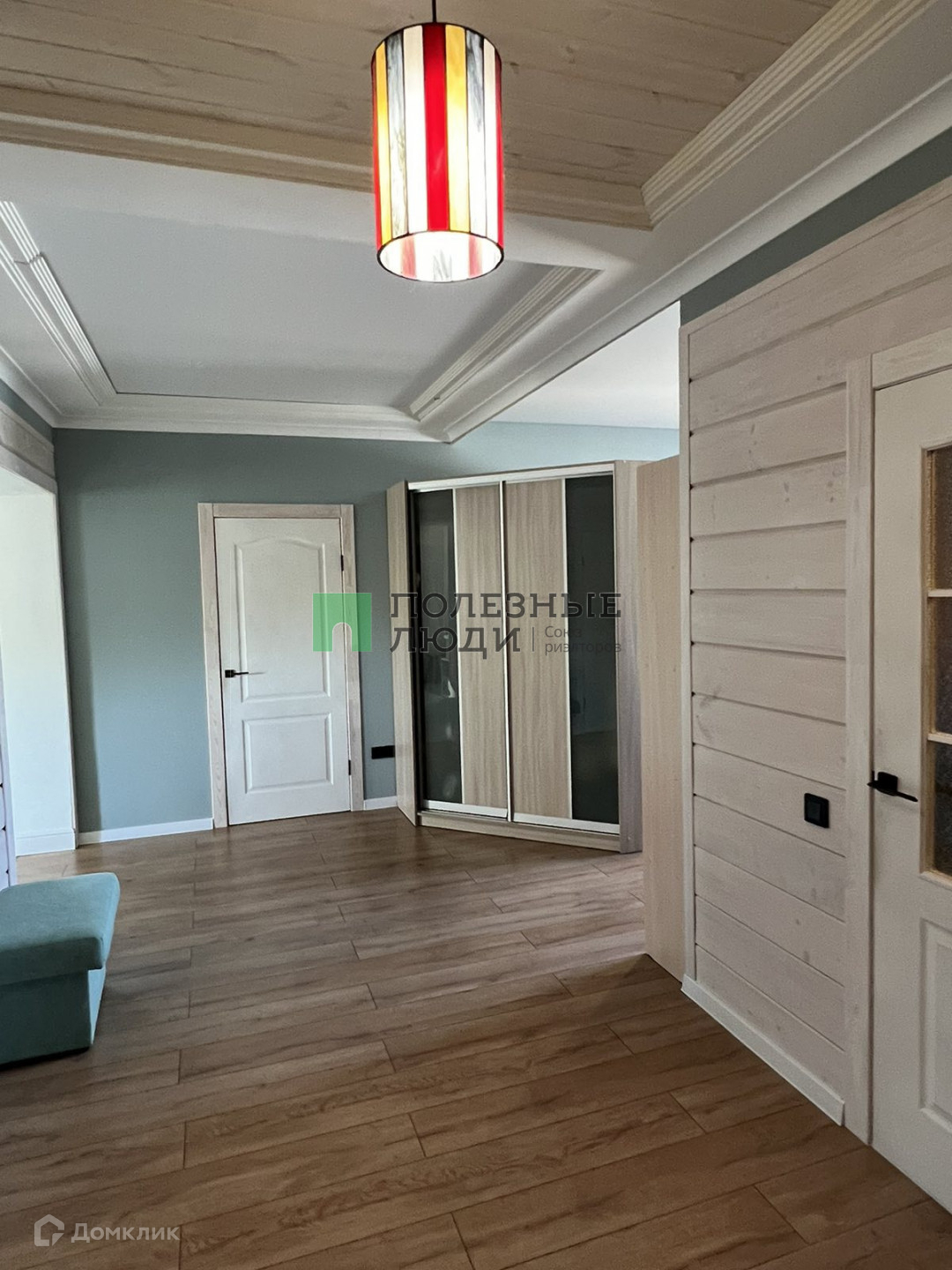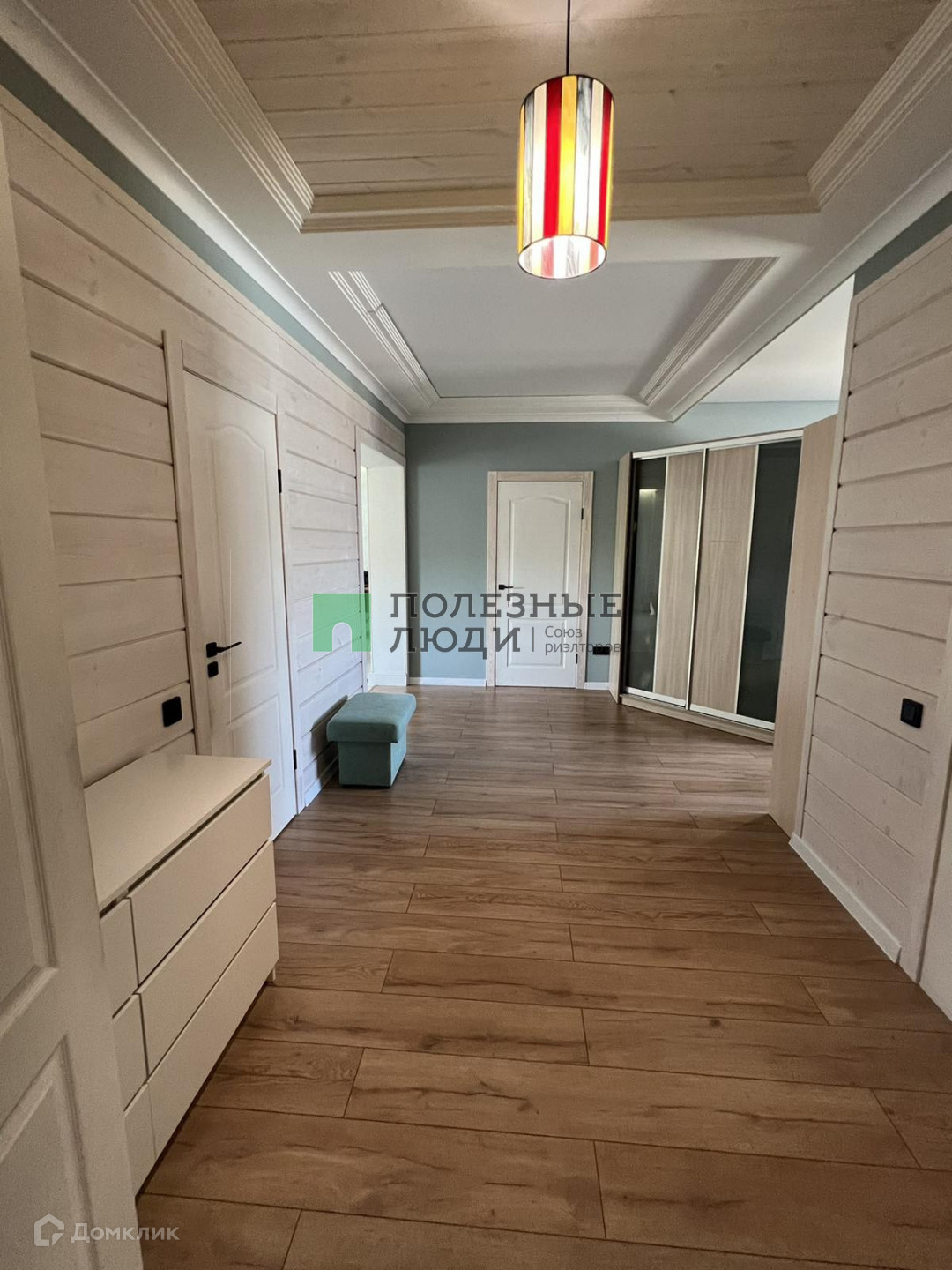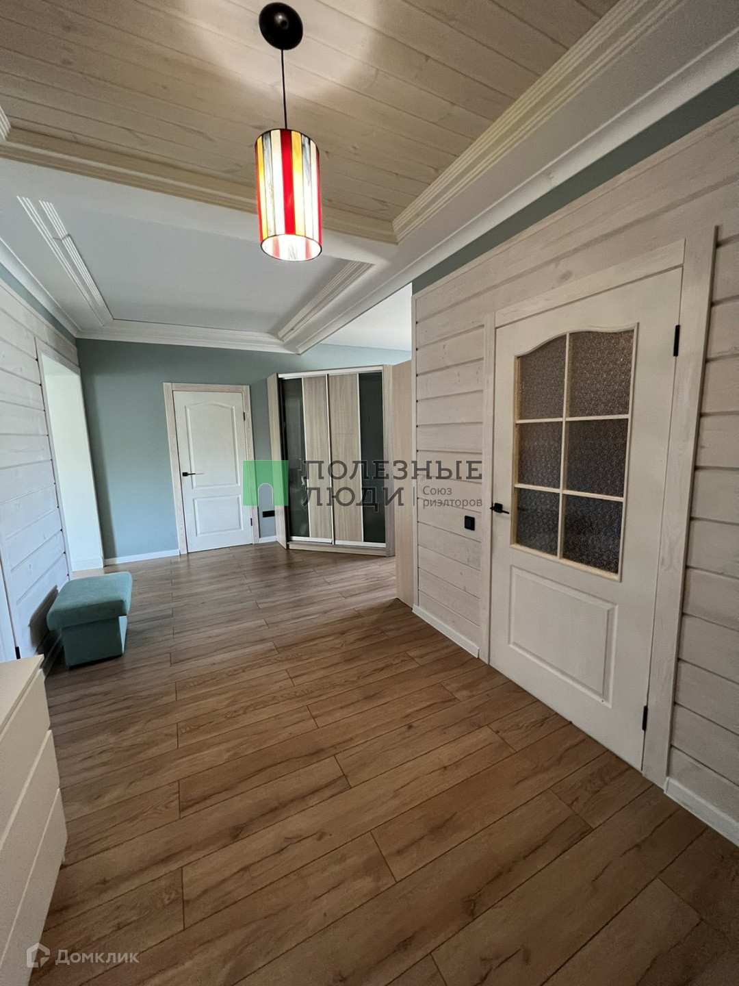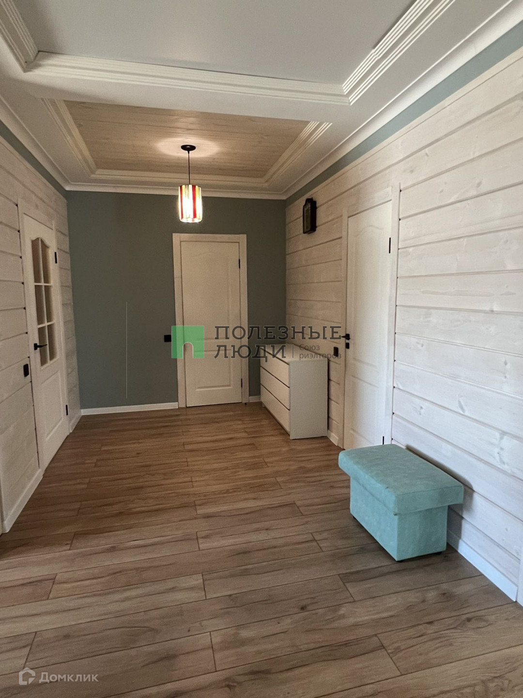 Потолки комбинированные: натяжные матовые+ тонированное дерево. На стенах штукатурка шелкография, на полу в коридоре и спальной комнате ламинат 33 класса, в гостиной и санузле керамогранит.