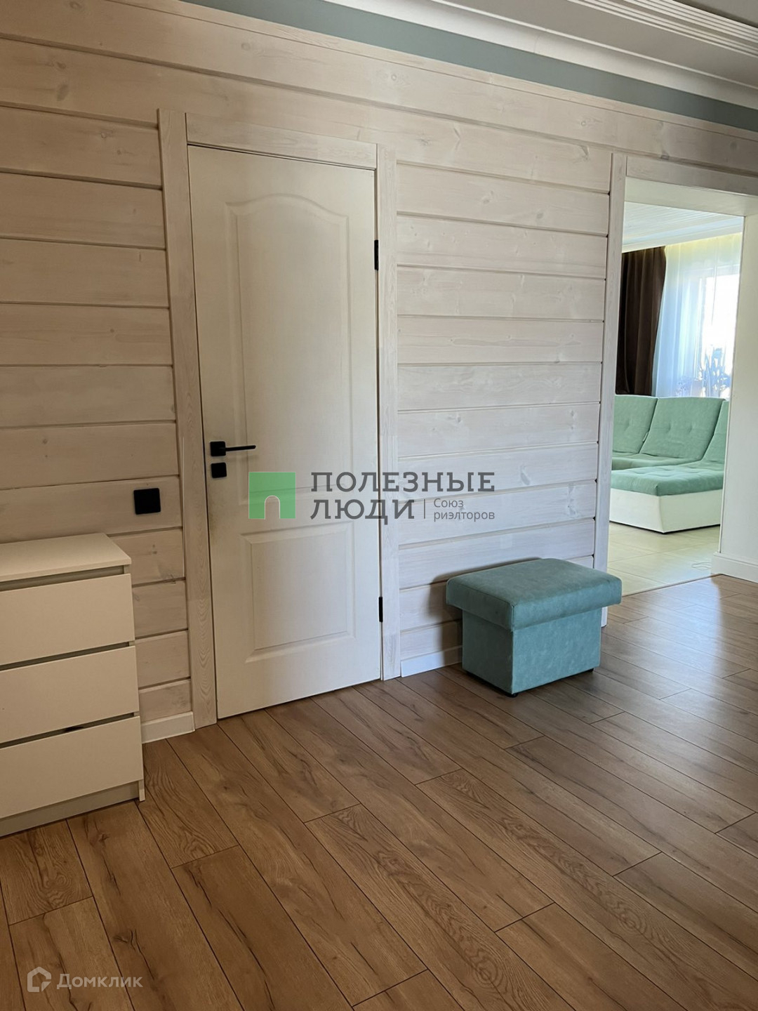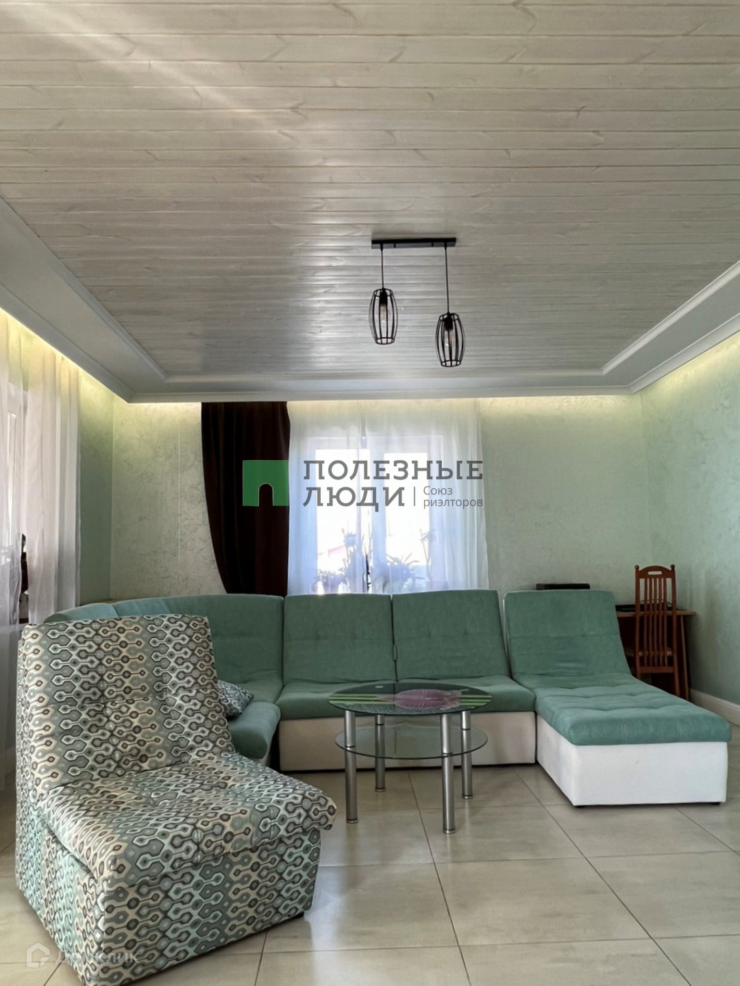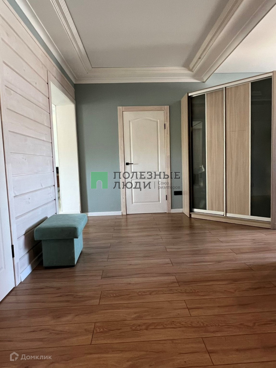 Потолки комбинированные: натяжные матовые+ тонированное дерево. На стенах штукатурка шелкография, на полу в коридоре и спальной комнате ламинат 33 класса, в гостиной и санузле керамогранит.
