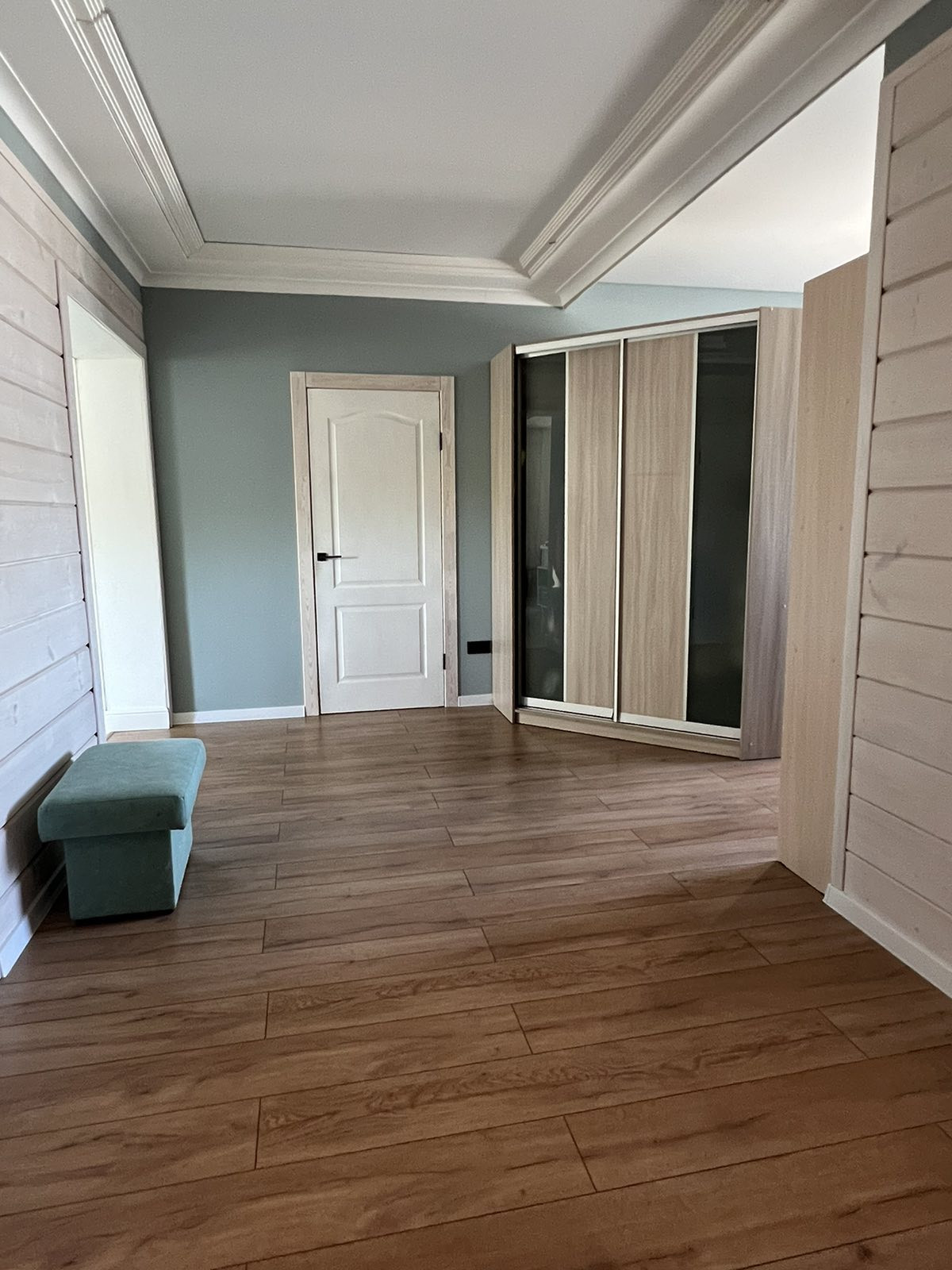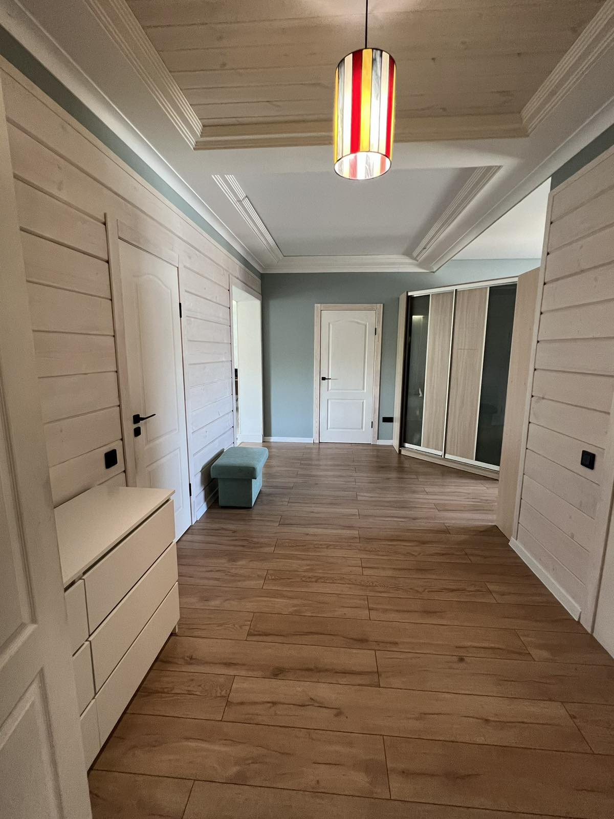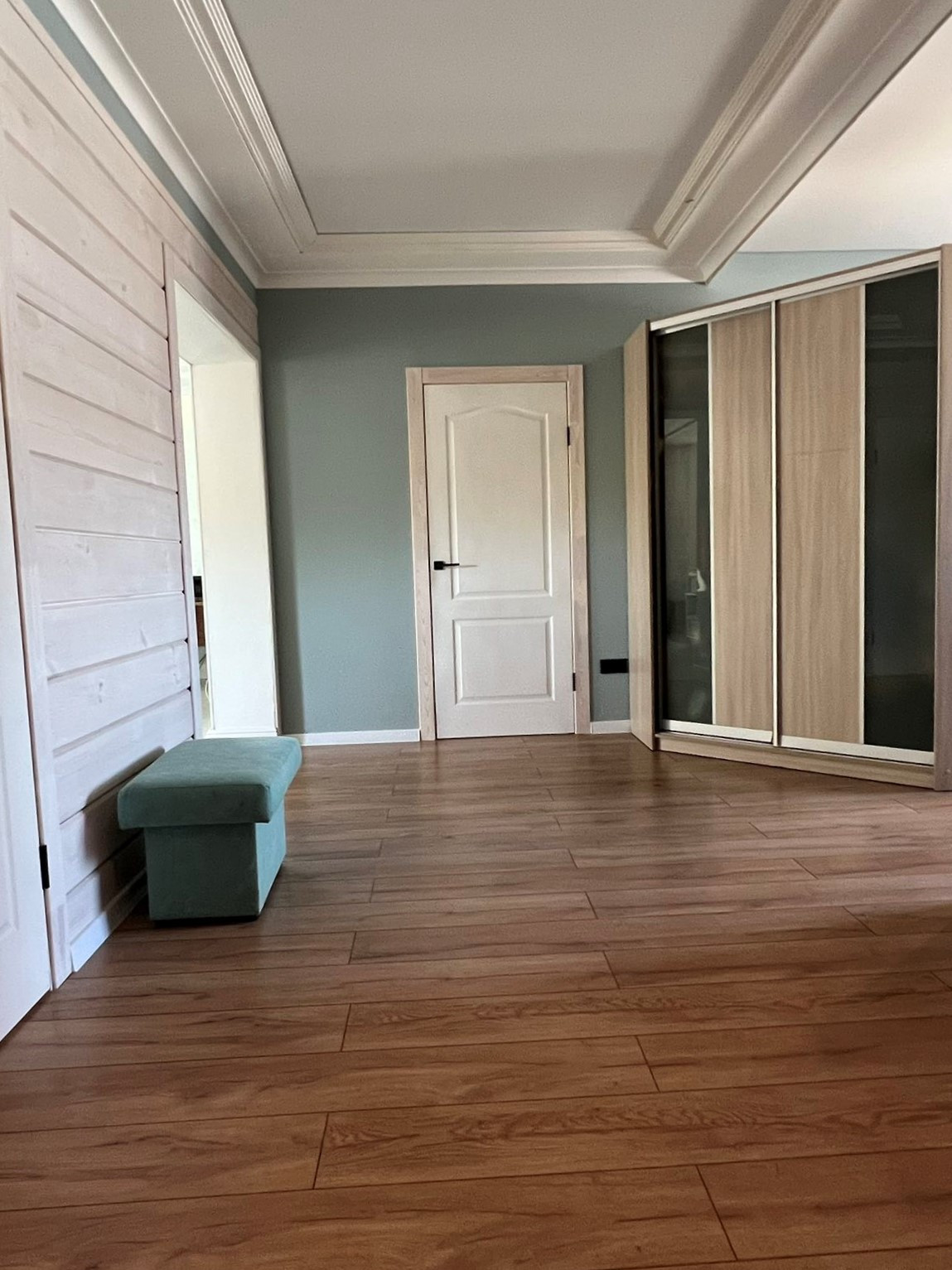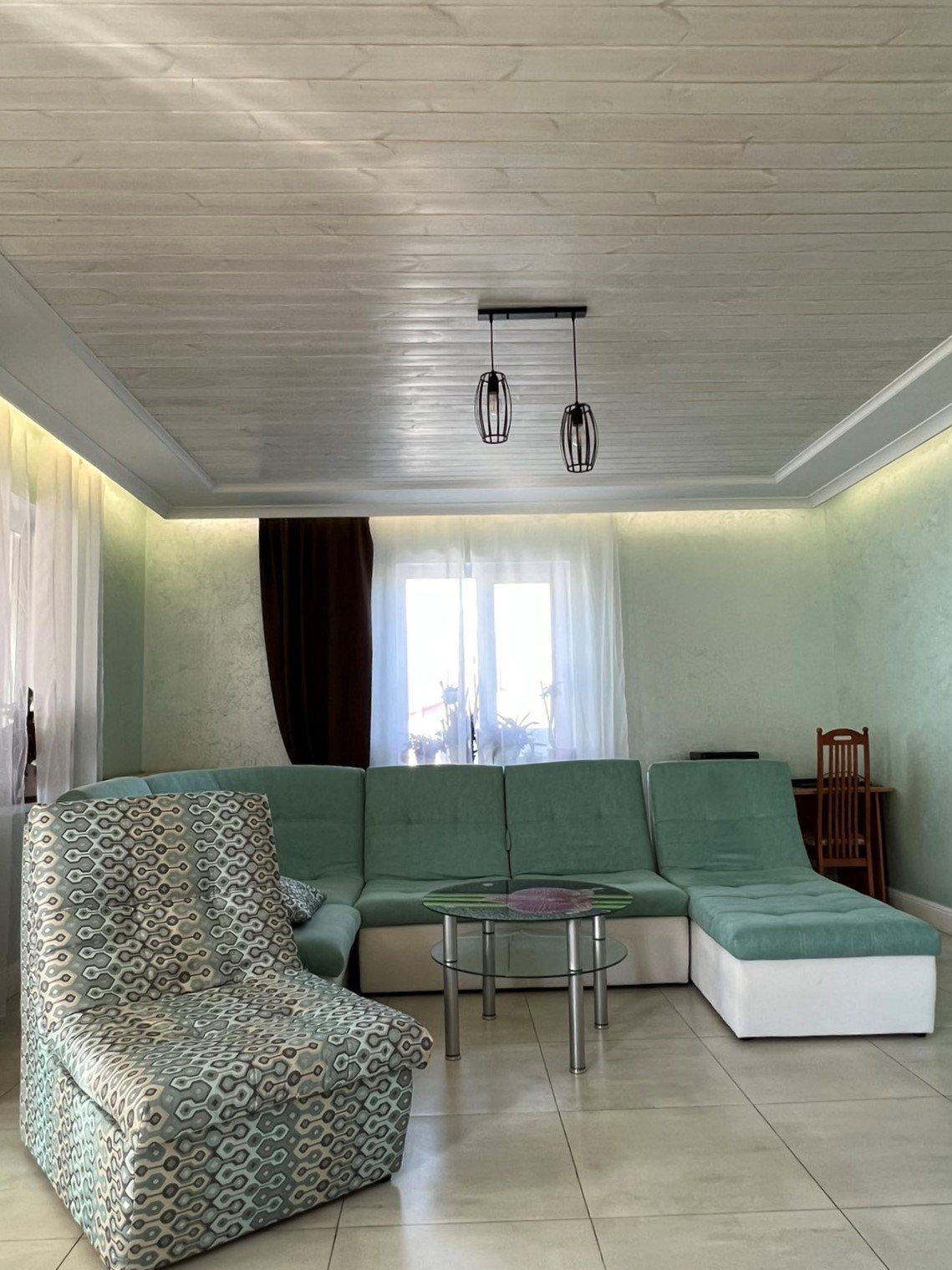 Потолки комбинированные: натяжные матовые+ тонированное дерево. На стенах штукатурка шелкография, на полу в коридоре и спальной комнате ламинат 33 класса, в гостиной и санузле керамогранит.