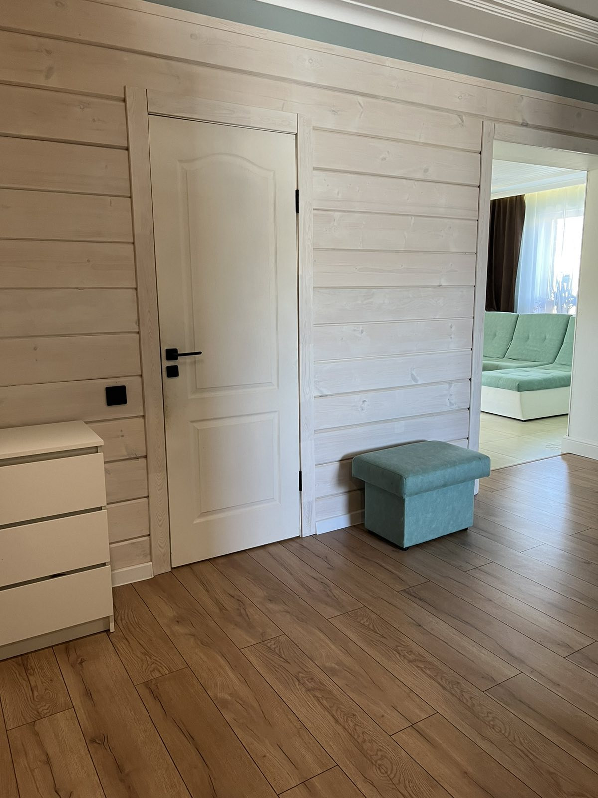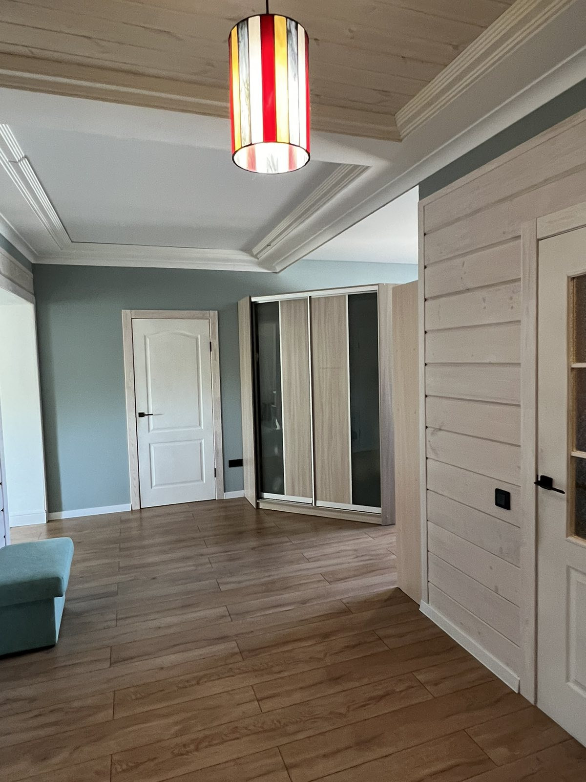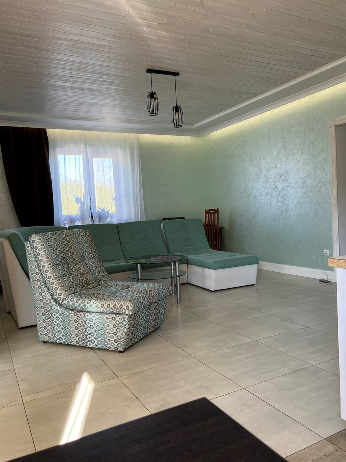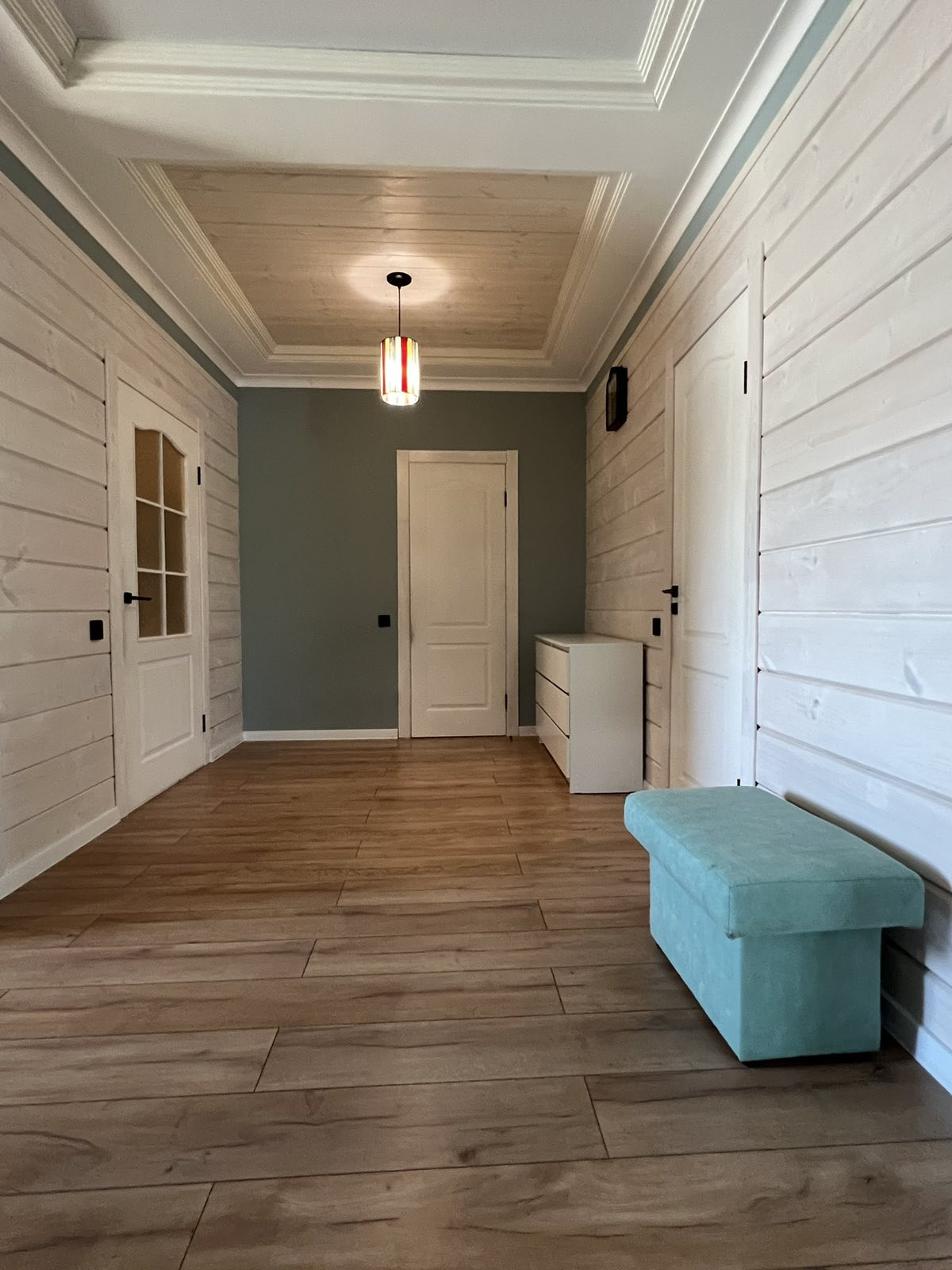 Потолки комбинированные: натяжные матовые+ тонированное дерево. На стенах штукатурка шелкография, на полу в коридоре и спальной комнате ламинат 33 класса, в гостиной и санузле керамогранит.
