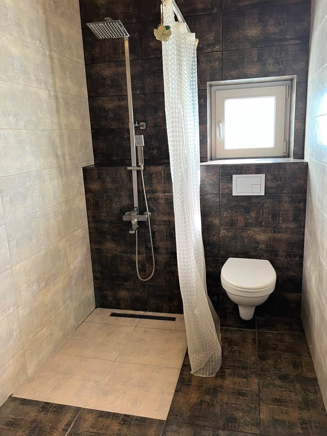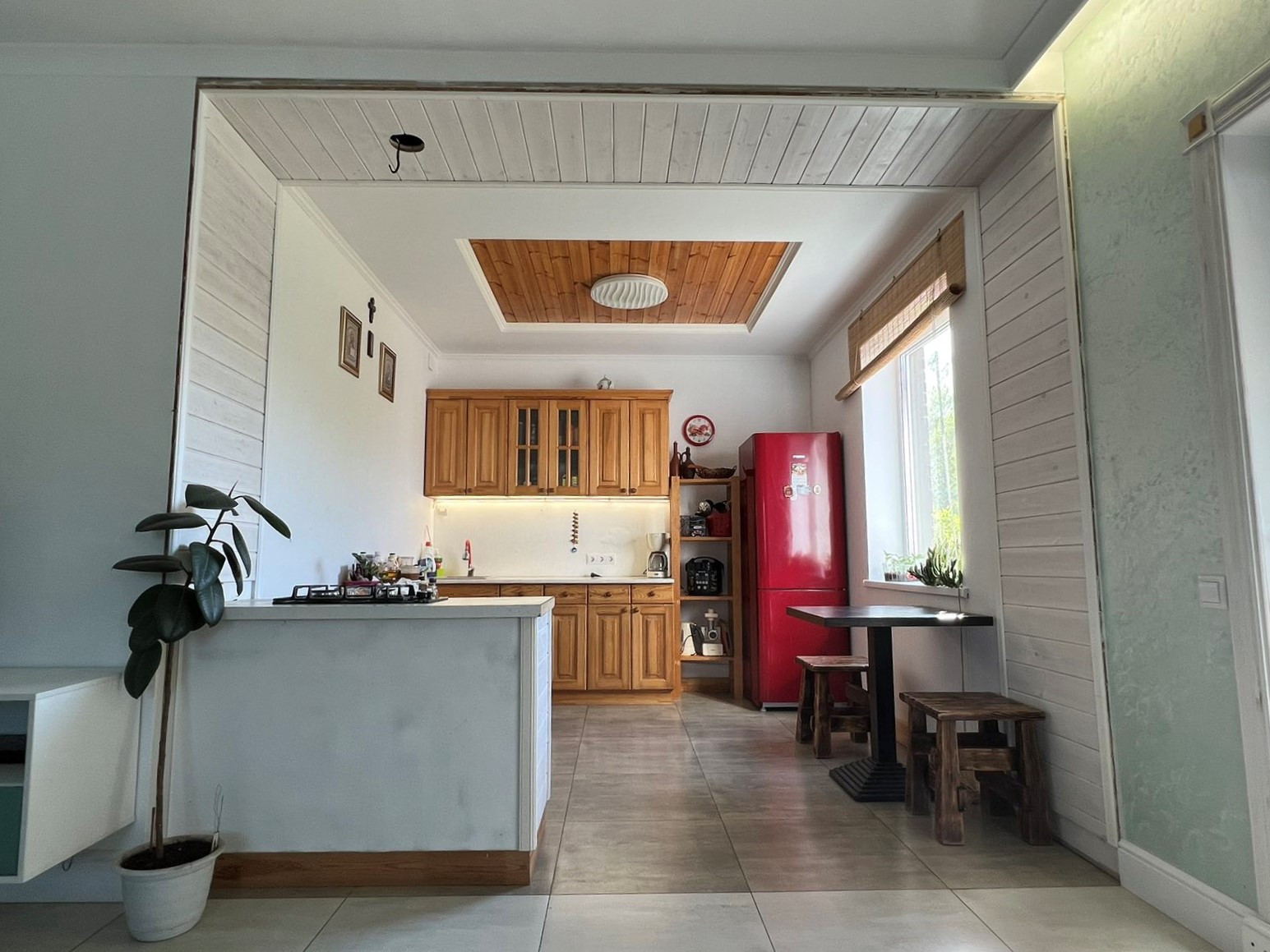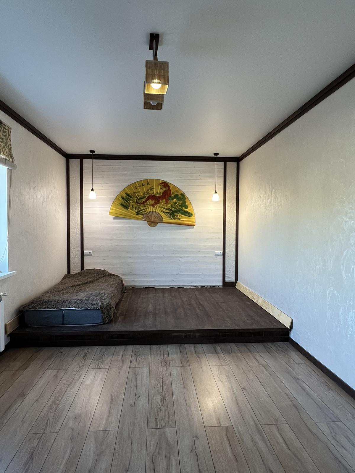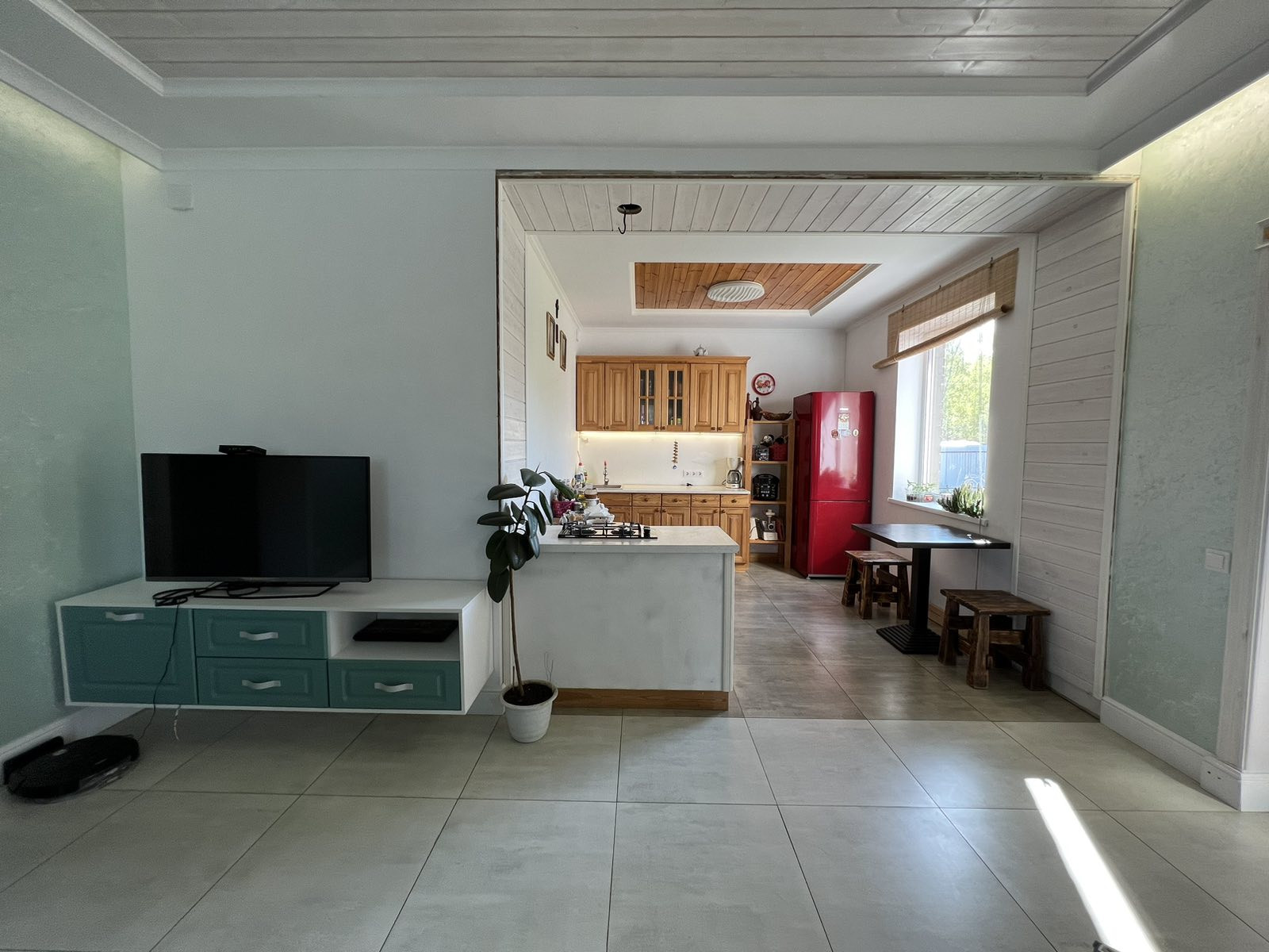 Потолки комбинированные: натяжные матовые+ тонированное дерево. На стенах штукатурка шелкография, на полу в коридоре и спальной комнате ламинат 33 класса, в гостиной и санузле керамогранит.