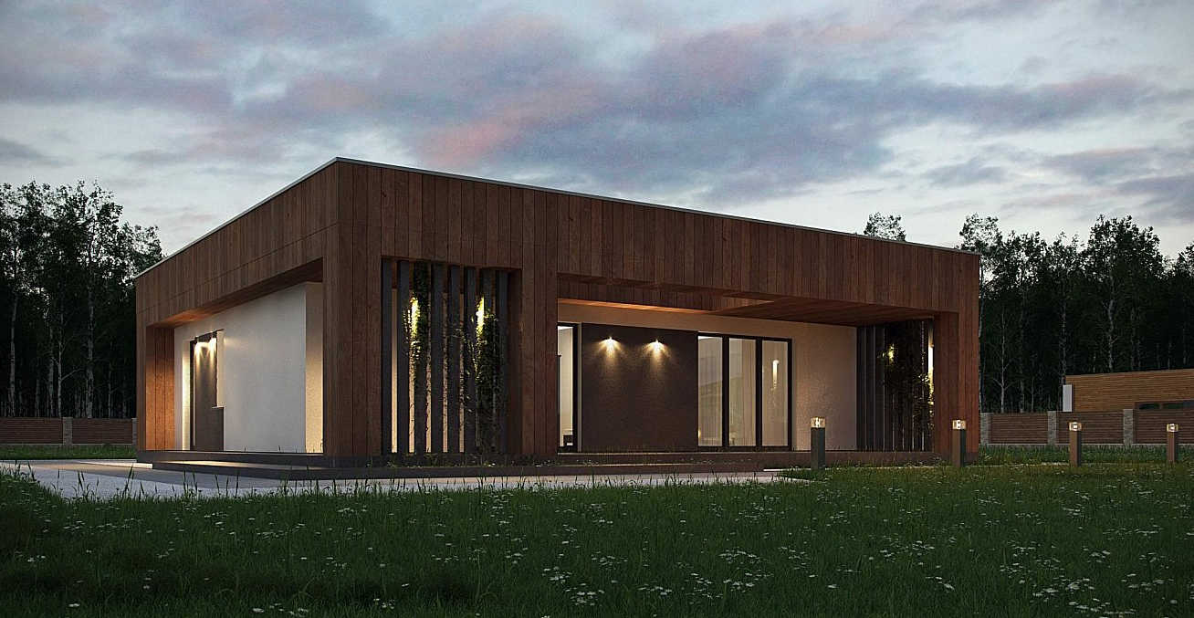 Дом из газоблока 400 мм с утеплением, стильный фасад из декоративных фиброцеметных панелей, комфортная 4-комнатная планировка с тремя спальнями и кухней-гостинной, теплые полы по всему дому, плоская кровля, терраса