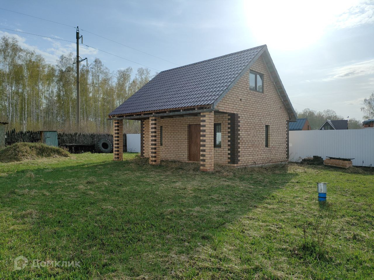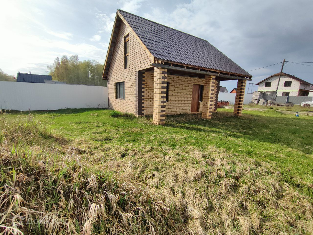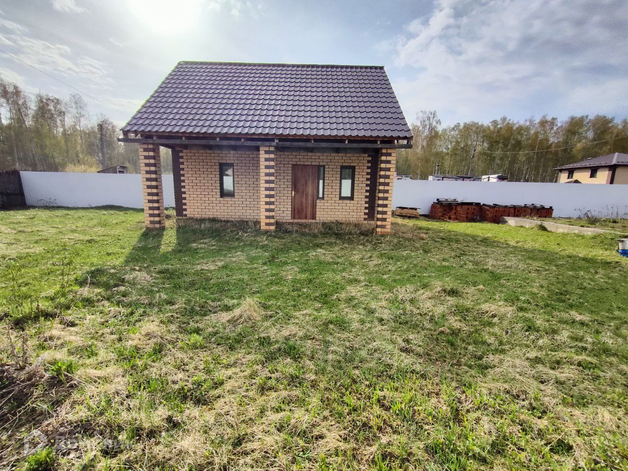 На участке построен небольшой дом из пеноблока, облицованный кирпичом. Фундамент ленточный на бурозаливных сваях. Крыша из металлочерепицы. Окна пластиковые, профиль КВЕ, снаружи ламинированные.