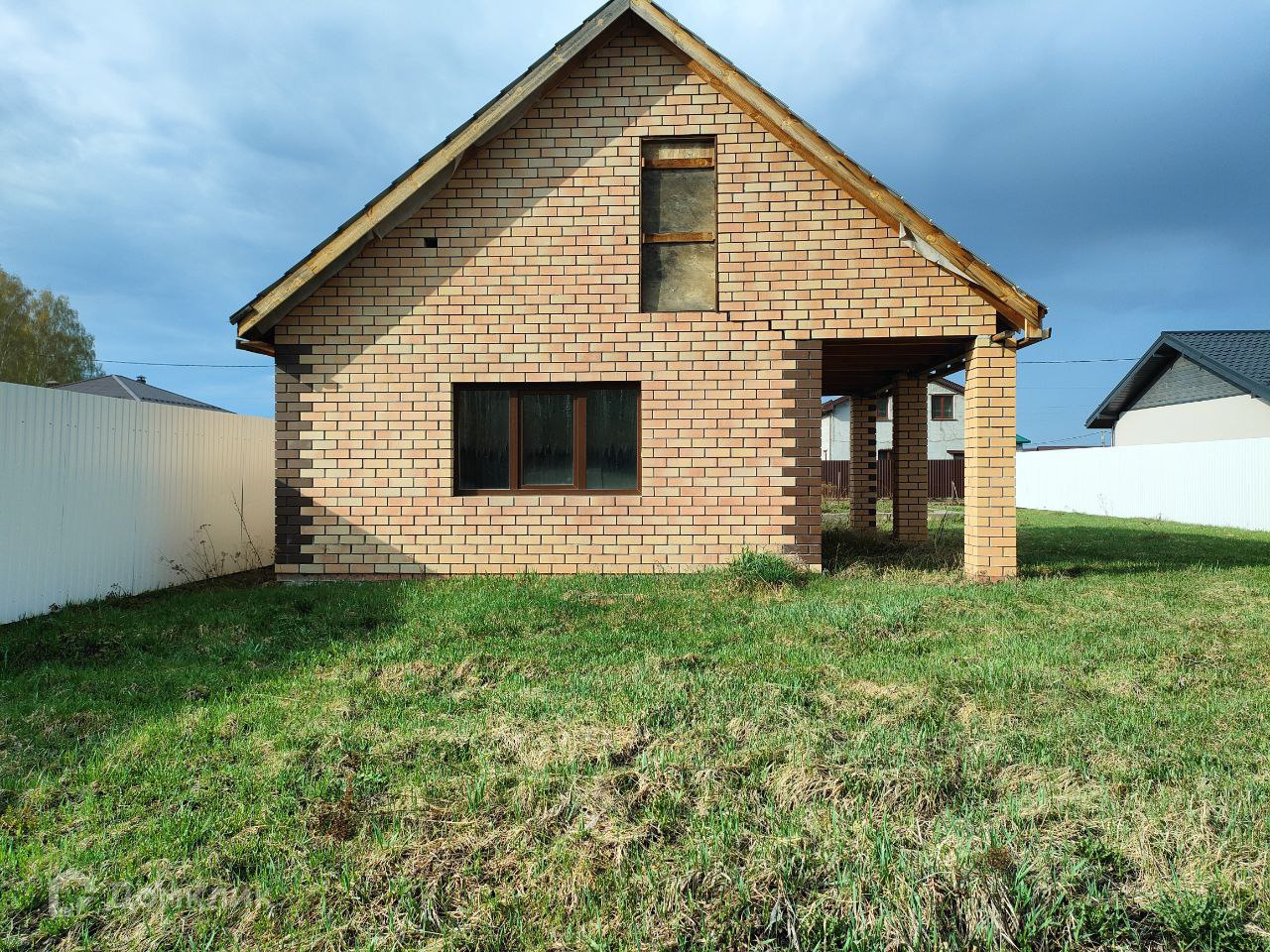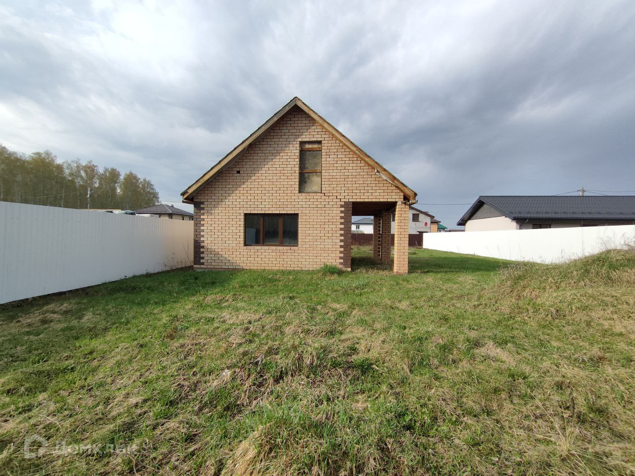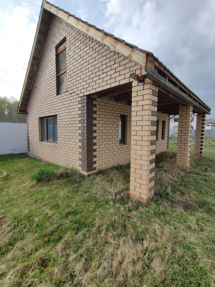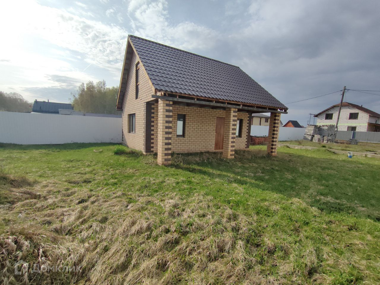 На участке построен небольшой дом из пеноблока, облицованный кирпичом. Фундамент ленточный на бурозаливных сваях. Крыша из металлочерепицы. Окна пластиковые, профиль КВЕ, снаружи ламинированные.