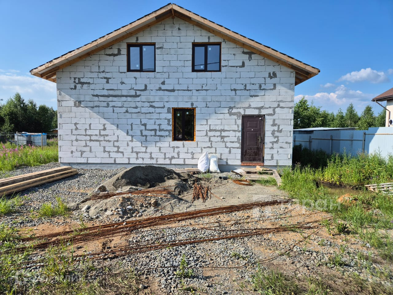 Дом закончен на 90%, второй этаж пока свободной планировки, стены отштукатурены, произведена стяжка пола под ламинат или линолеум, проведена вода своя скважина 60 метров, канализация на три кольца септик, отопление теплые полы, установлены окна, крыша металлочерепица