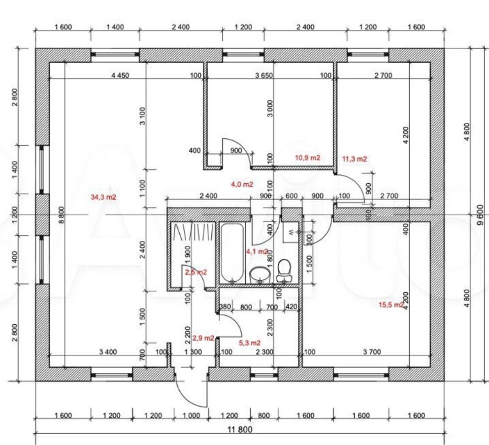 Общей площадью 96м2 + 13м2 крытая терраса, в 1ин этаж: прихожая 2.9м2; котельная 5.3м2; кухня-гостиная 34.3м2 с высотой потолков в 4.2м и с выходом на террасу во внутренний двор; 3и отдельные спальни 15.5, 11.3 и 10.9м2; ванная комната с с/у 4.1м2.