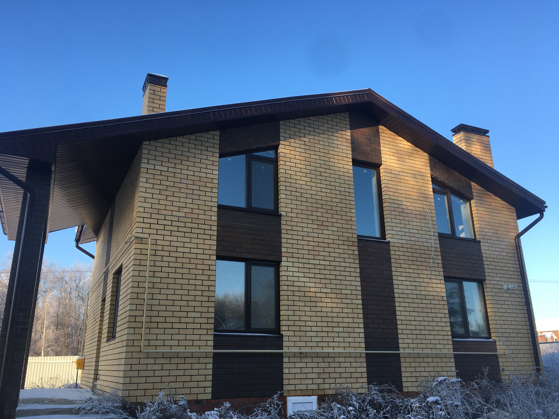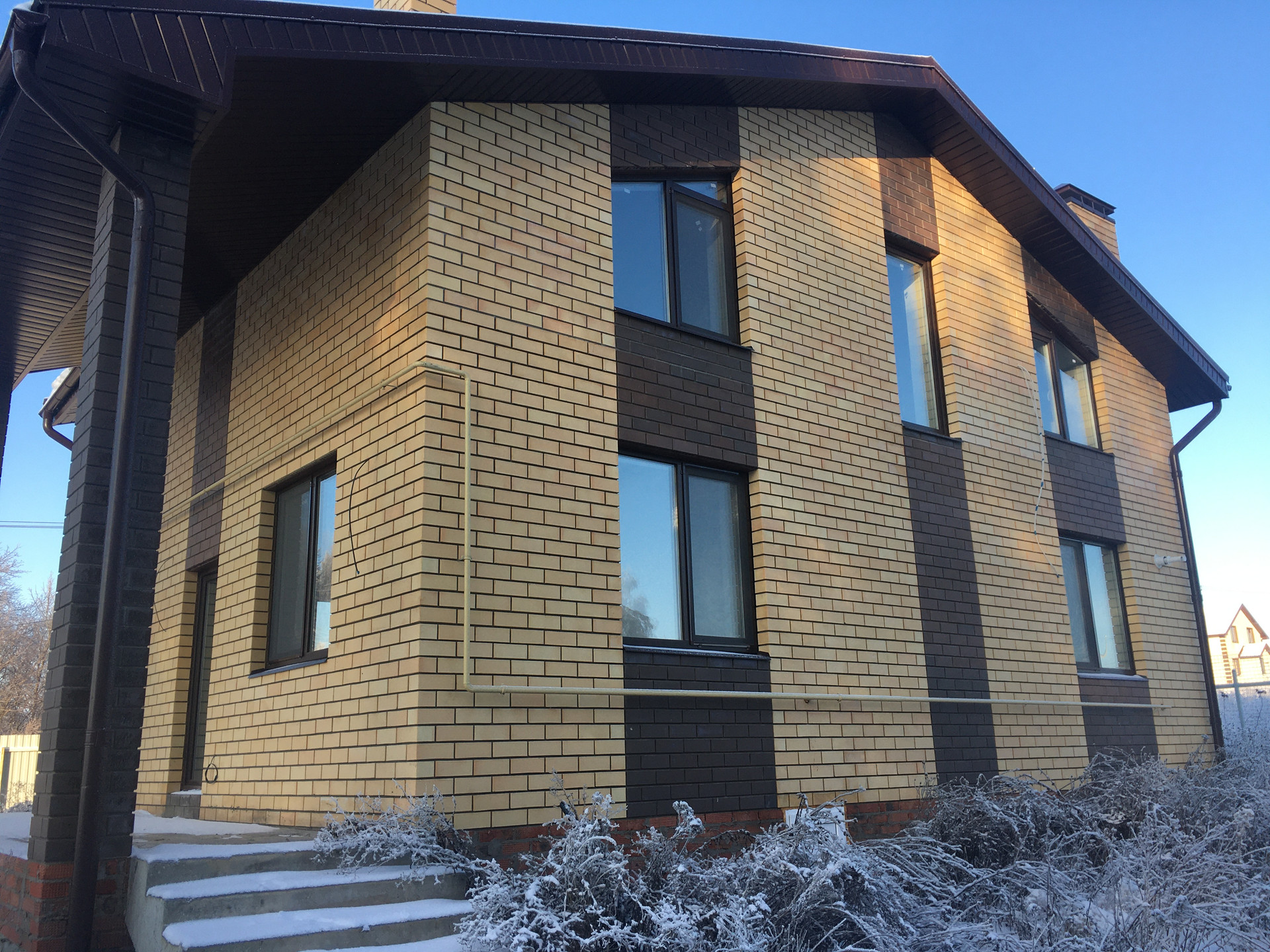 Дом построен из качественного материала. Несущие стены из керамических блоков толщиной 250 мм, с утеплением толщиной 130 мм. с облицовкой лицевым одинарным кирпичом 120 мм. Внутренние стены и перегородки 1 и 2 этажей из полнотелого кирпича. Высота потолков:1 этаж - 2,8м,2 этаж - 2,7м.