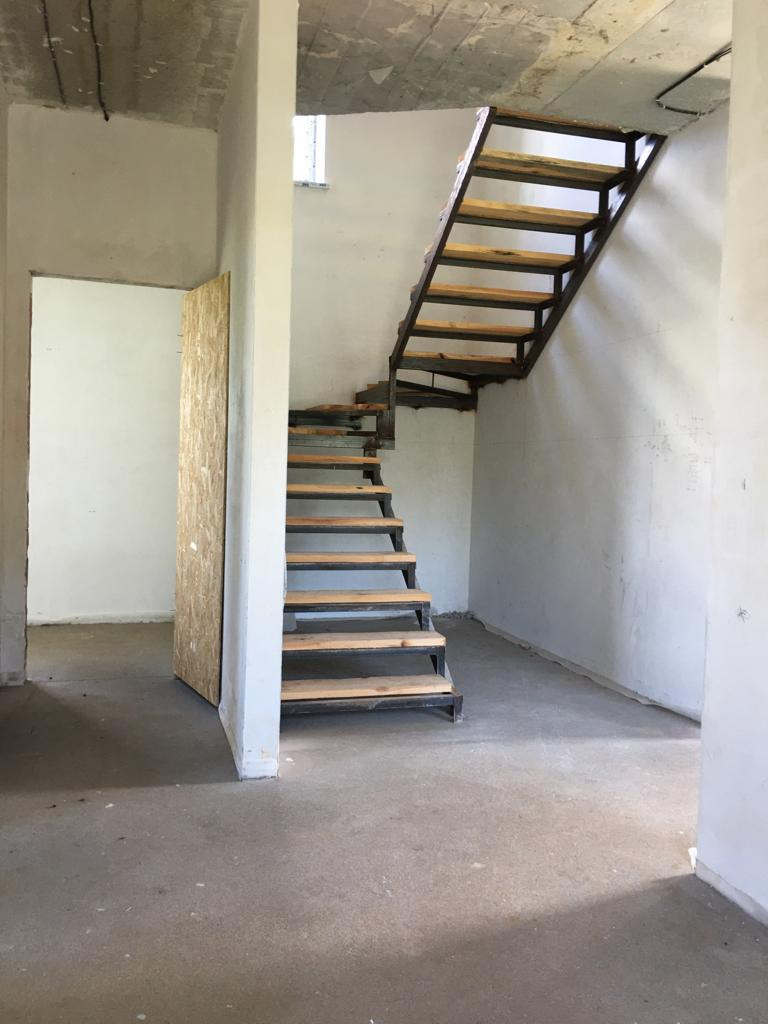 На первом этаже расположены: тамбур, холл, ванная, спальня, гостиная -кухня-столовая, котельная. Гостиная -25,55кв.м., спальня-10,16кв.м.
