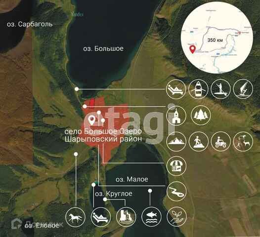Земельный участок, имеет выход на берег озера,можно выходить через собственный пантон. Можно использовать под бизнес. Участок можно размежевать на несколько меньших. Вокруг села находятся пять чистейших и самых красивых озер Красноярского края: среди них озеро Круглое, Еловое, Сарбаголь, Мало Комиссия на покупку данного типа недвижимости: