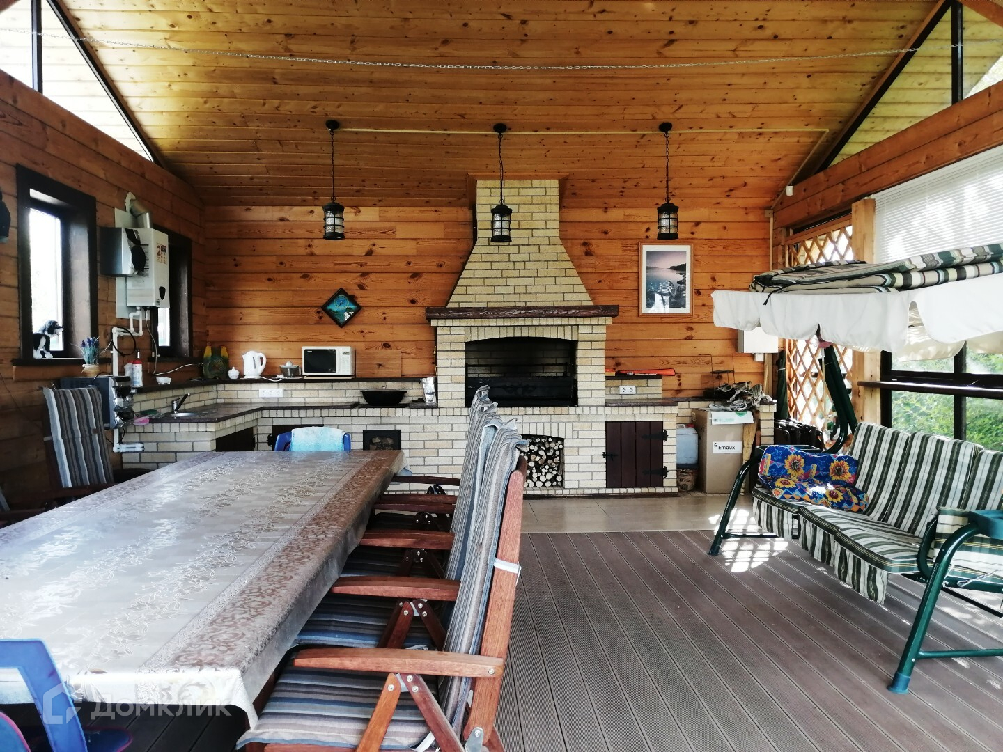 Беседка оформлена, как жилое строение, с кухней, зоной отдыха, камином. На улице стоит тандыр , так же на участке есть зона отдыха с лавочками и фонтанчиком. На участке хвойные насаждения , газон , много различных насаждений плодовых, все было посажено с душой , остальное выложено тротуарными плитками .