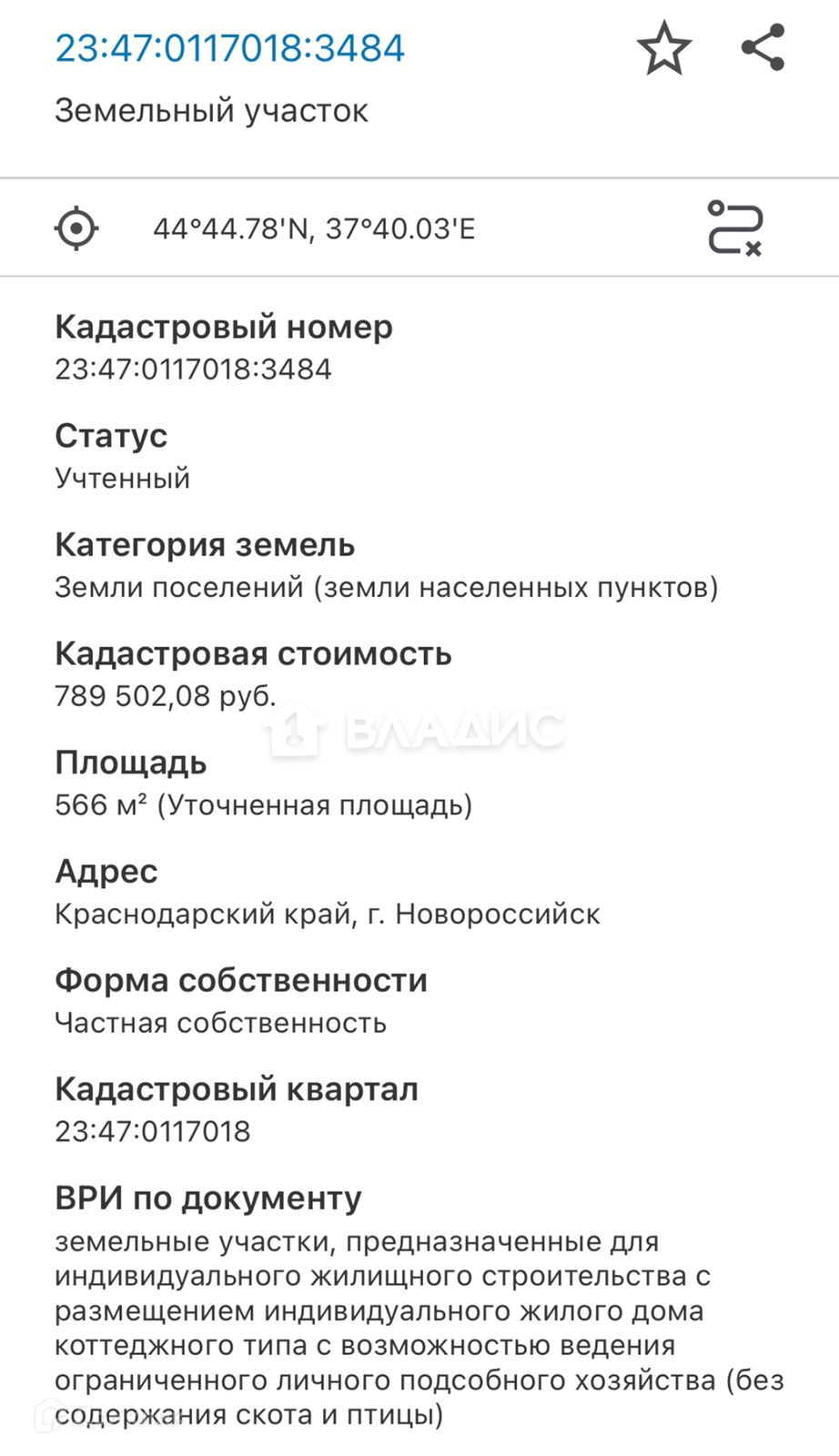 ● Кадастровый номер - 23:47:0117018:3484