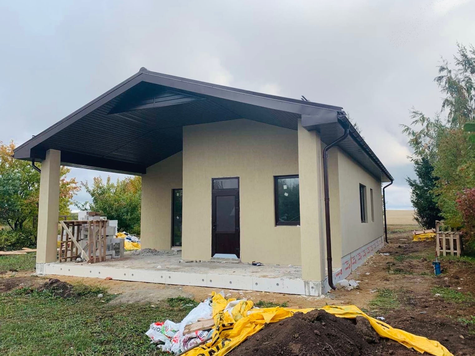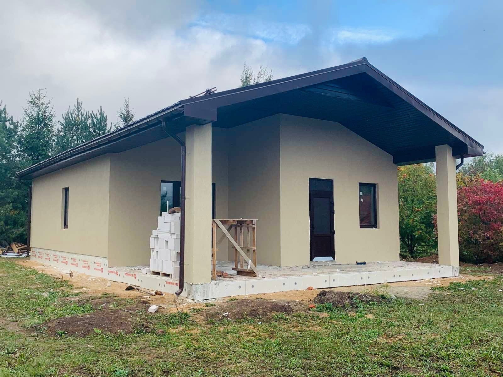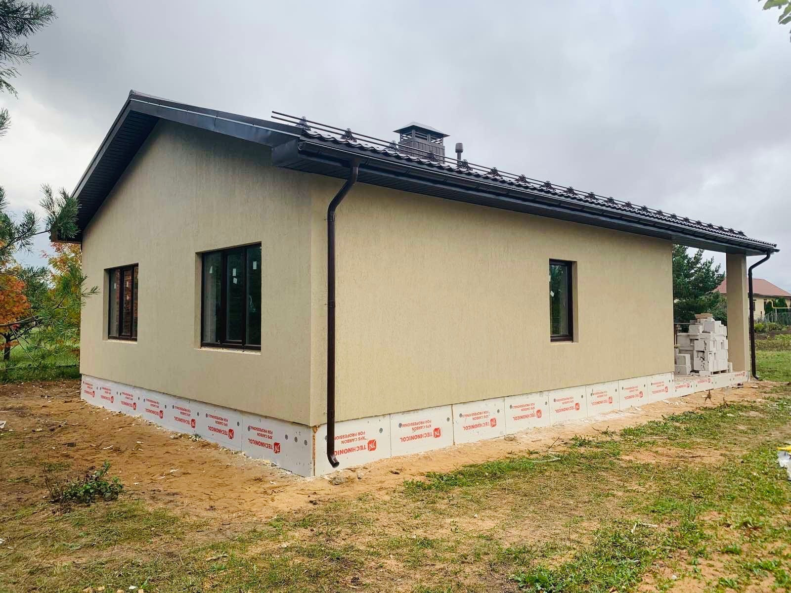 Фундамент - монолитная плита, стены - газобетонный блок Ютонг 375 мм, кровля - металлочерепица.
