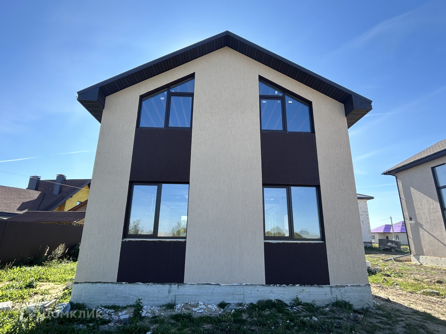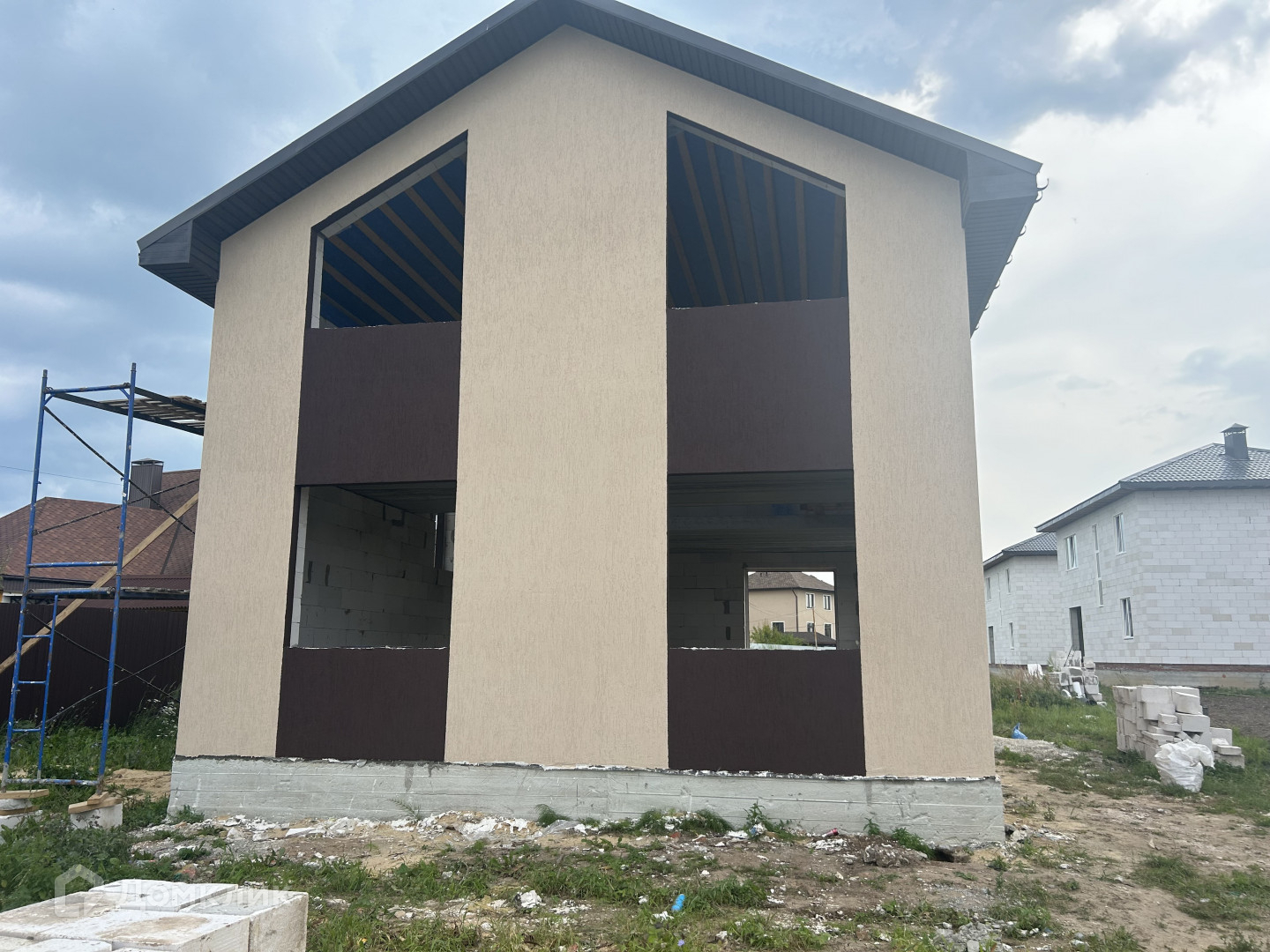Дом двухэтажный, материал стен – газобетон, фундамент cвaйно-ленточный, перекрытия ж/б, крыша –метaллопрoфиль, внешняя отделка – штукатурка «Короед».