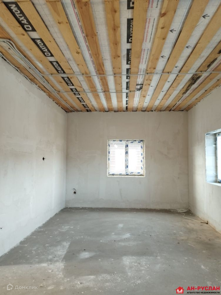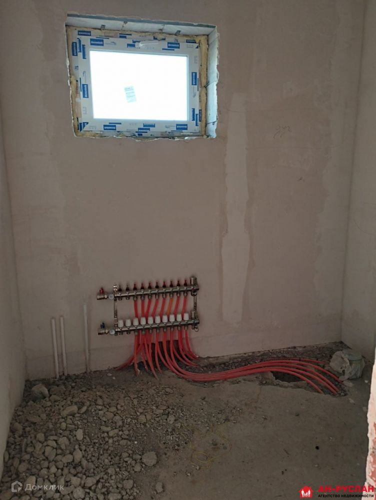 Стены в доме выровнены под маяк при помощи машинной штукатурки, сделана разводка тёплого пола на который уложена полусухая стяжка, установлены окна пластиковые и входная дверь.Сделана вся разводка коммуникаций (электричество, канализация, вода). .