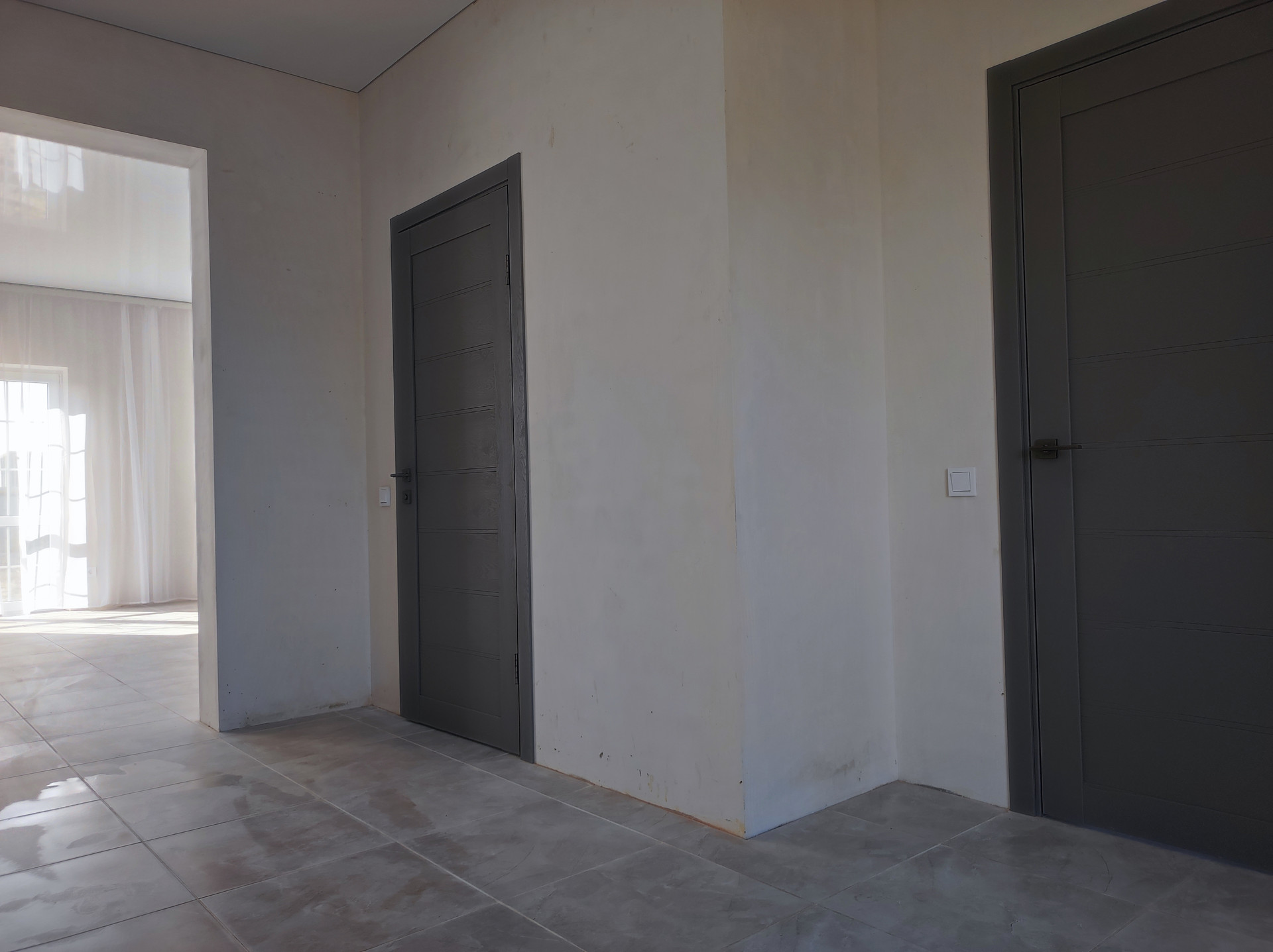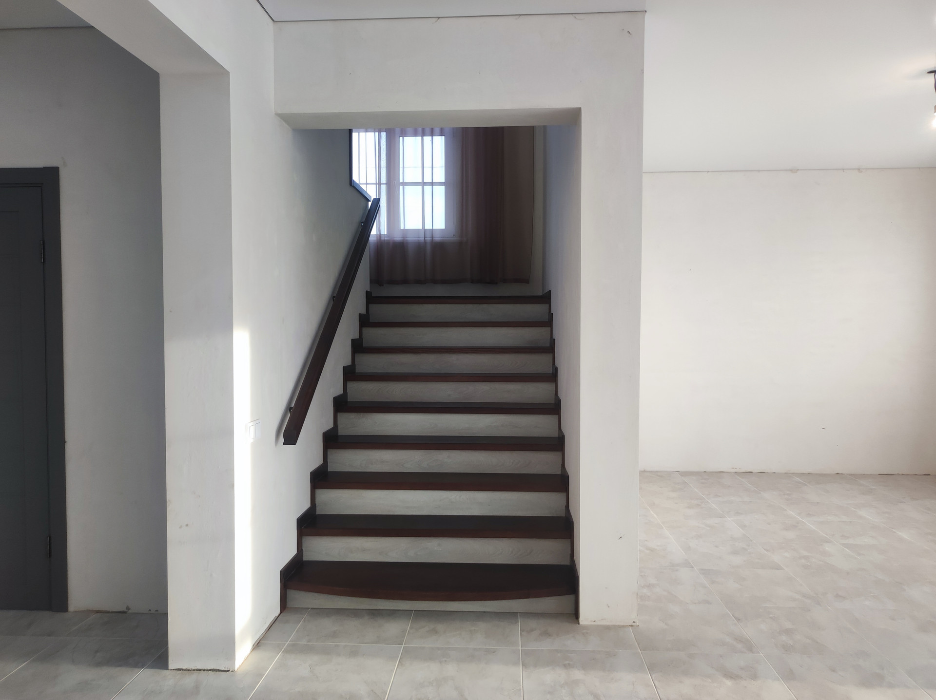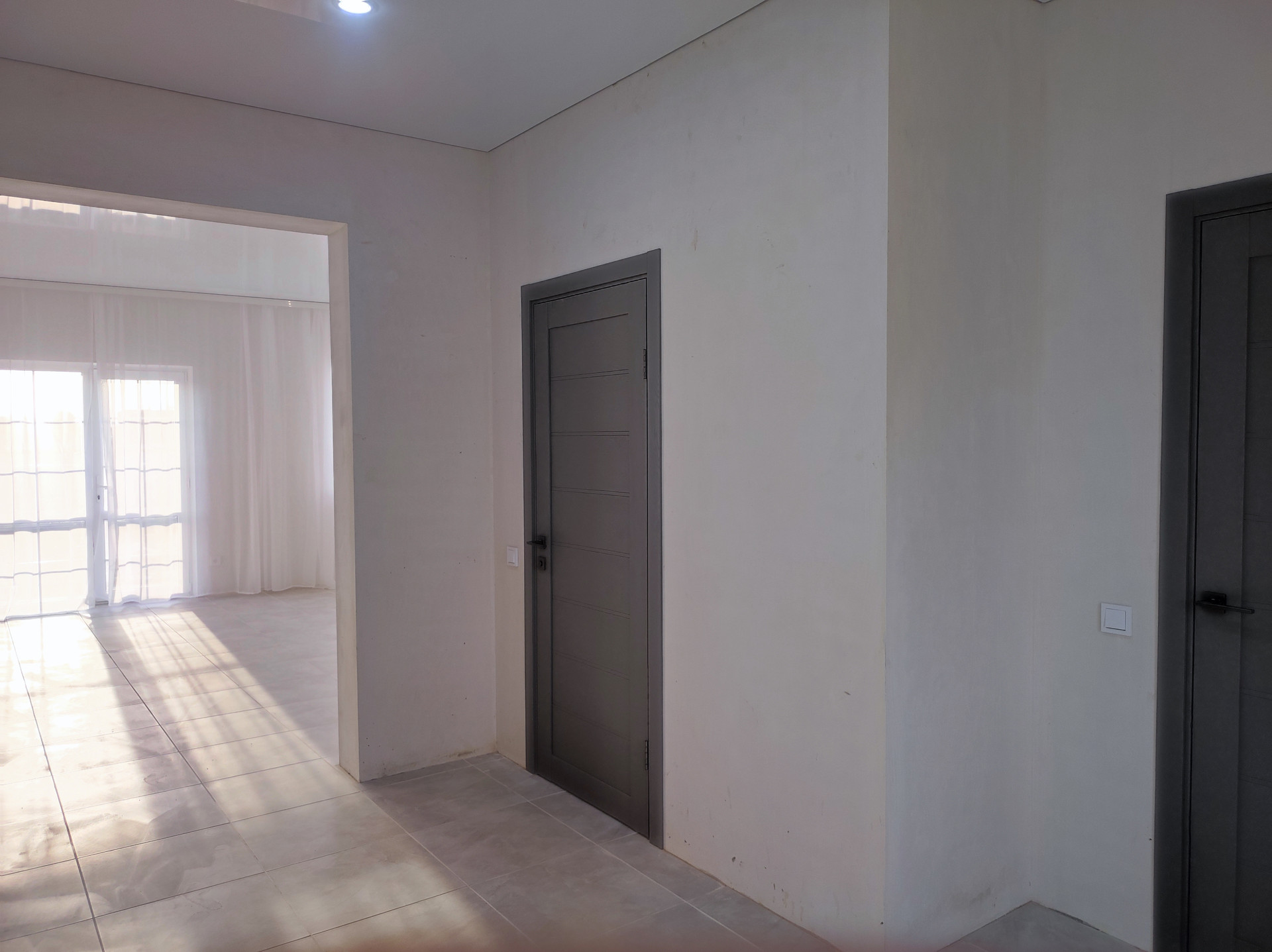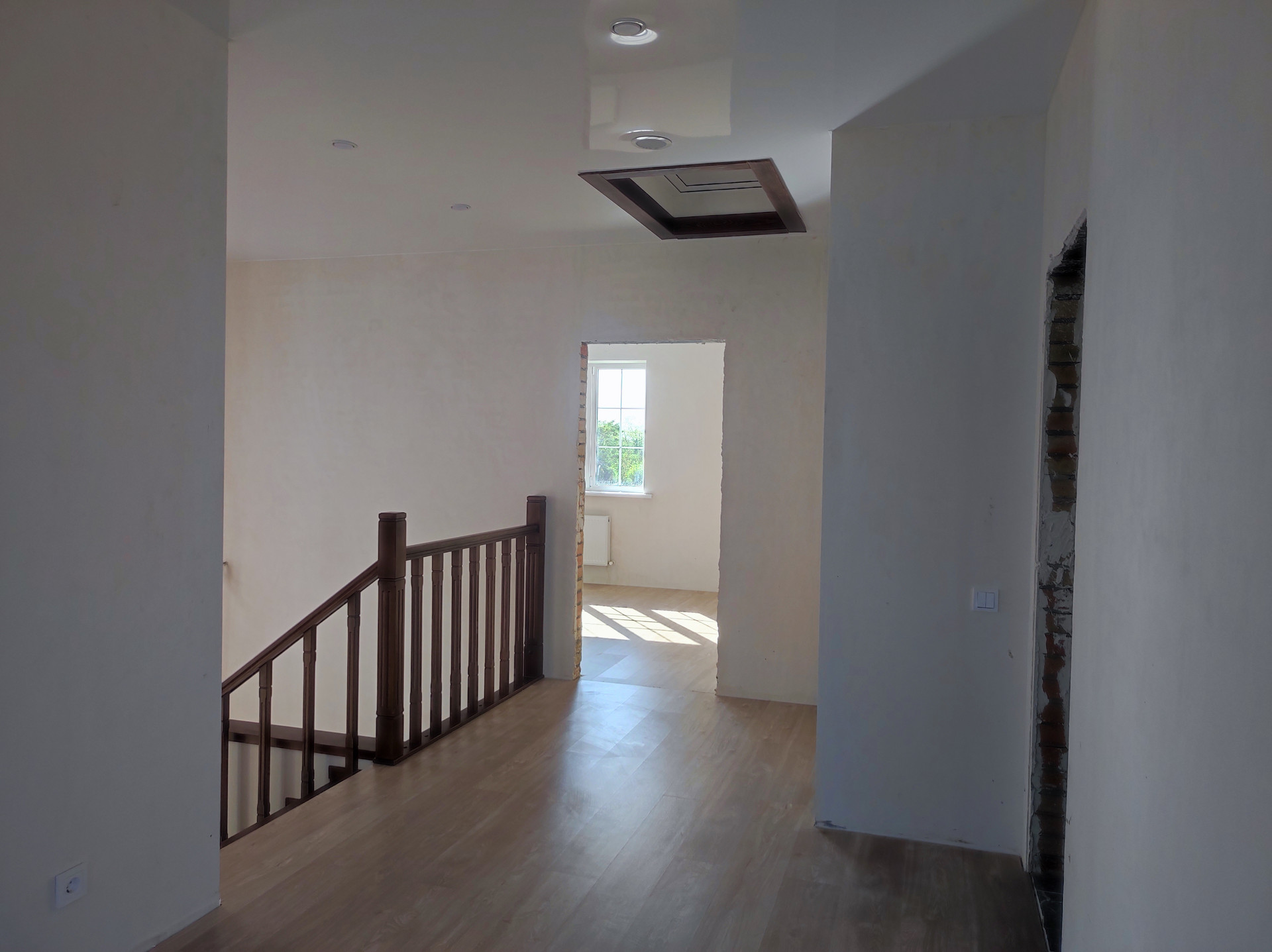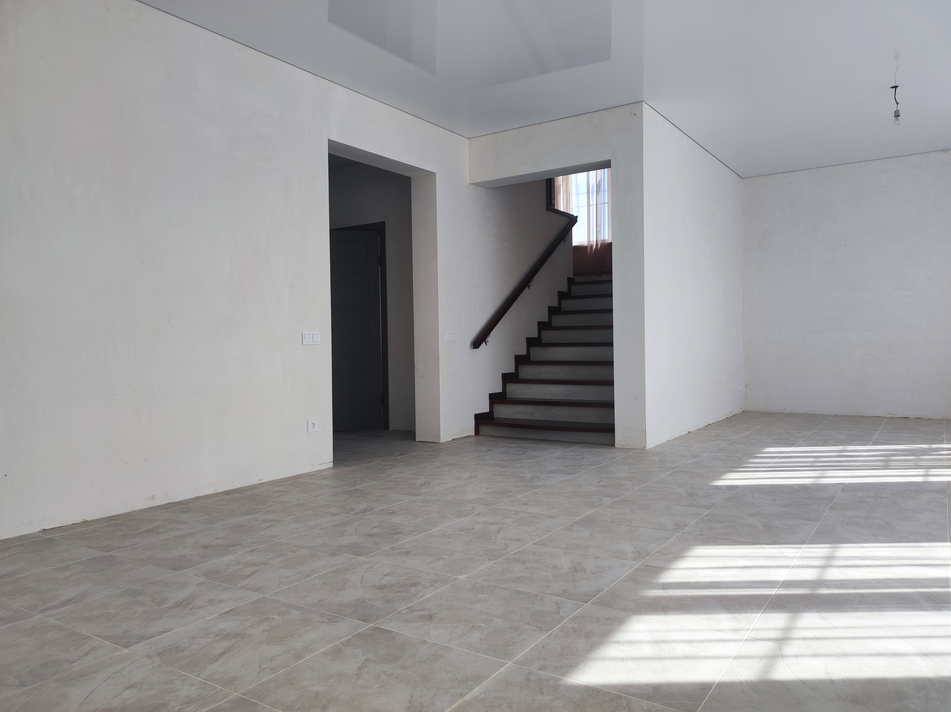 Сделан ремонт: полы керамогранит с подогревом на первом этаже, ламинат на втором, натяжные потолки, установлены сантехника и двери.