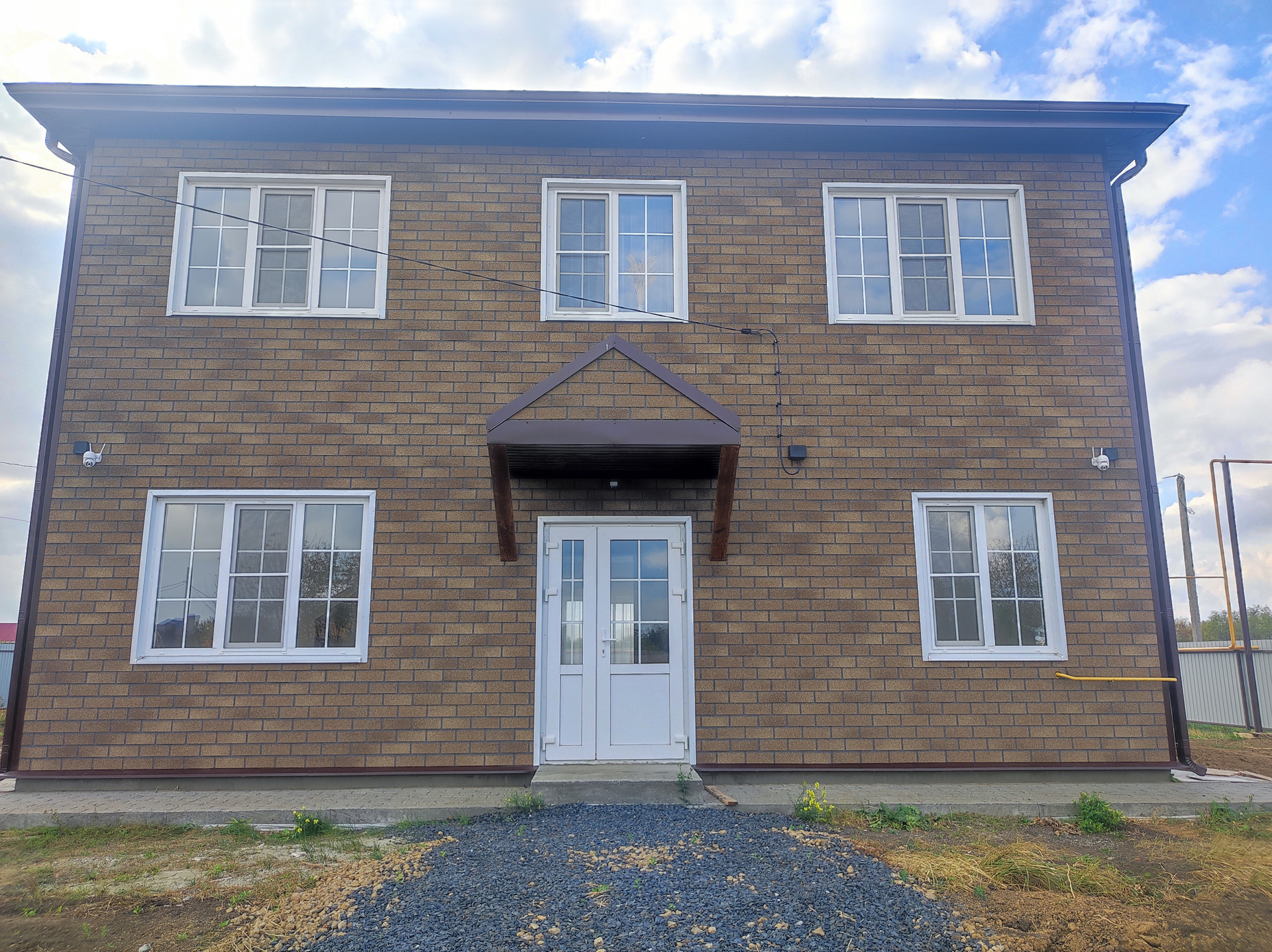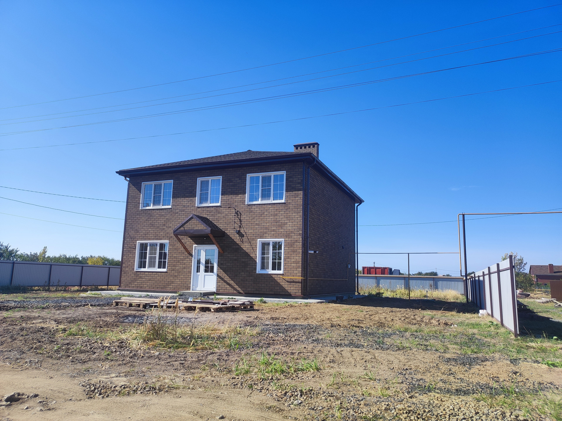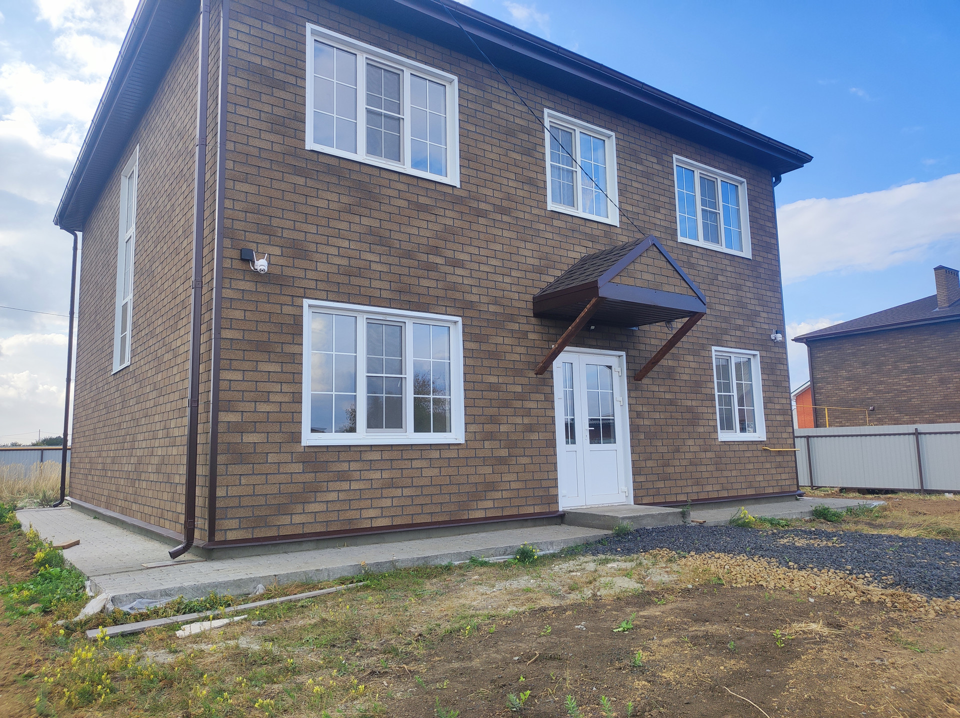 Дом кирпичный , внешняя отделка и утепление Хауберг , бетонные перекрытия и перемычки, кровля - двухслойная черепица "Ранчо" , подключены свет, вода,интернет , канализация, отопление и газ. Вокруг дома сделана отмостка, периметр огорожен забором. Видеонаблюдение