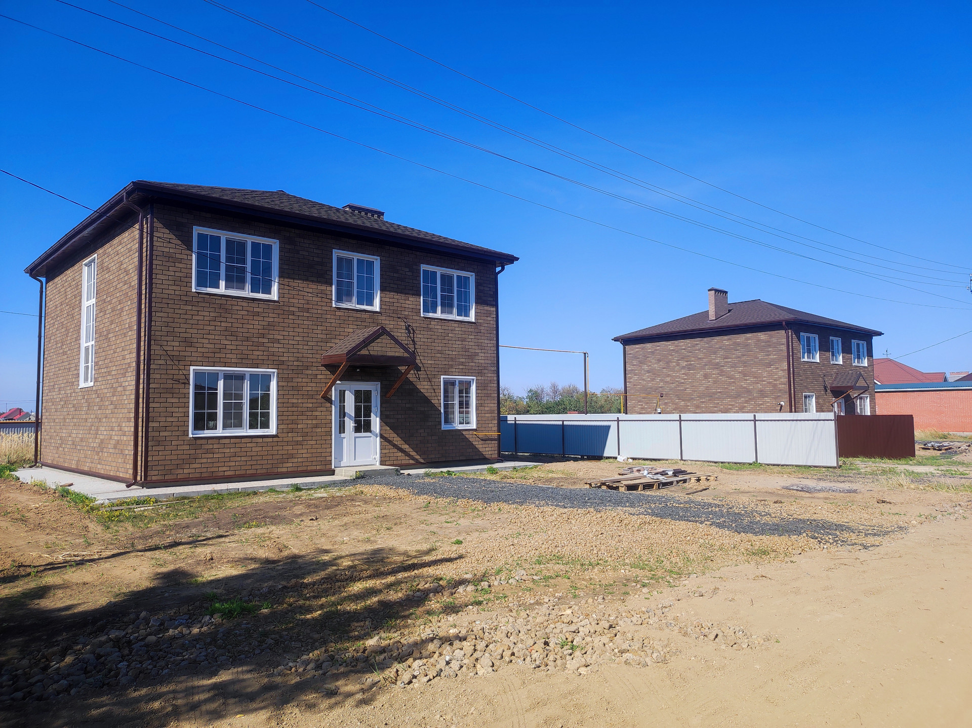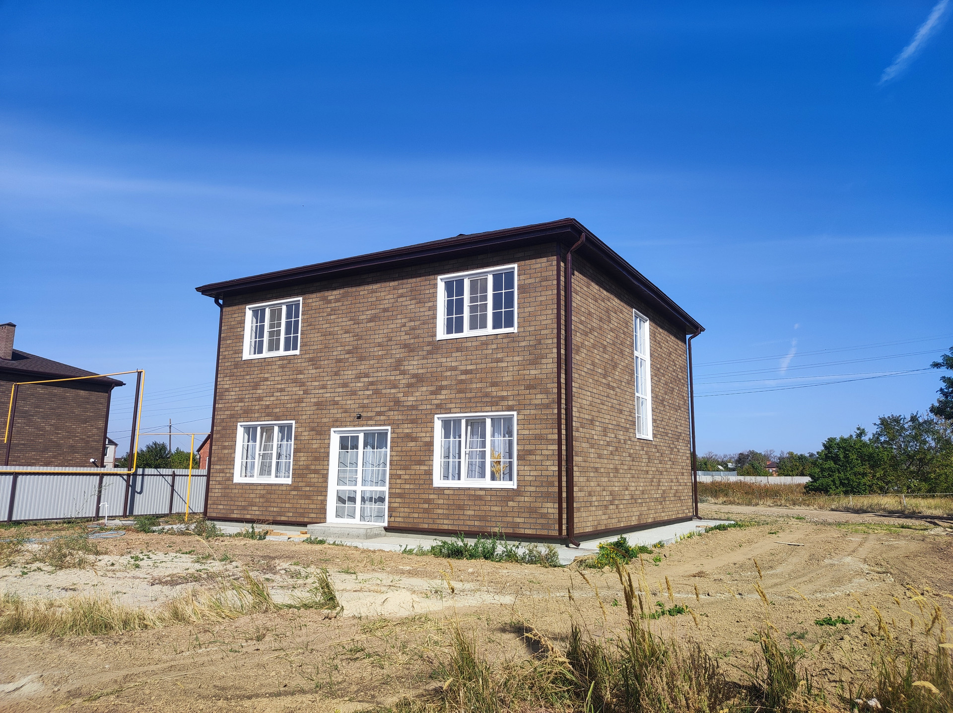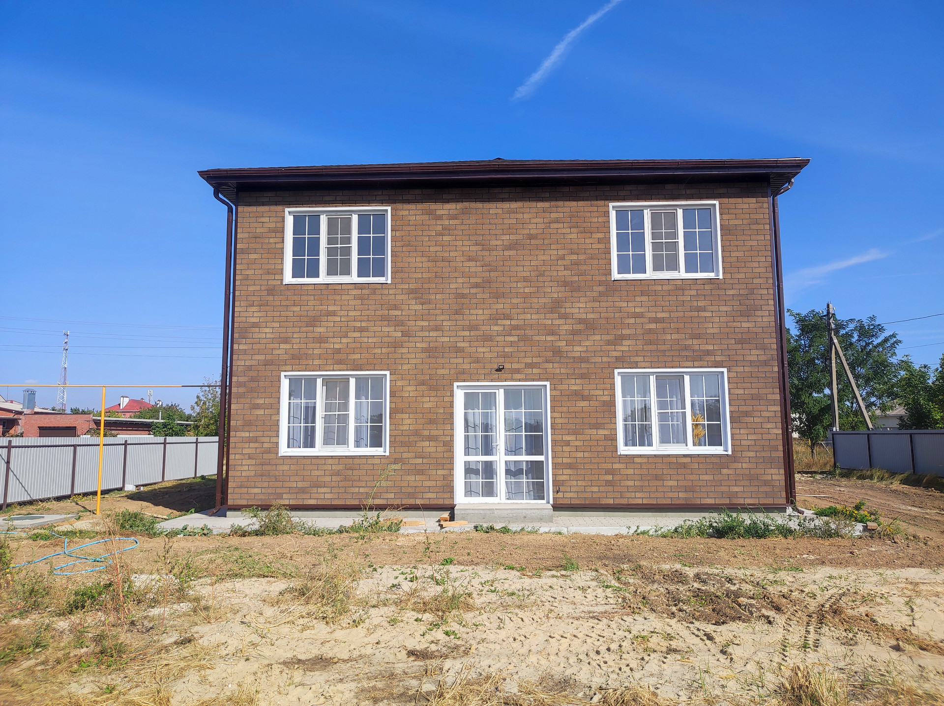 Дом кирпичный , внешняя отделка и утепление Хауберг , бетонные перекрытия и перемычки, кровля - двухслойная черепица "Ранчо" , подключены свет, вода,интернет , канализация, отопление и газ. Вокруг дома сделана отмостка, периметр огорожен забором. Видеонаблюдение