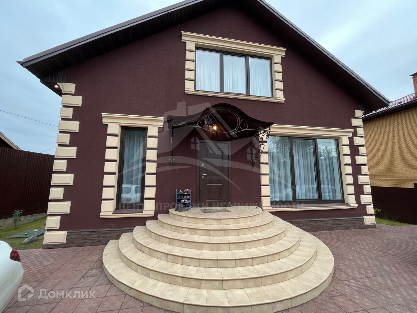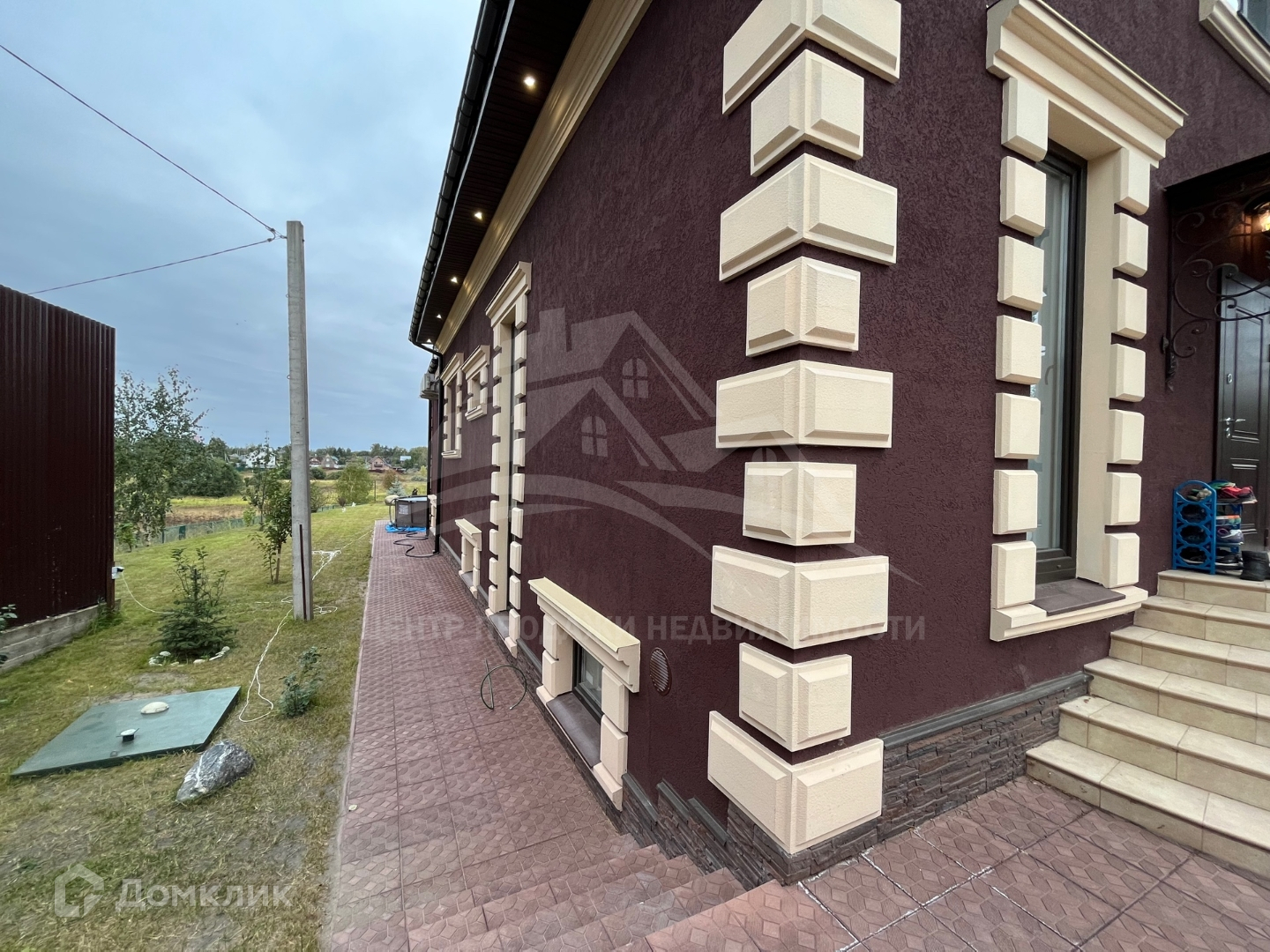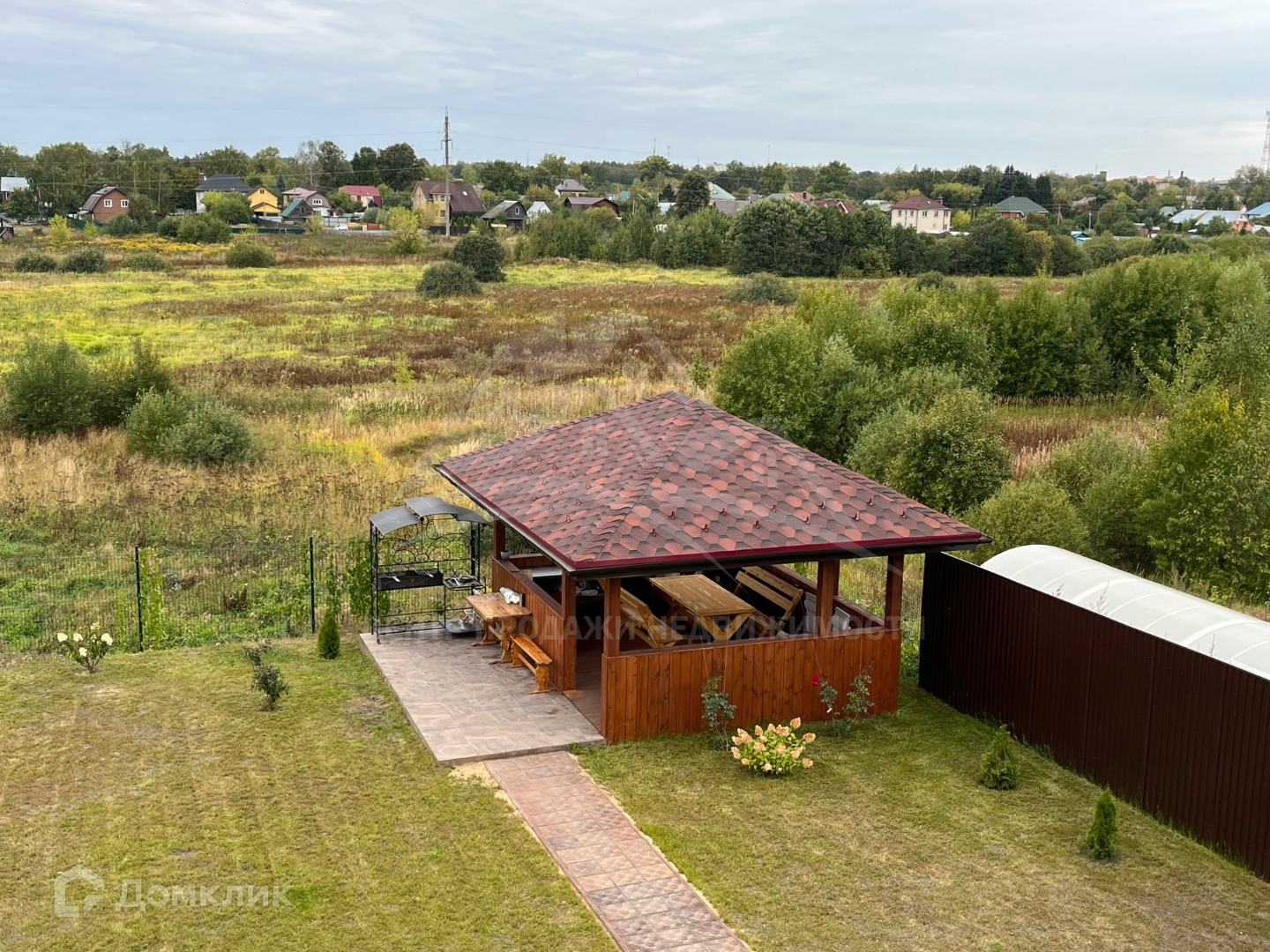 Преддомовая территория также полностью облагорожена: автоматические откатные ворота в цвет фасада дома, удобный заезд и парковка на 4 машины, выложены дорожки из дорогой плитки, установлена уютная беседка из дерева, где в любое время года можно собираться с родственниками и друзьями для прекрасного времяпрепровождения, по всей территории высажены благородные голубые ели, плодово-ягодные кустарники и деревья.