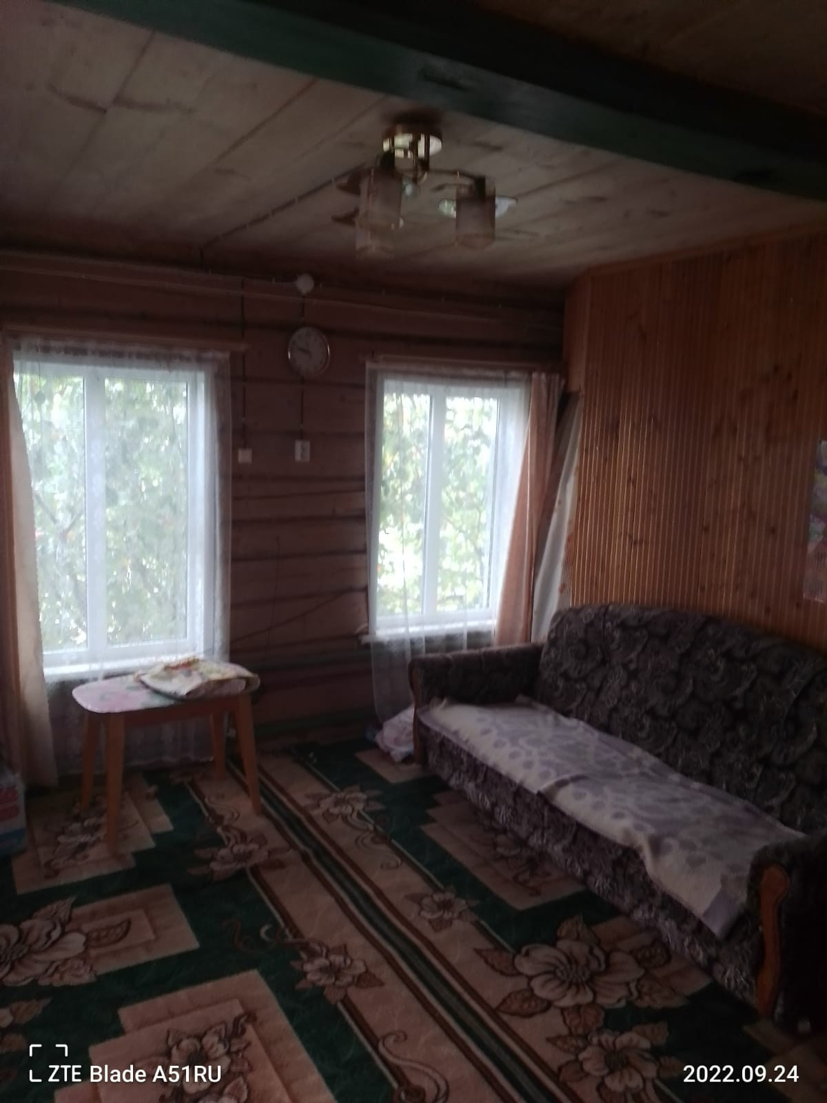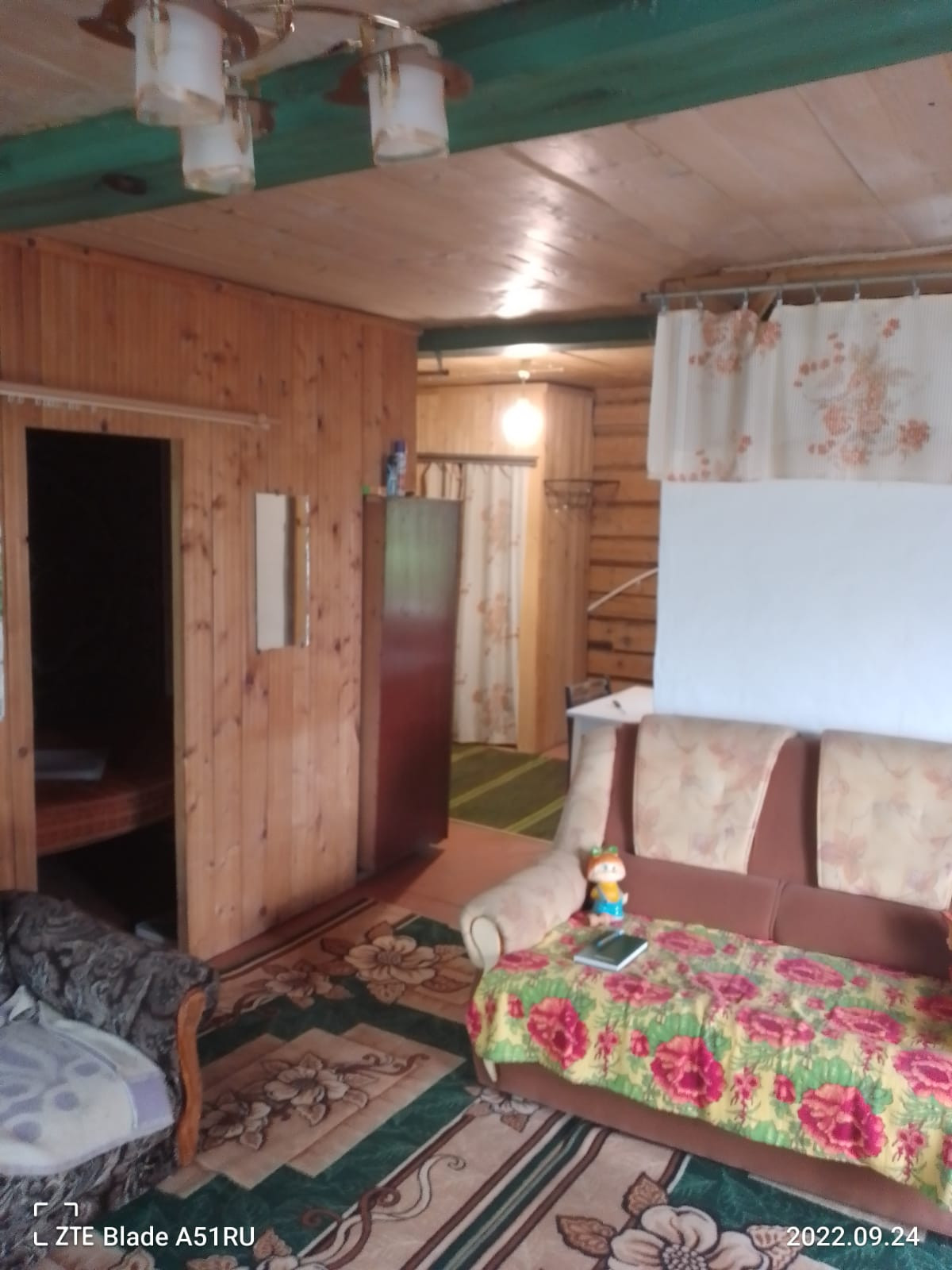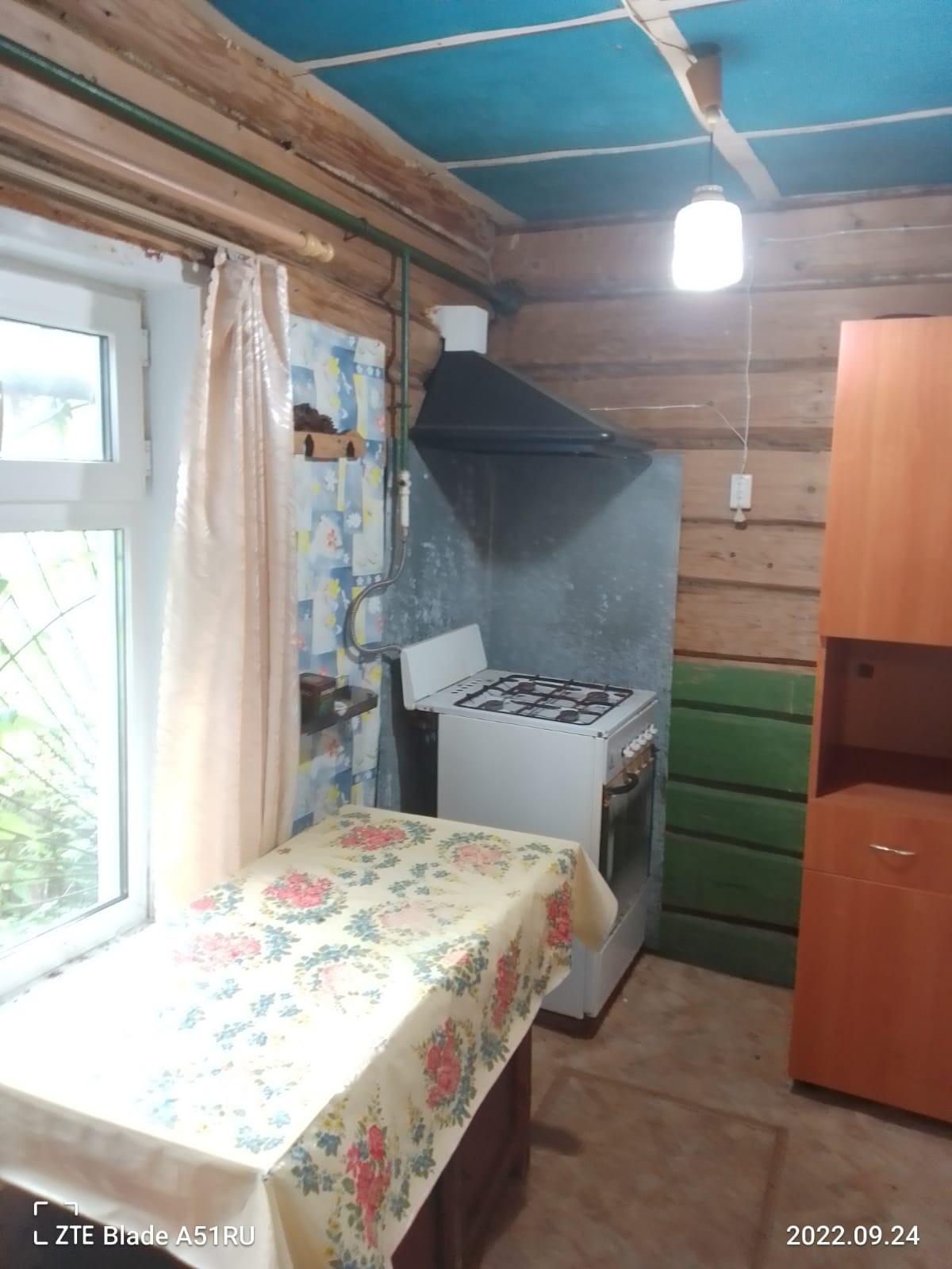 Дом стоит на возвышенности, деревянный дом обшит досками, кровля шифер.