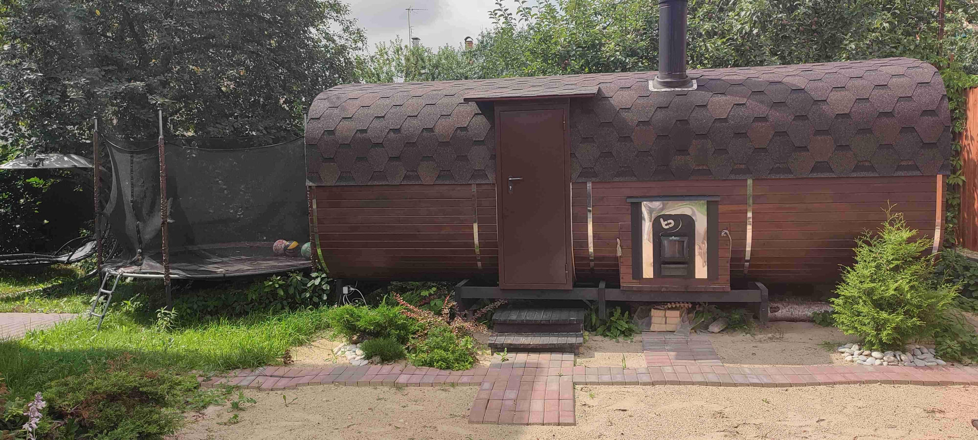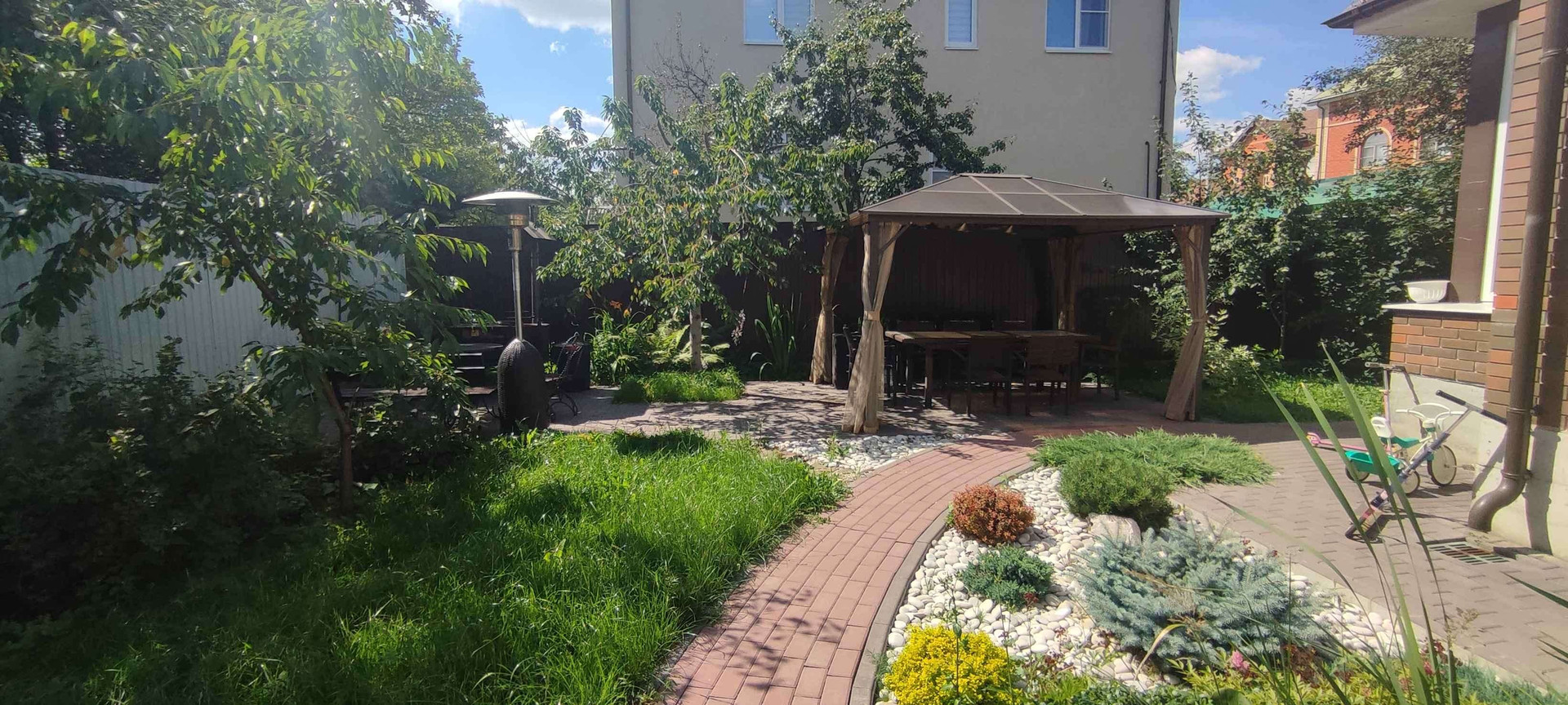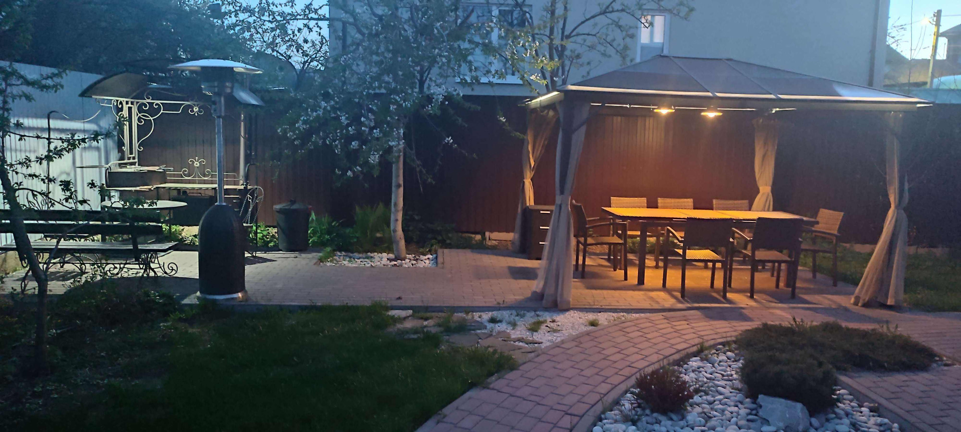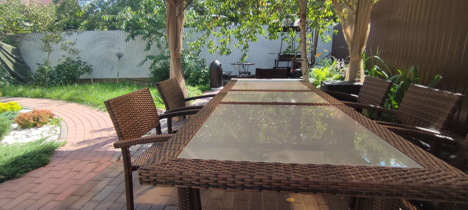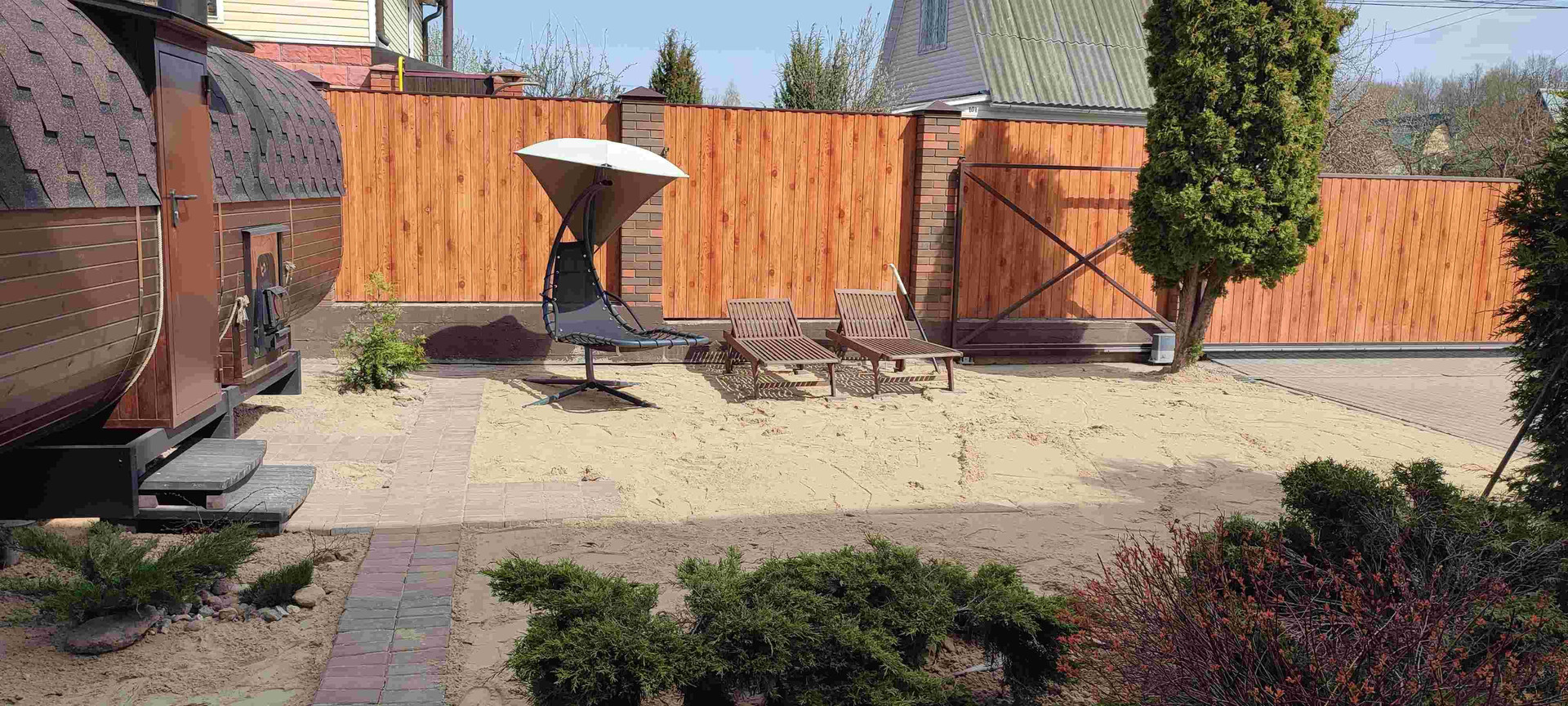 Беседка с мебелью (раскладной стол на 8 человек из стекла и ротанга + стулья из ротанга), уличный газовый обогреватель (гриб), лавочка со столом и стульями у мангала, лежак/качели, 10 ft батут с сеткой и зона с песком и лежаками.