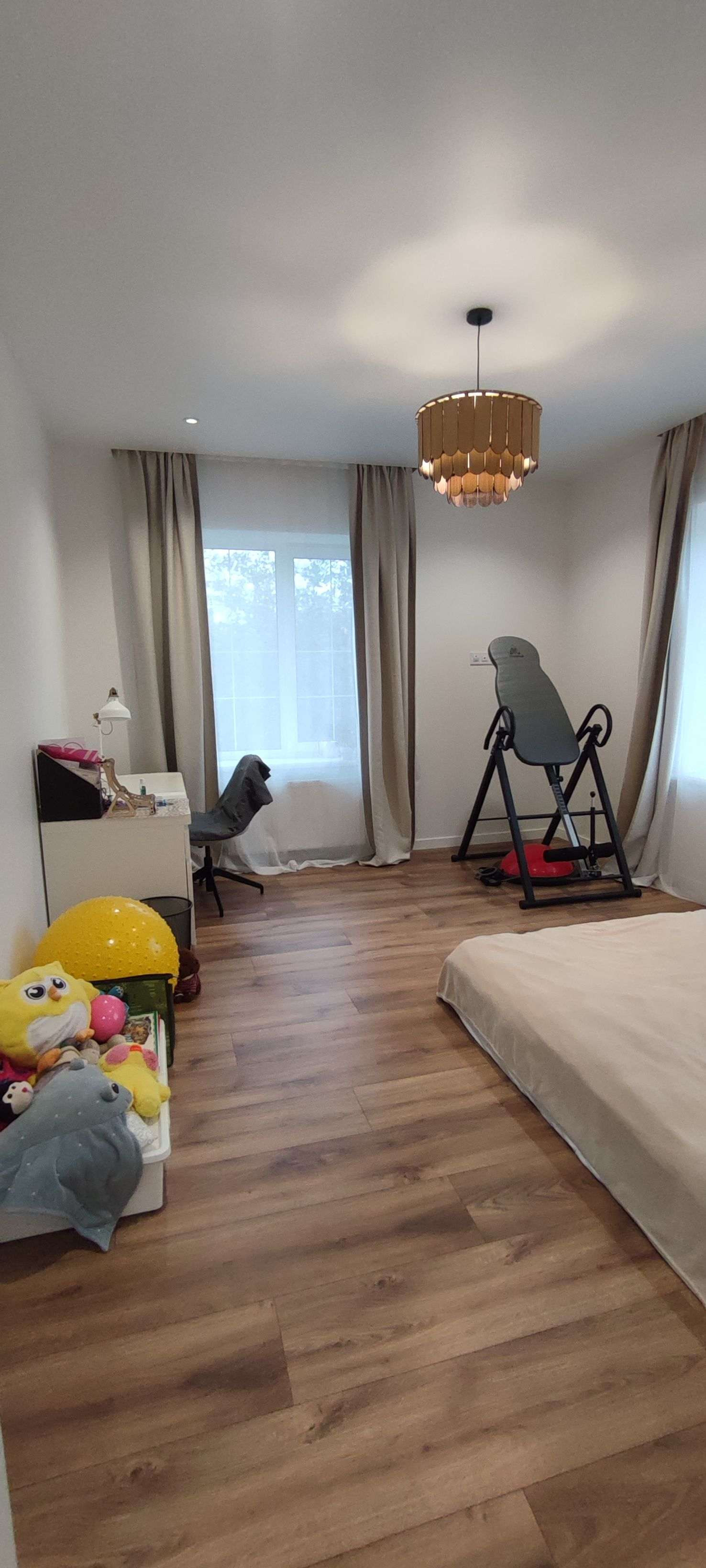 В доме на 1 этаже бойлерная, туалет, гостиная с кухней, спальная комната, лестница на 2 этаж. На 2 этаже 3 комнаты, ванная комната, 2 гардеробные и выход на чердак. Дом полностью оборудован всем необходимым, включая всю технику, домашний кинотеатр с проектором и полотном, PS4, большая блютуз колонка, светомузыка, робот пылесос, инверсионный и эллиптический тренажёр, турник, боксерская груша, массажный стол, спортинвентарь в огромном ассортименте, мебель, посуда и т.д. и т.п. Все́ перечислить нет возможности, здесь ограничение в тексте. Все́ что видите на видео, все сдае́тся с домом.