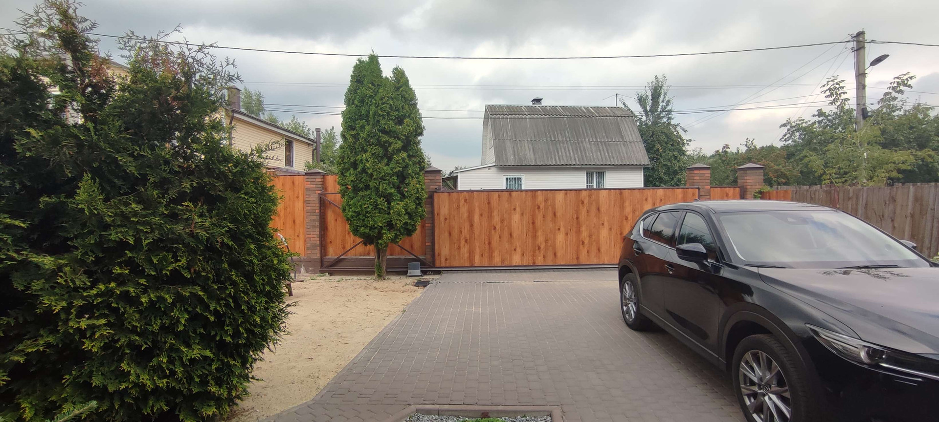 Въезд на территорию осуществляется с пульта через 5 м автоматические ворота или пеший вход через калитку. При въезде стоянка из брусчатки на 3 машины.